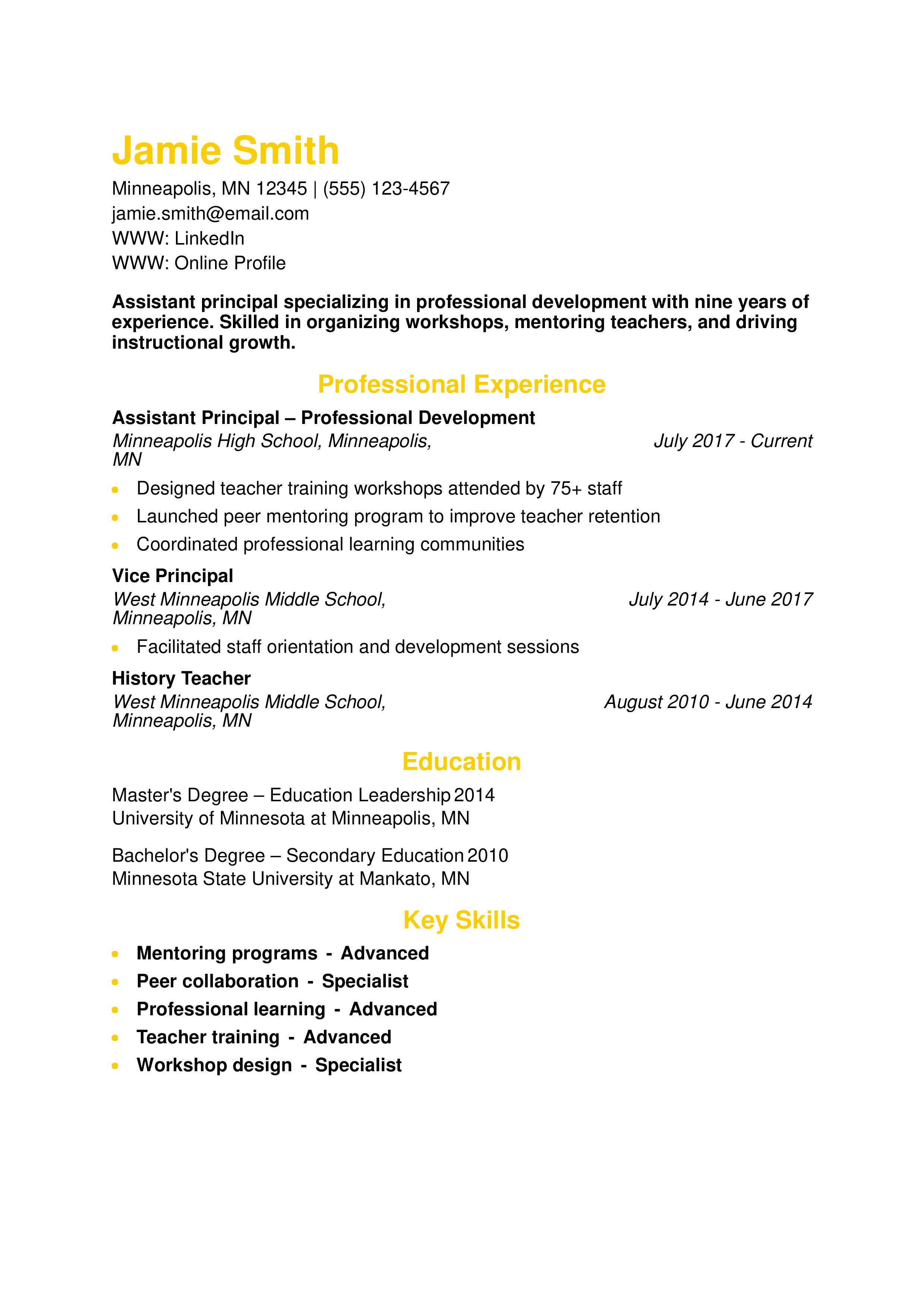 Yes, using an Assistant Principal resume example can provide guidance on structuring your resume, even if you’re at the beginning of your career. Focus on your internships, education, and skills that are transferable to the job you want. A strong entry-level resume example will highlight your potential and willingness to learn, making your limited experience a benefit.
