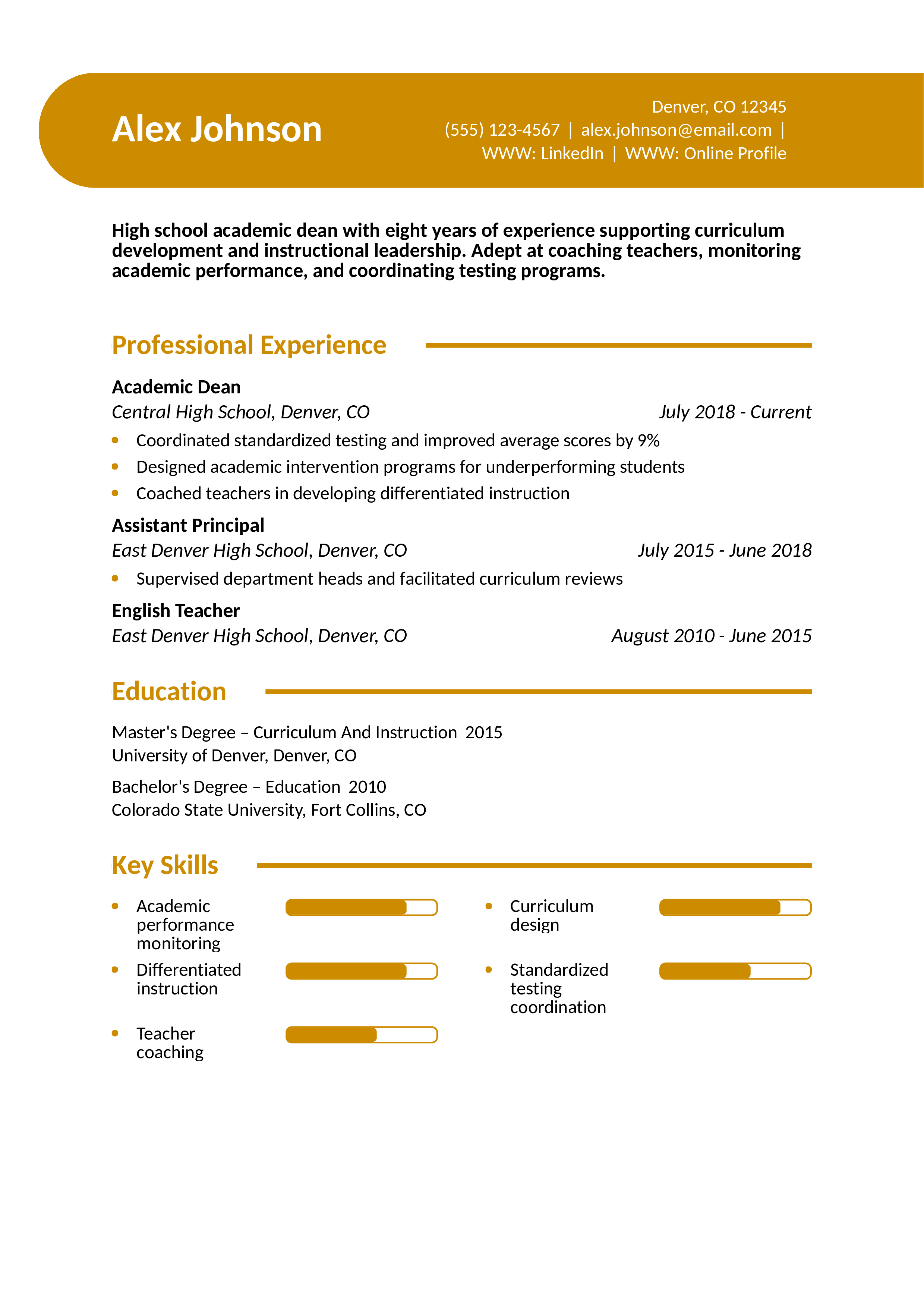 This resume works well because it shows experience both in teaching and administration, with specific achievements in policy updates and student support. A reverse-chronological format ensures recent accomplishments stand out. You can learn more about why format matters in best resume formats.
