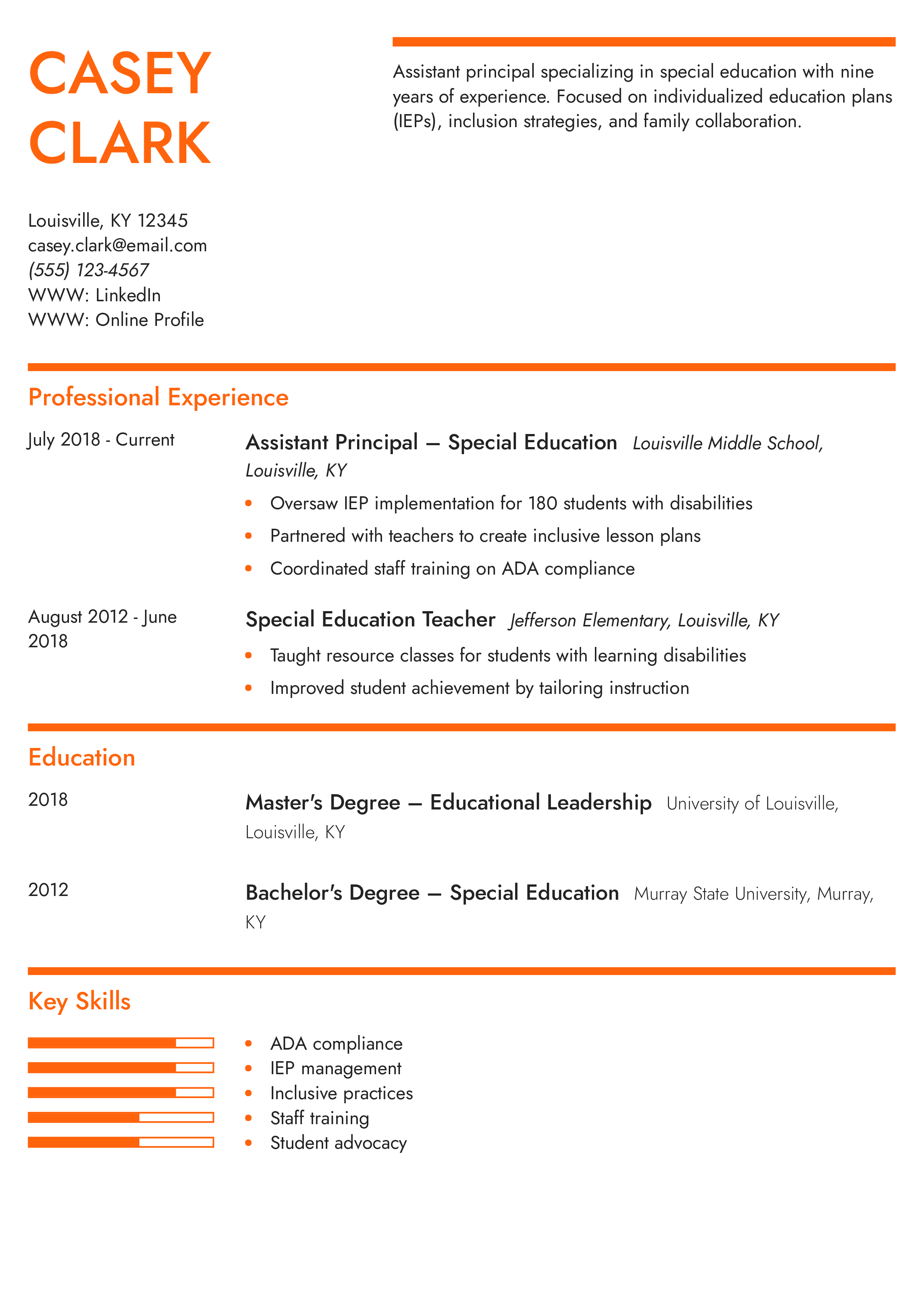 This resume is strong because it shows a clear specialization in special education leadership with measurable oversight. To better showcase certifications or endorsements, see how to list certifications on a resume.