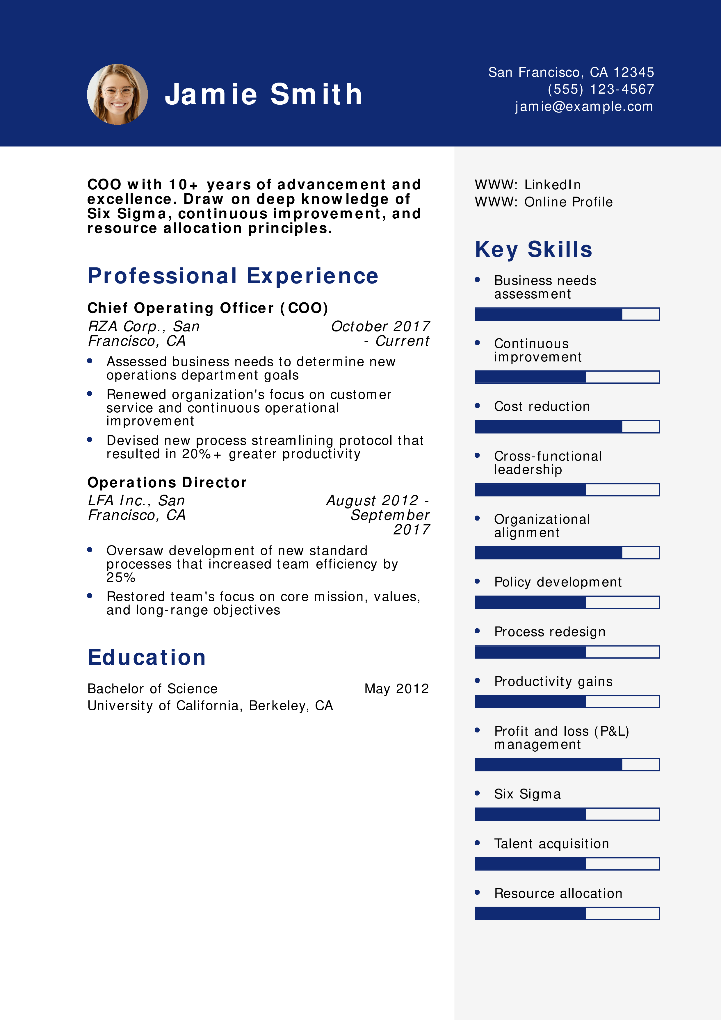 This guide provides specific tips for every part of your resume. It also offers guidance about the types of skills and action verbs you might include and what templates are best for COO resumes.