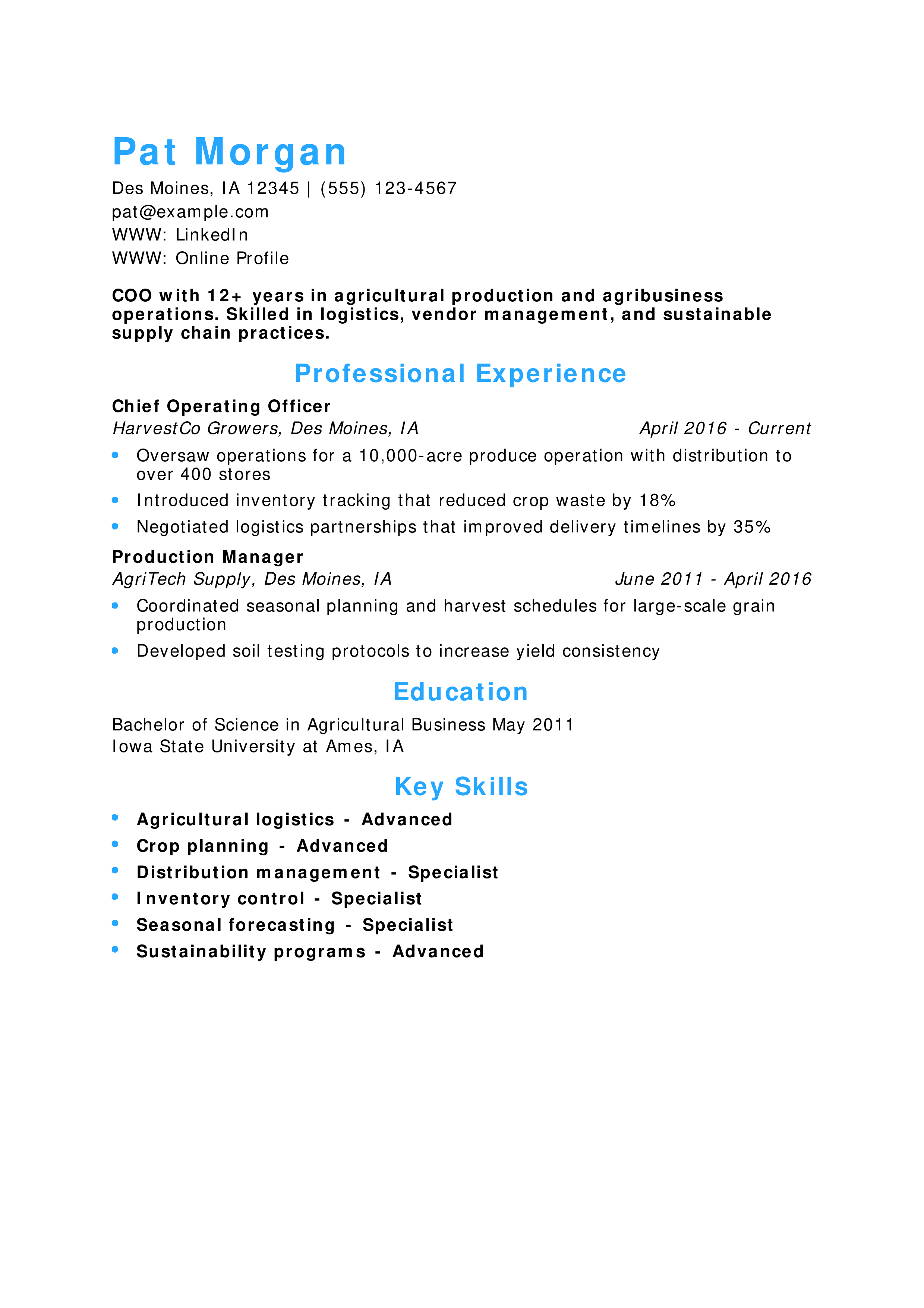 This resume presents agricultural leadership with strong logistical and sustainability metrics. It’s ideal for rural operations or agribusiness leadership. For help listing related certifications, visit this certifications guide.