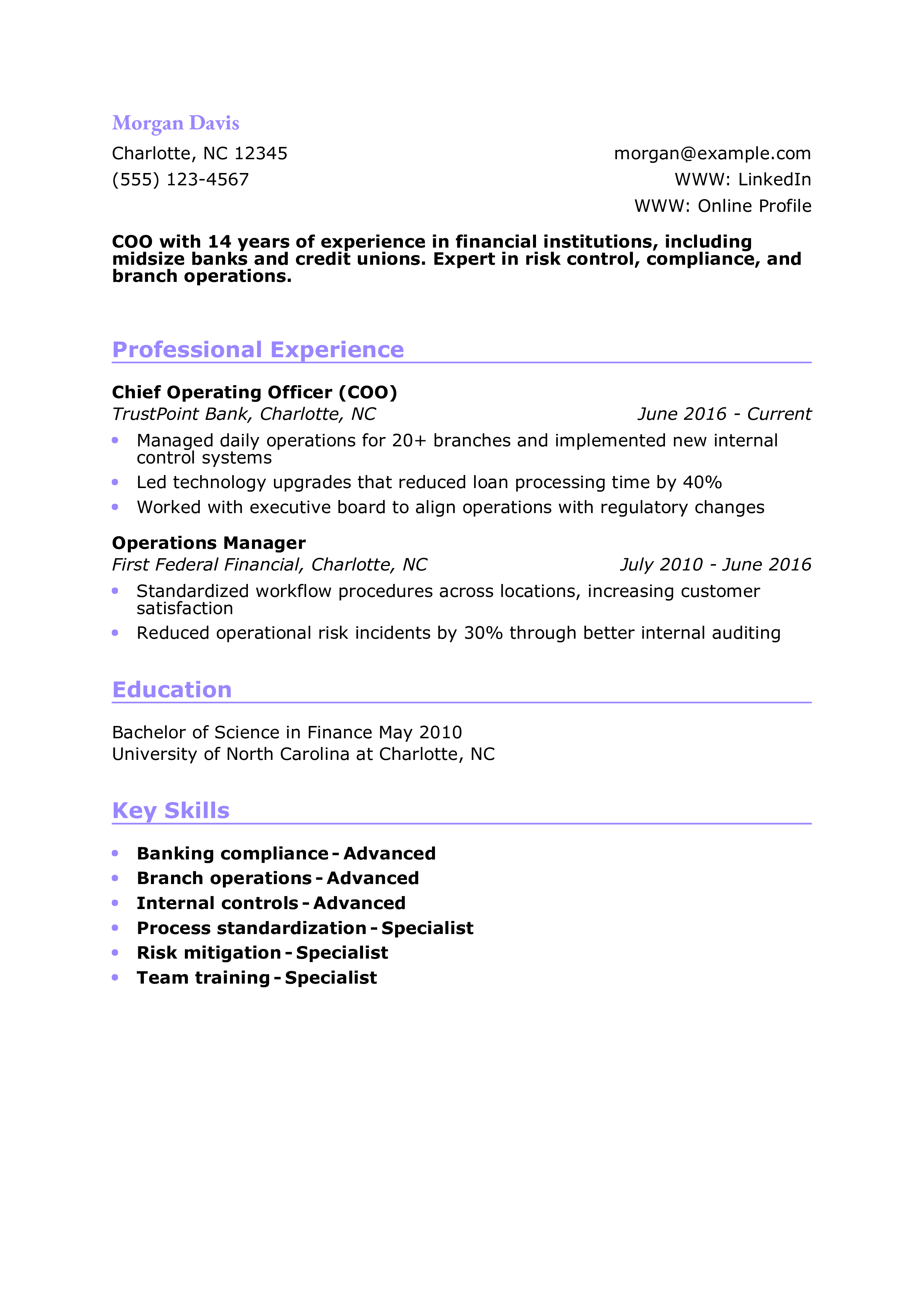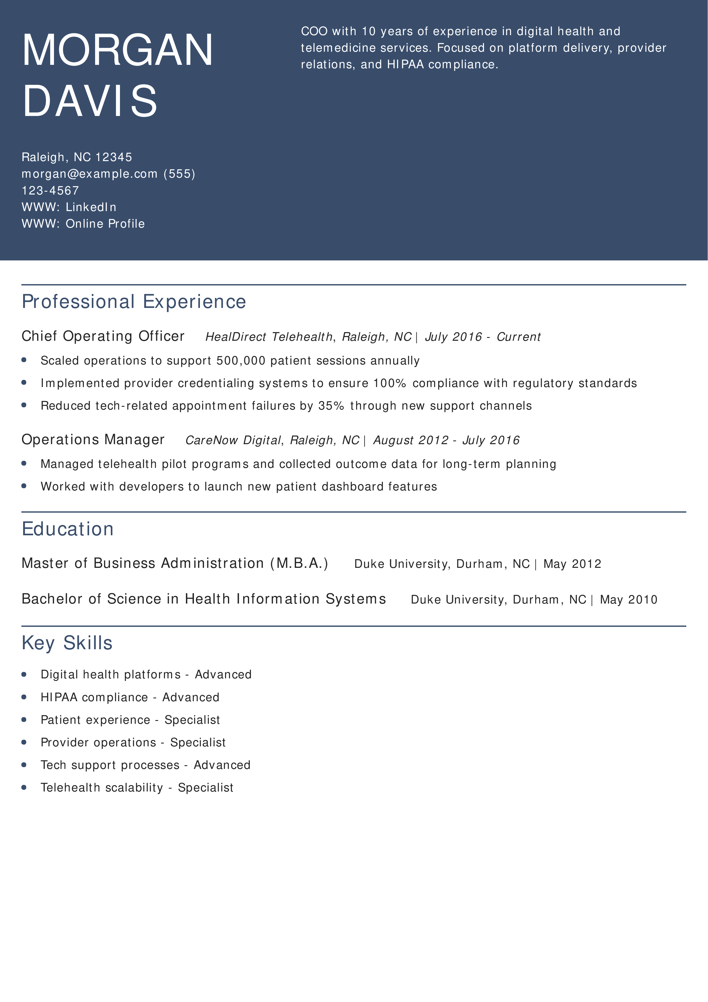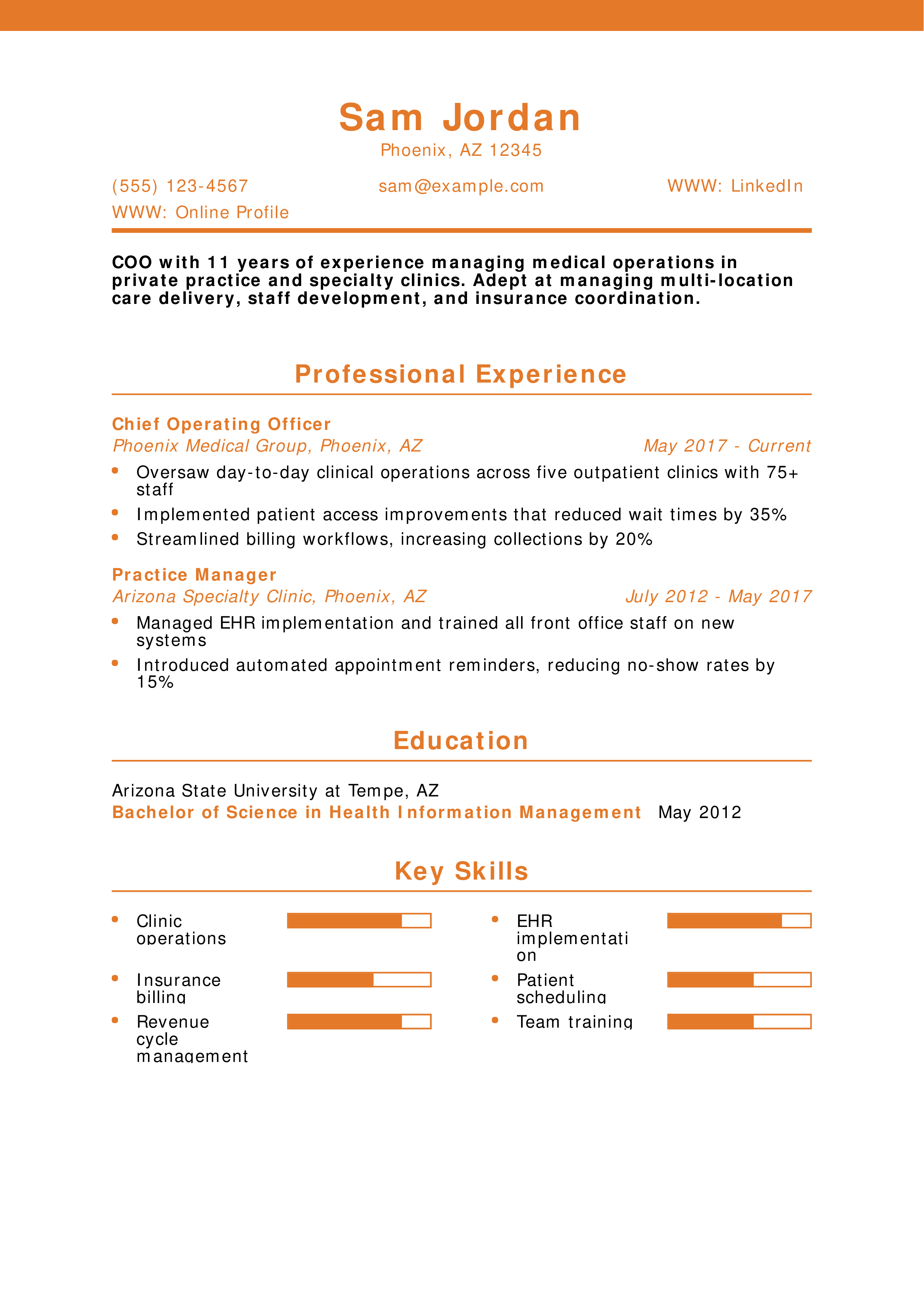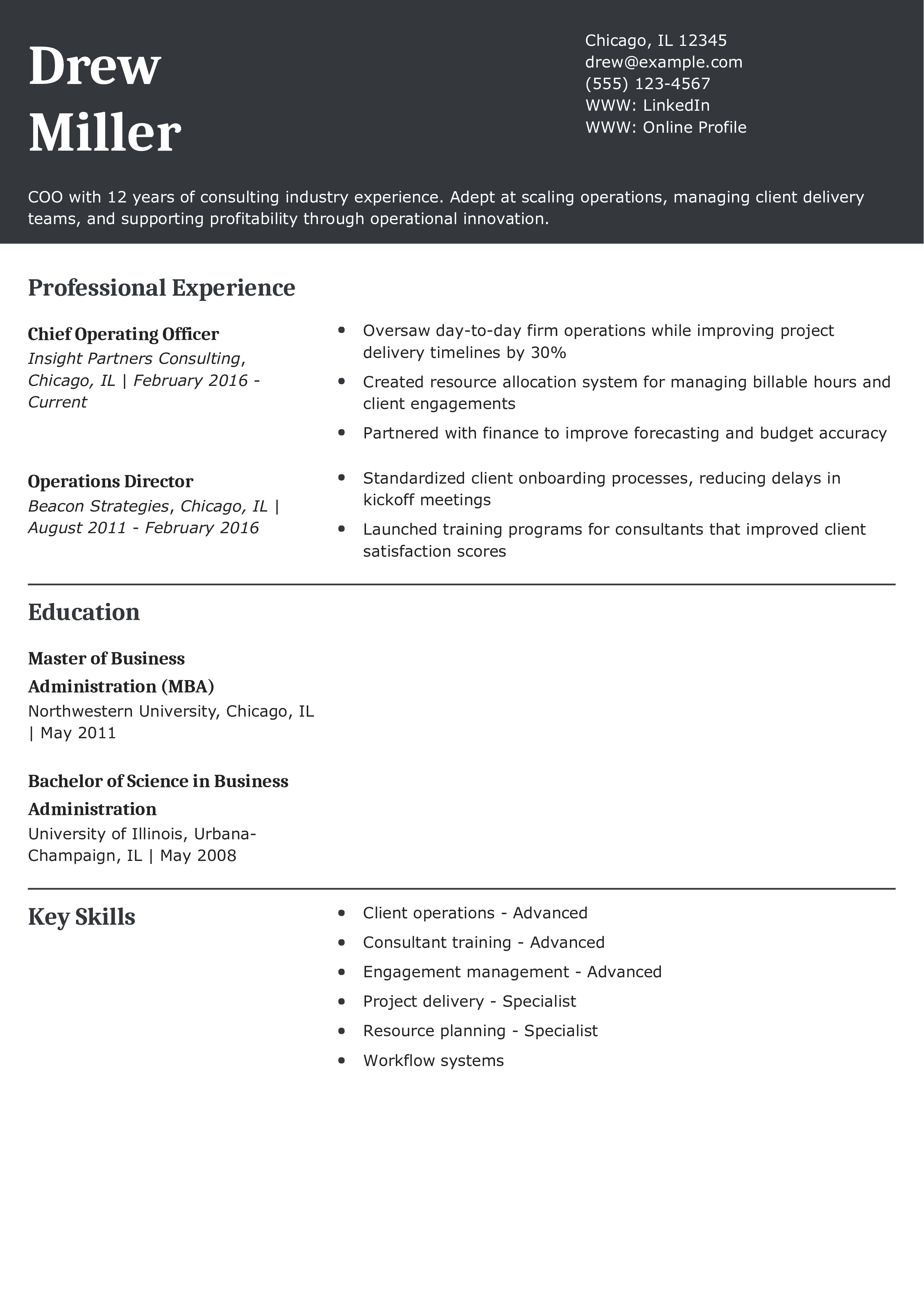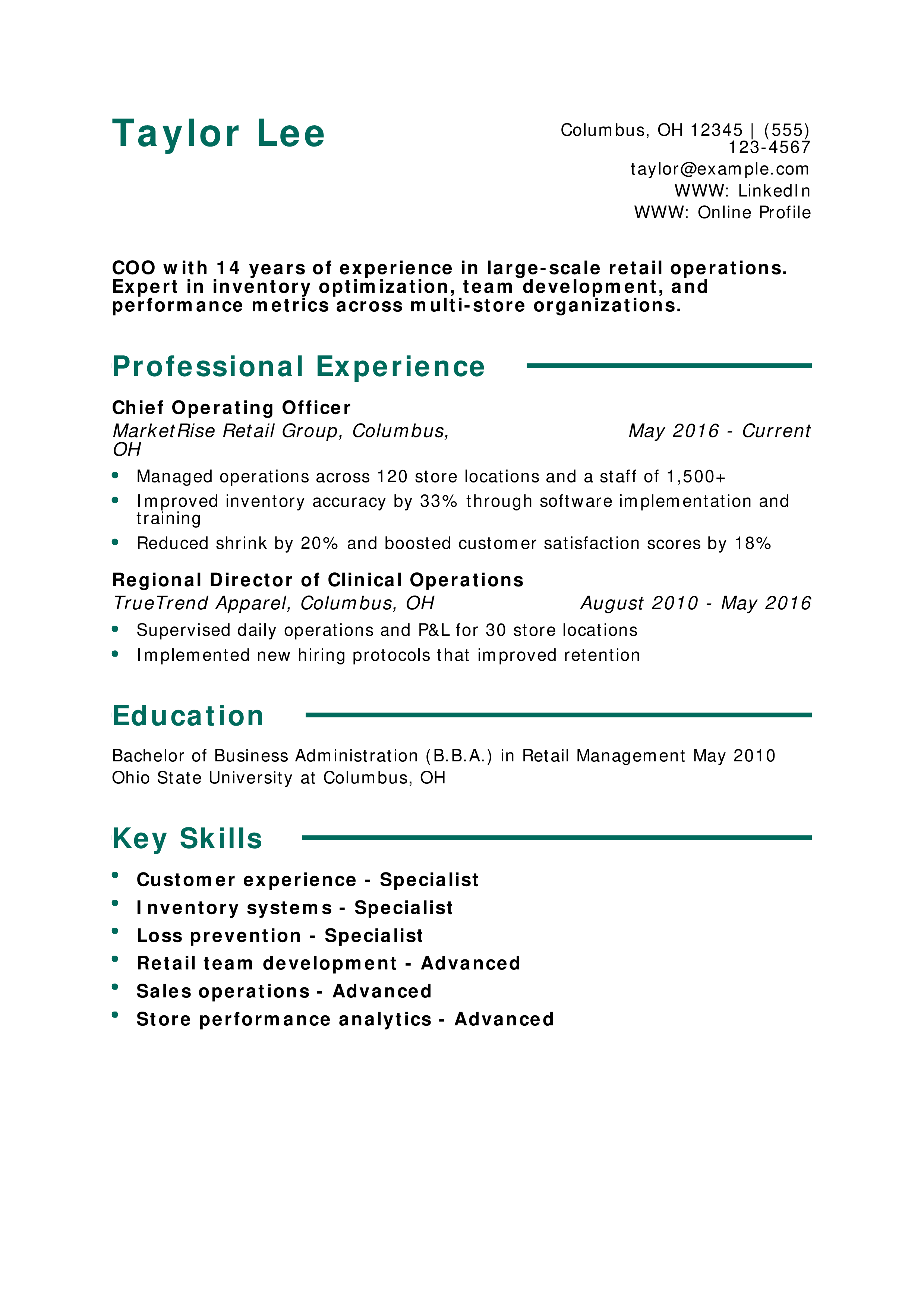 For most COO candidates, the combination resume format works best. It includes plenty of room for both professional experience and relevant skills and proficiencies. This type of format helps ensure your resume is ready to contend with ATS while still containing the engaging professional experience narrative necessary to wow hiring committees.