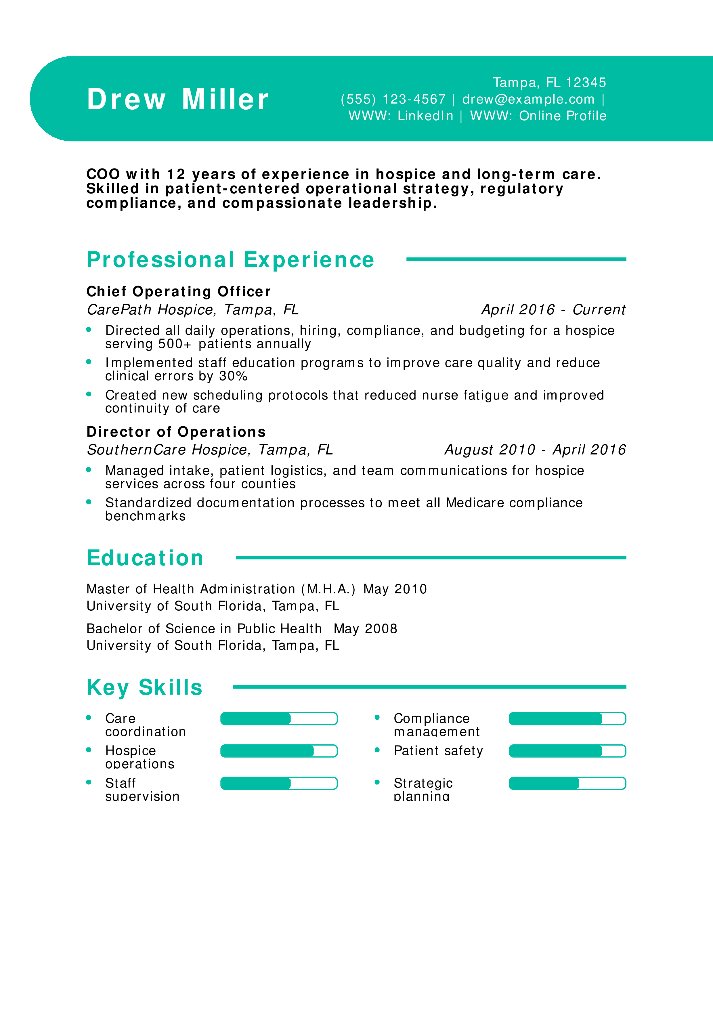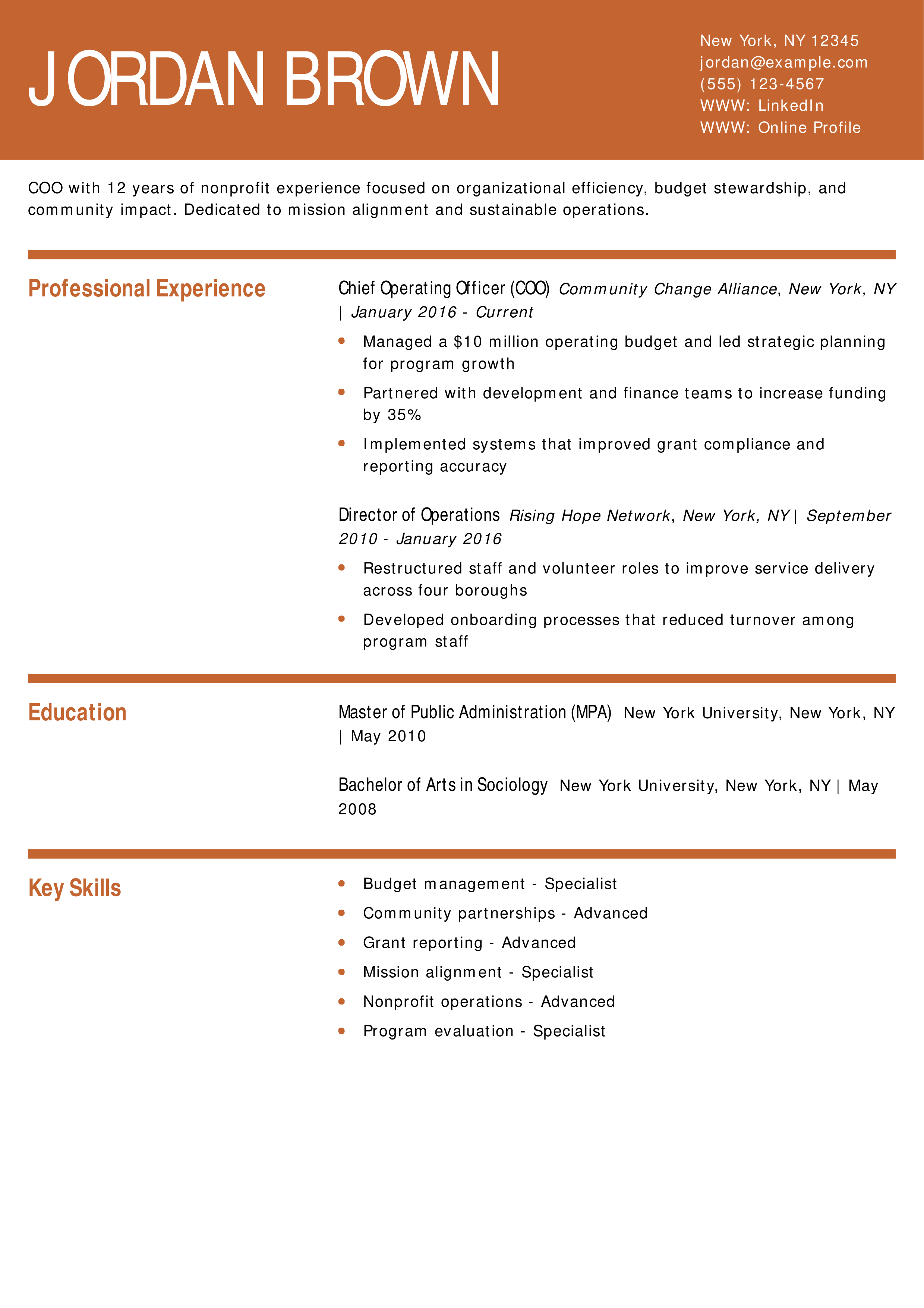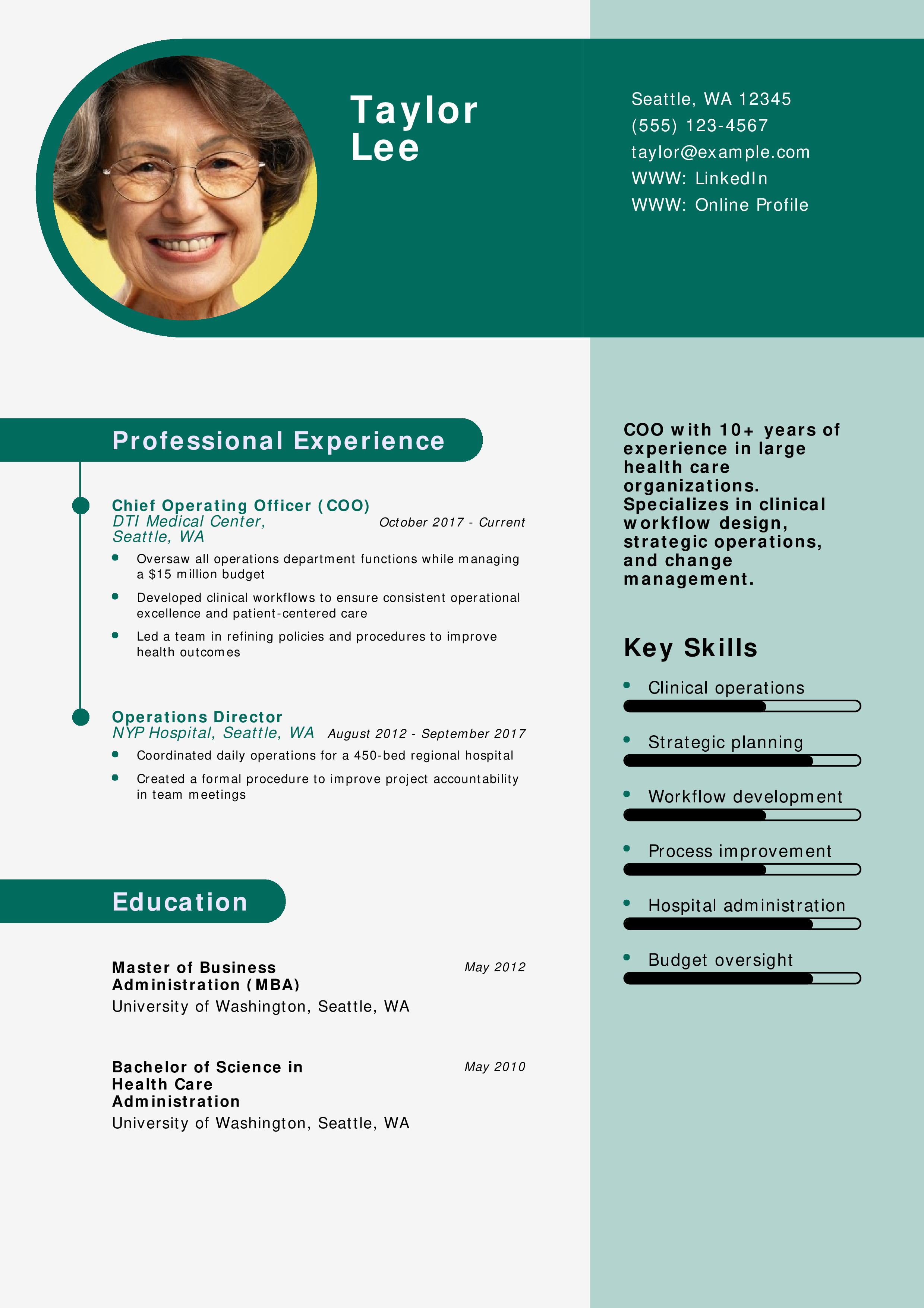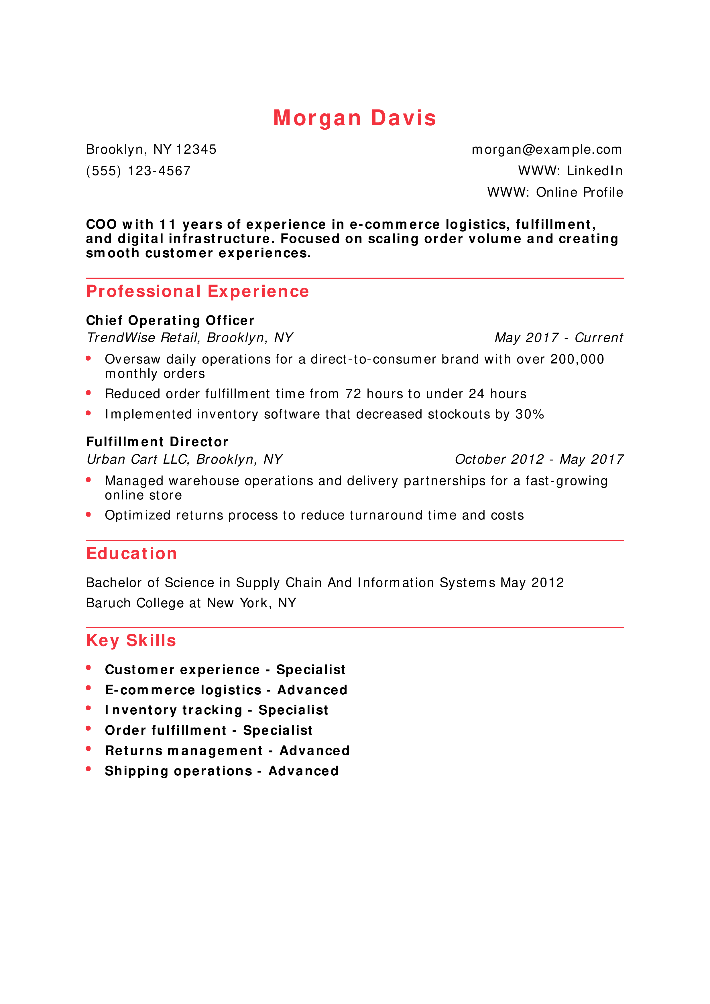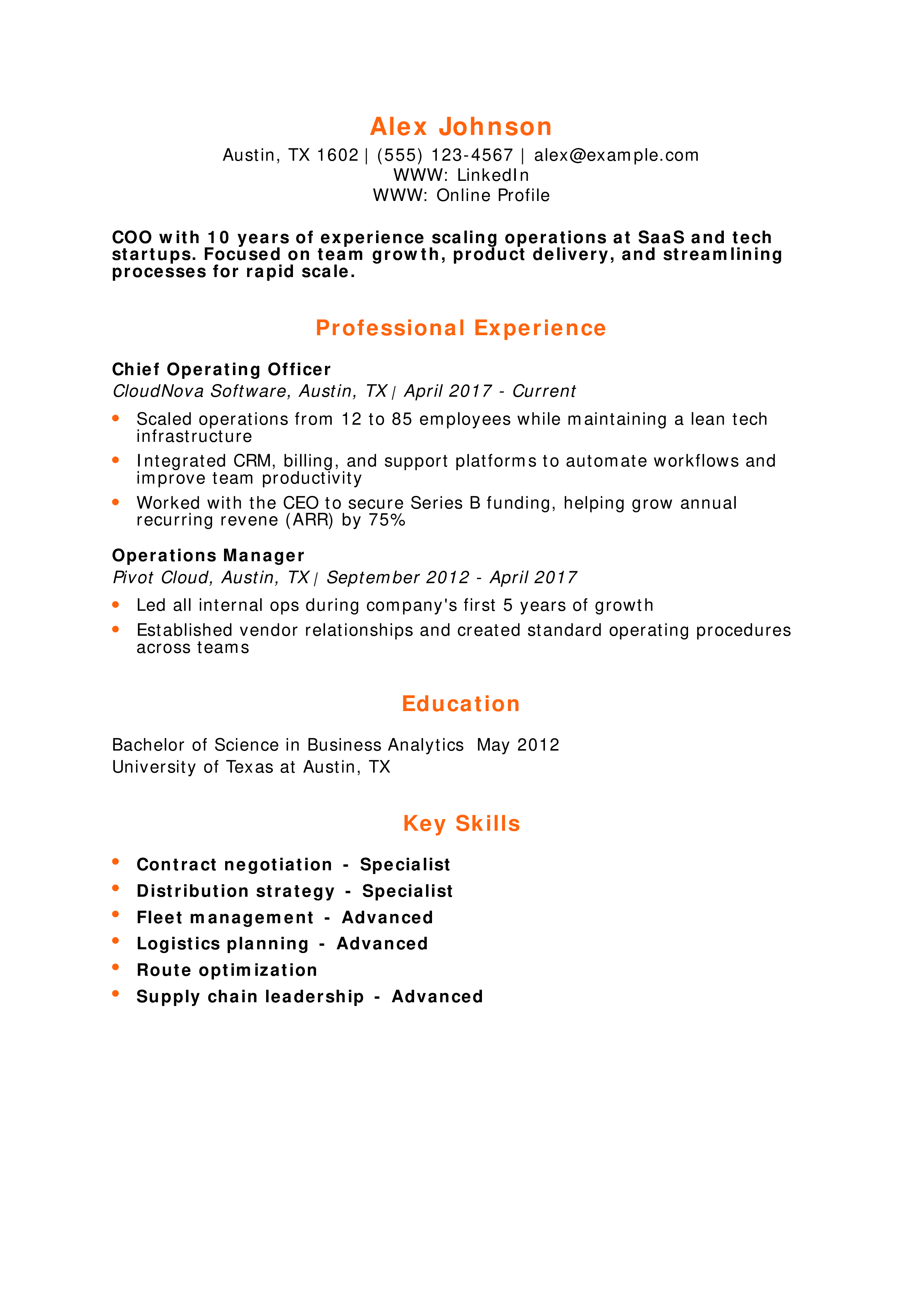 For most COO candidates, the combination resume format works best. It includes plenty of room for both professional experience and relevant skills and proficiencies. This type of format helps ensure your resume is ready to contend with ATS while still containing the engaging professional experience narrative necessary to wow hiring committees.