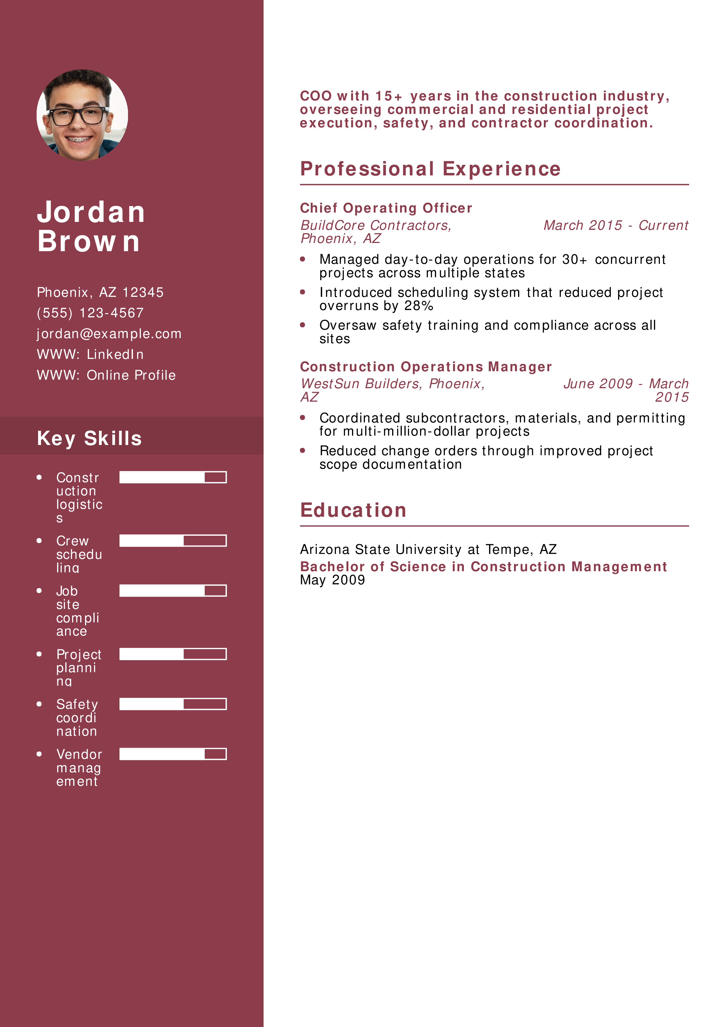 This resume clearly presents operational leadership in fast-paced construction environments. The measurable safety and scheduling improvements add impact. For more advice, see this resource on resume interests and sections.