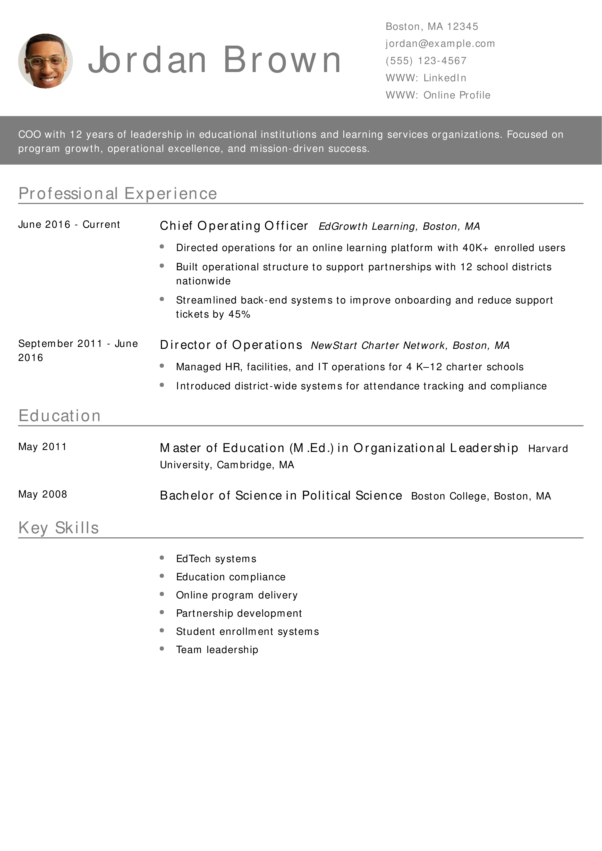 Typically, employers want COO candidates with years of experience and the education to match. Hiring organizations may only accept candidates with college degrees, so ensure your education is easy to find and scan. Include the name of the school, your degree, and when you graduated — and do so for all degrees you hold.