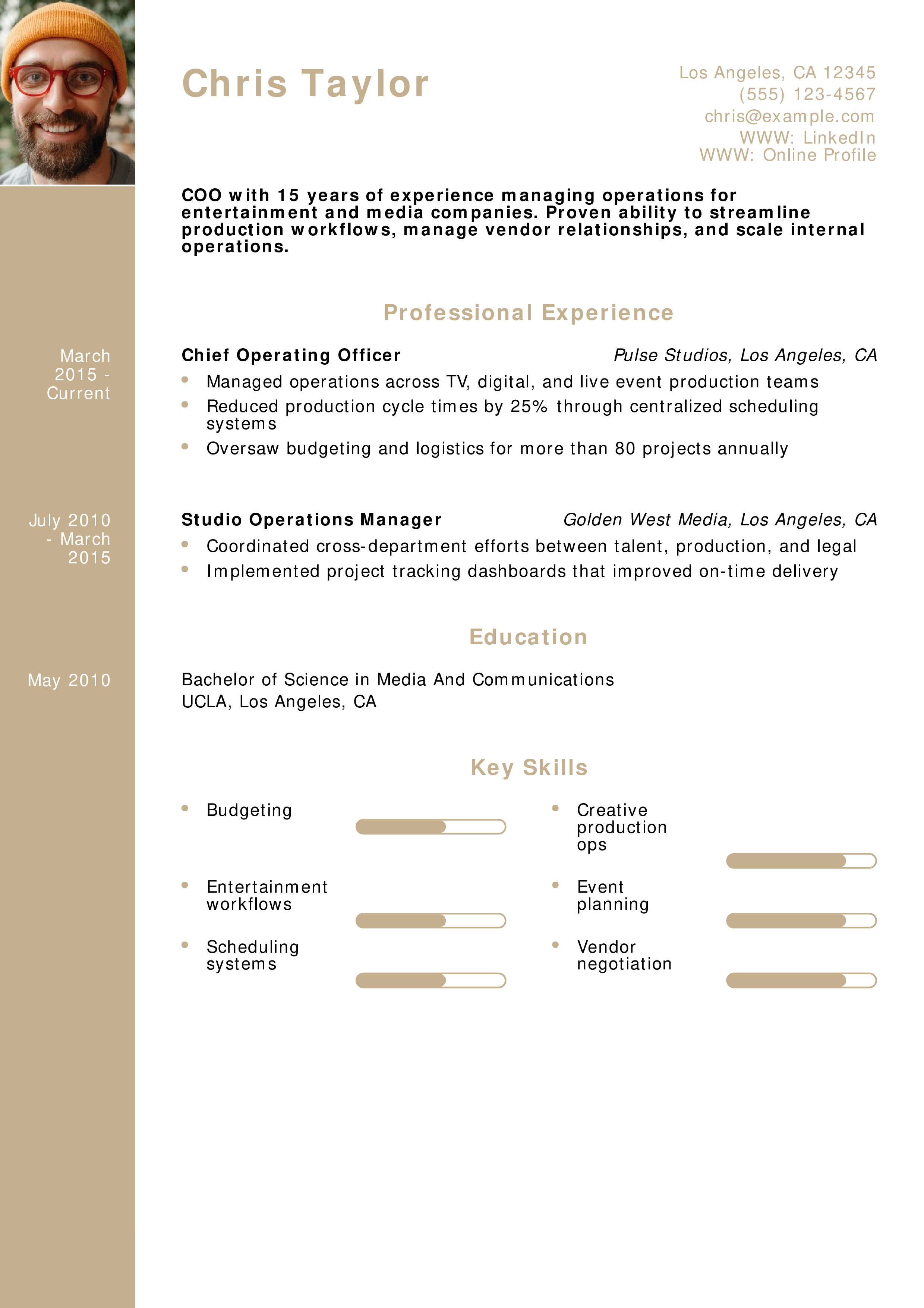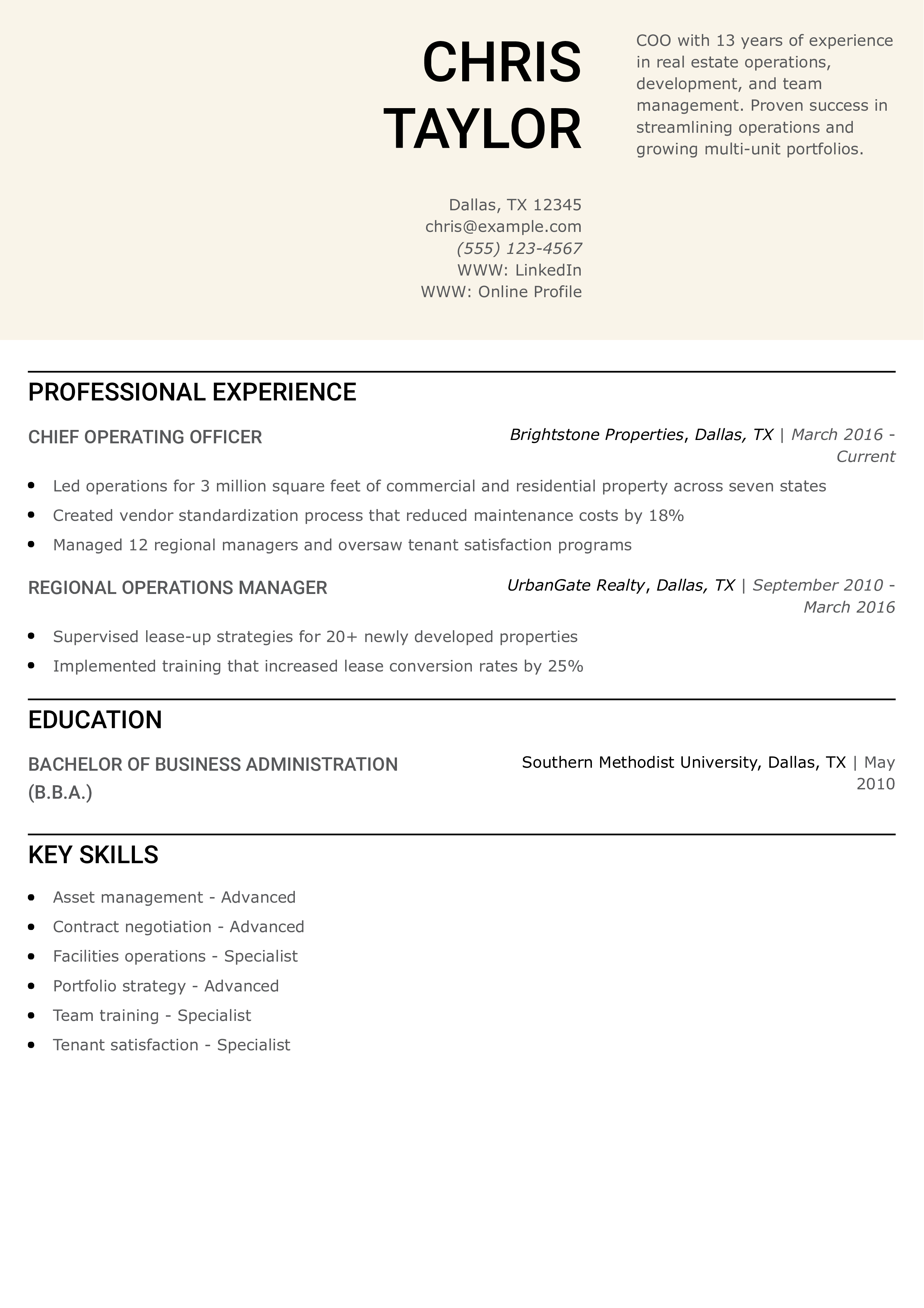 A competitive chief operating officer (COO) resume is packed with demonstrations of experience, confident leadership, and knowledge of the industry in question. Create this document by leveraging best practices, such as using action verbs and specific metrics in bulleted lists or choosing the right format for your resume.