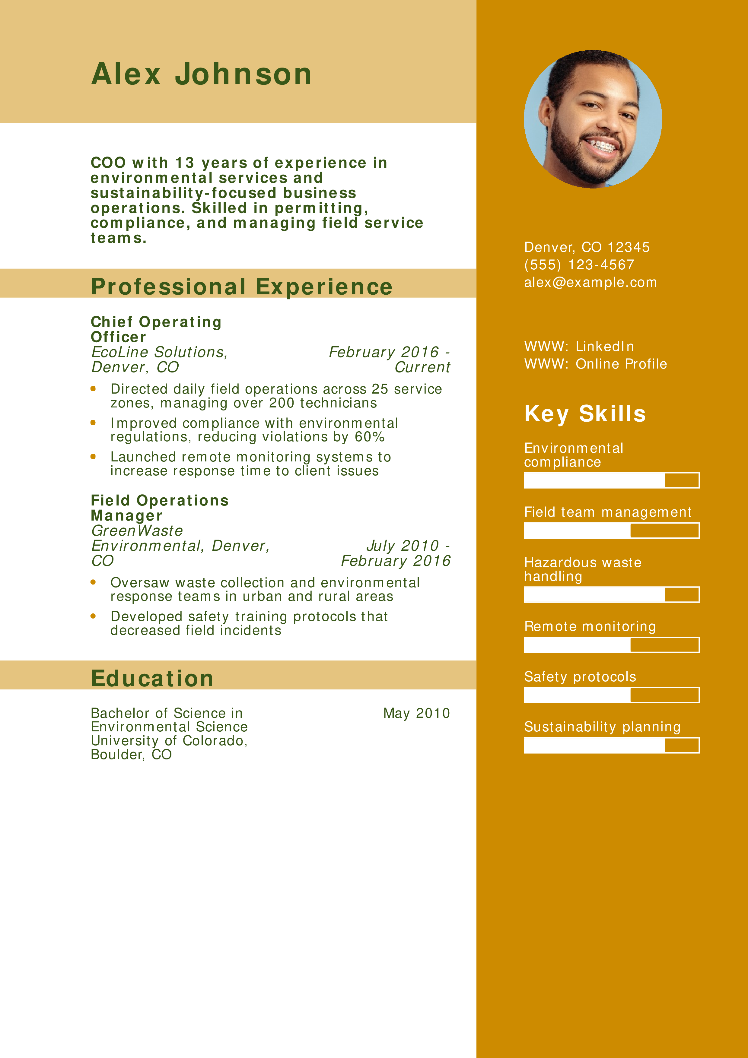 This resume combines field leadership and technical operations, focusing on environmental compliance and worker safety. For help highlighting industry credentials, visit this resource on listing certifications.