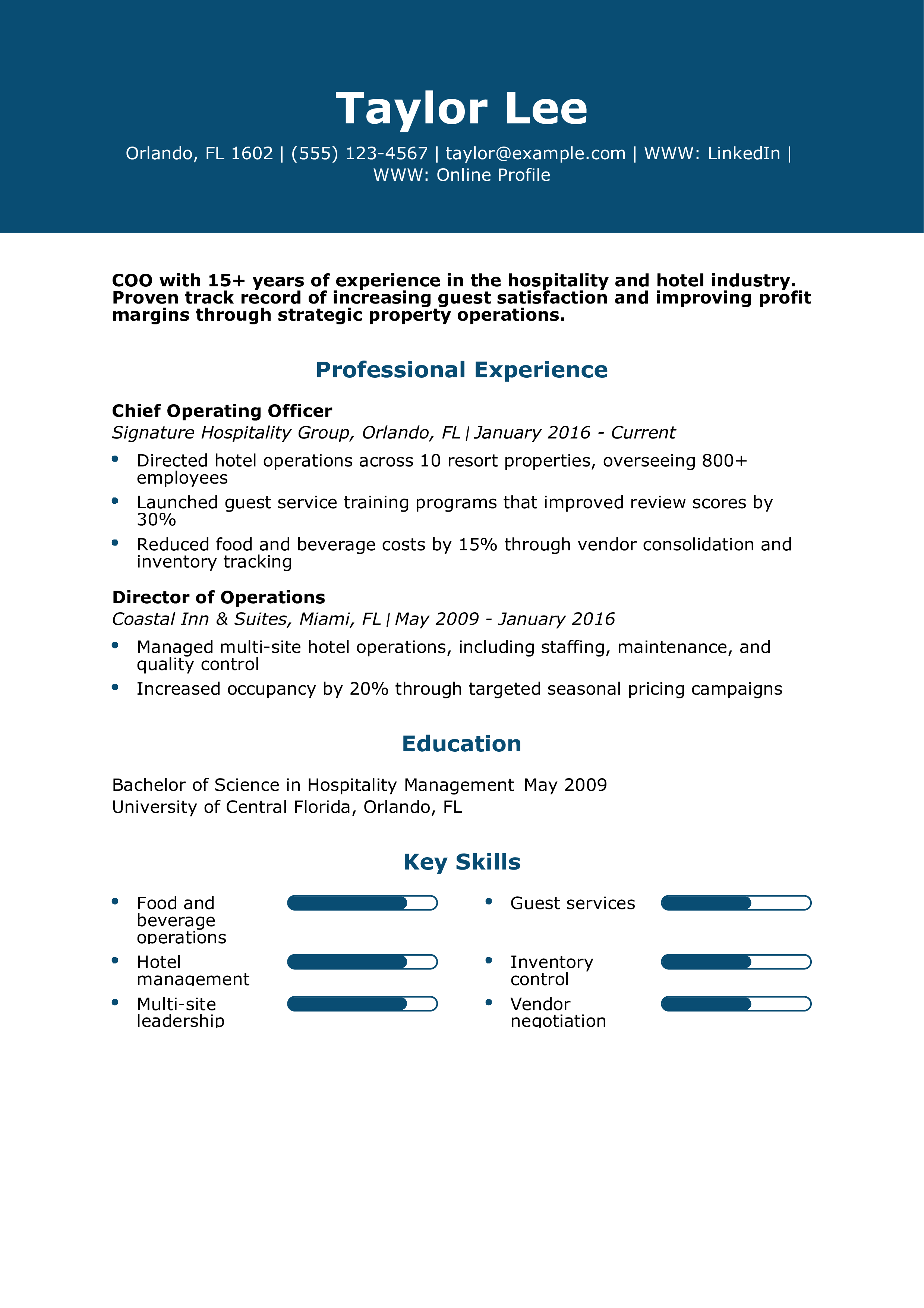 This resume shows a strong mix of financial responsibility, service improvement, and property management — critical skills for COO roles in hospitality. For more tips on aligning experience to goals, see this guide on how to tailor your resume.