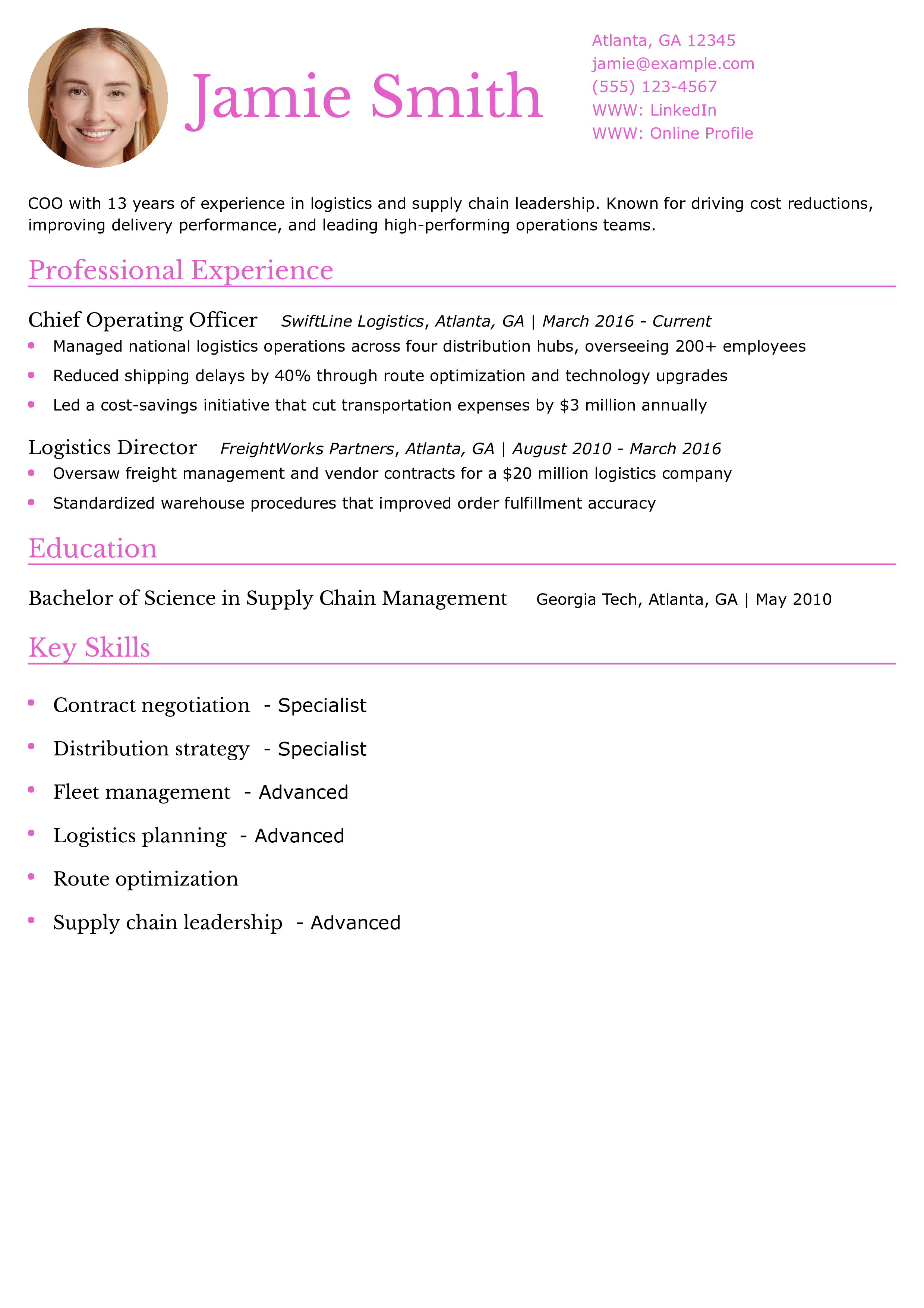 This resume showcases both high-level strategy and day-to-day logistics execution, with metrics to back up results. To improve similar resumes, see resume outline examples.