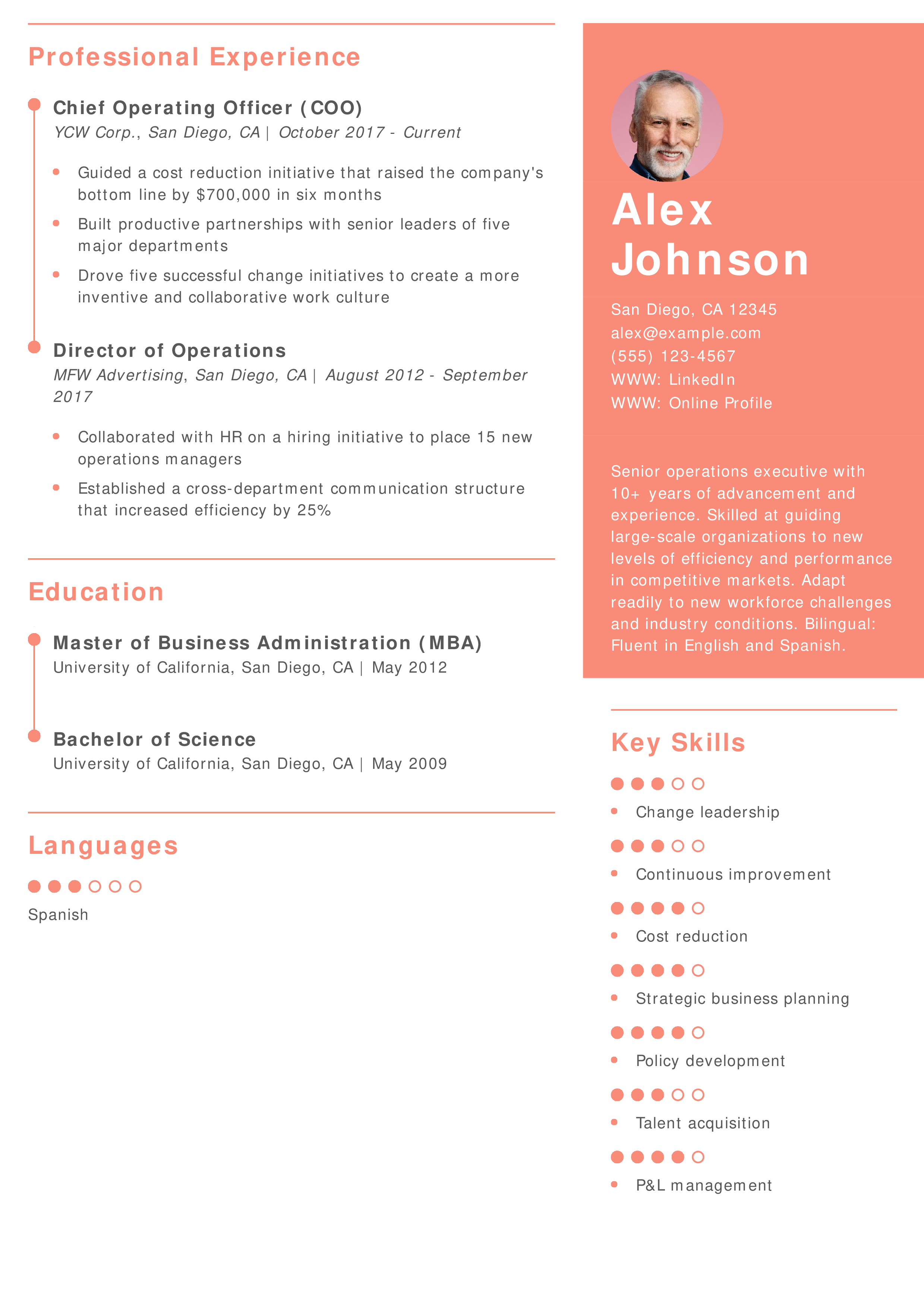 Look for a template that includes plenty of white space. While a one-page resume can be easy to manage, a two-page template might be necessary to include more than a decade of experience. A COO resume might include a small professional flourish or two, but keep the design elements minimal to ensure a clean, easy-to-process document.