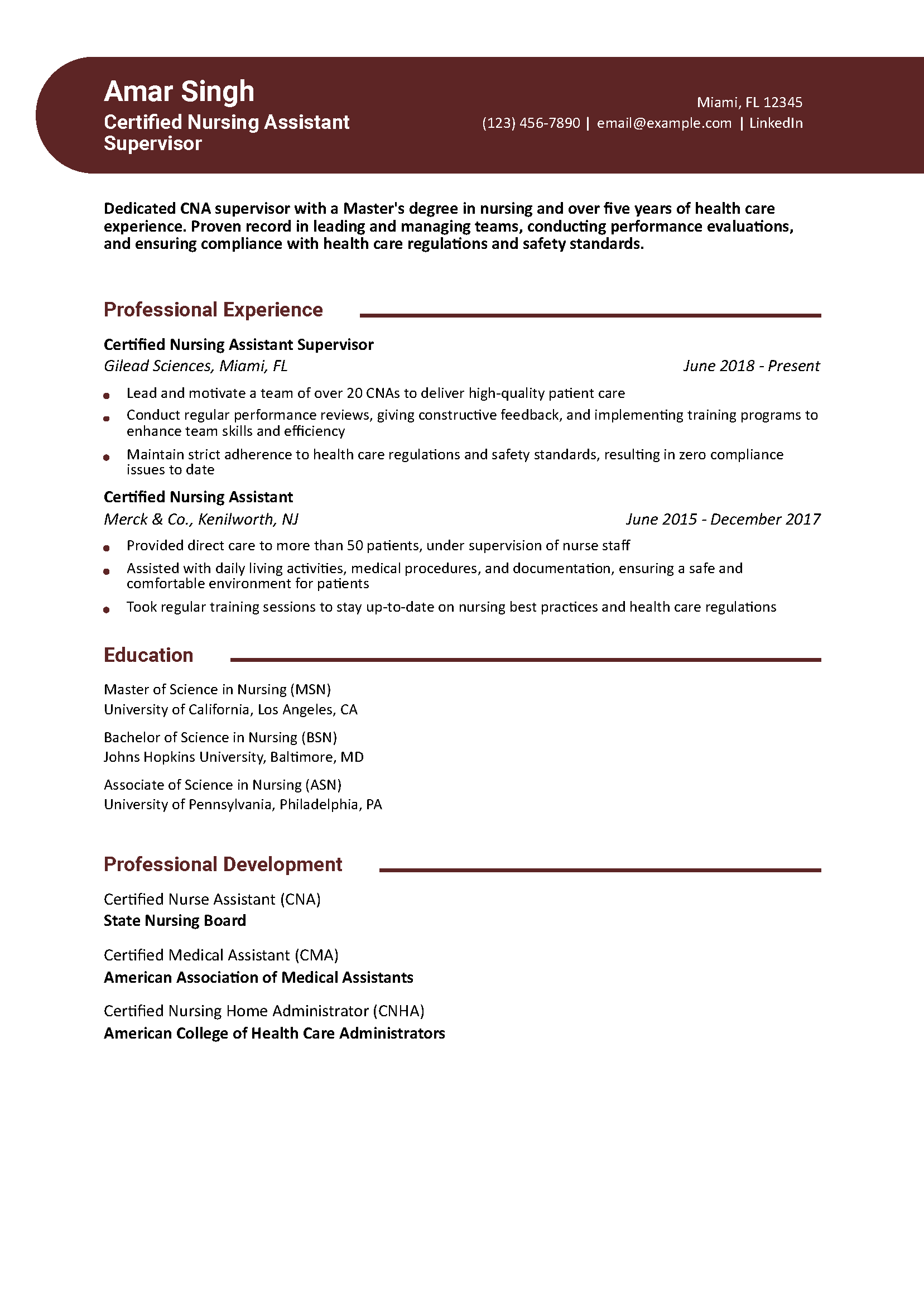 This resume showcases leadership skills in a high-pressure setting, such as surgical and ICU units. It highlights over 10 years of experience, making the candidate well-suited for leadership or supervisory roles. The resume stands out by emphasizing the candidate’s experience in training over 15 CNAs and ensuring compliance with health care safety protocols, which demonstrates a commitment to quality and safety in patient care. It also focuses on cross-functional collaboration, a key strength in managing patient care teams.