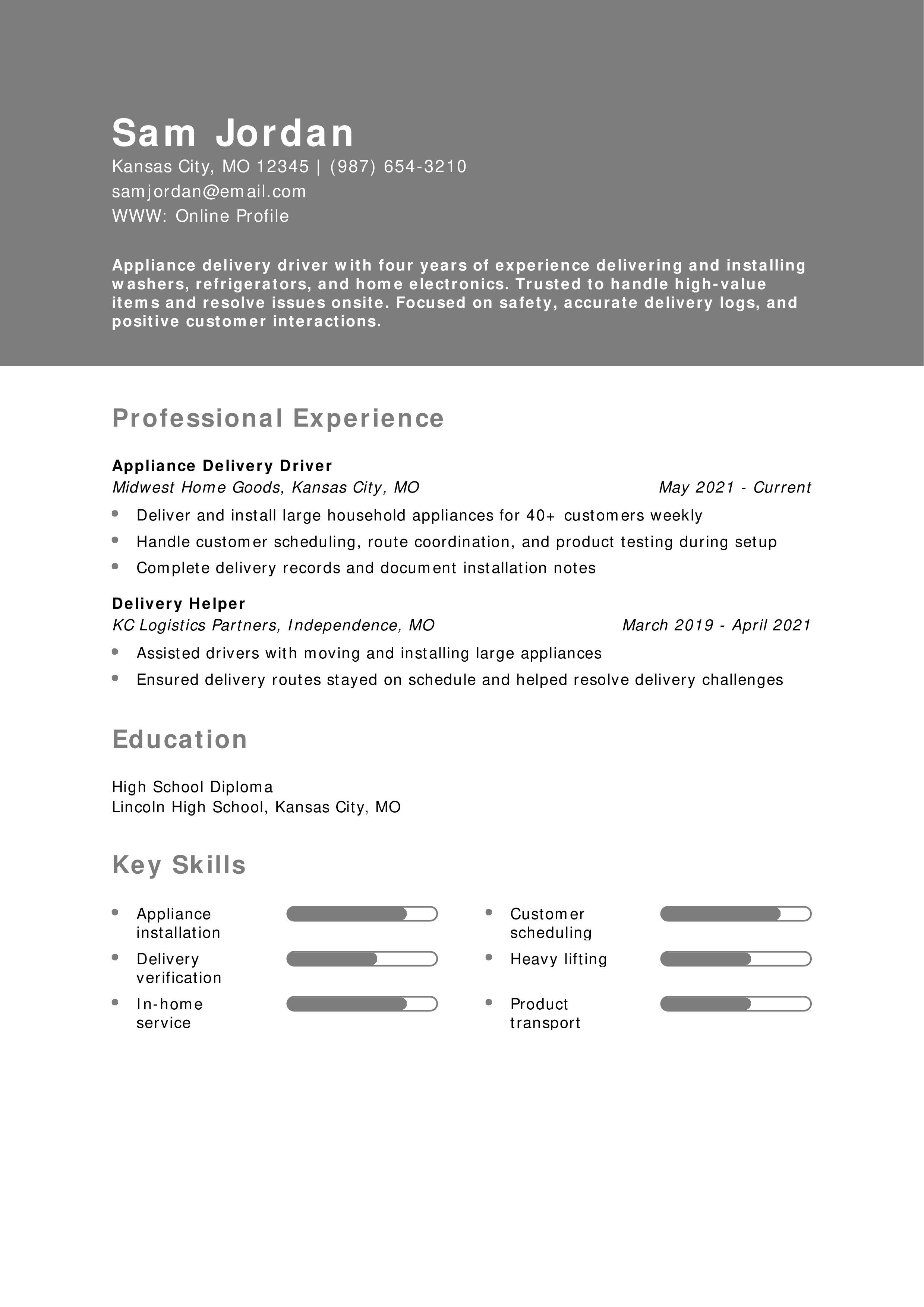 This resume showcases a mix of delivery and hands-on service. For customer-focused delivery roles, mentioning setup experience and client interaction is a must. Want to learn more about resume structure? Review this guide on resume outline examples.