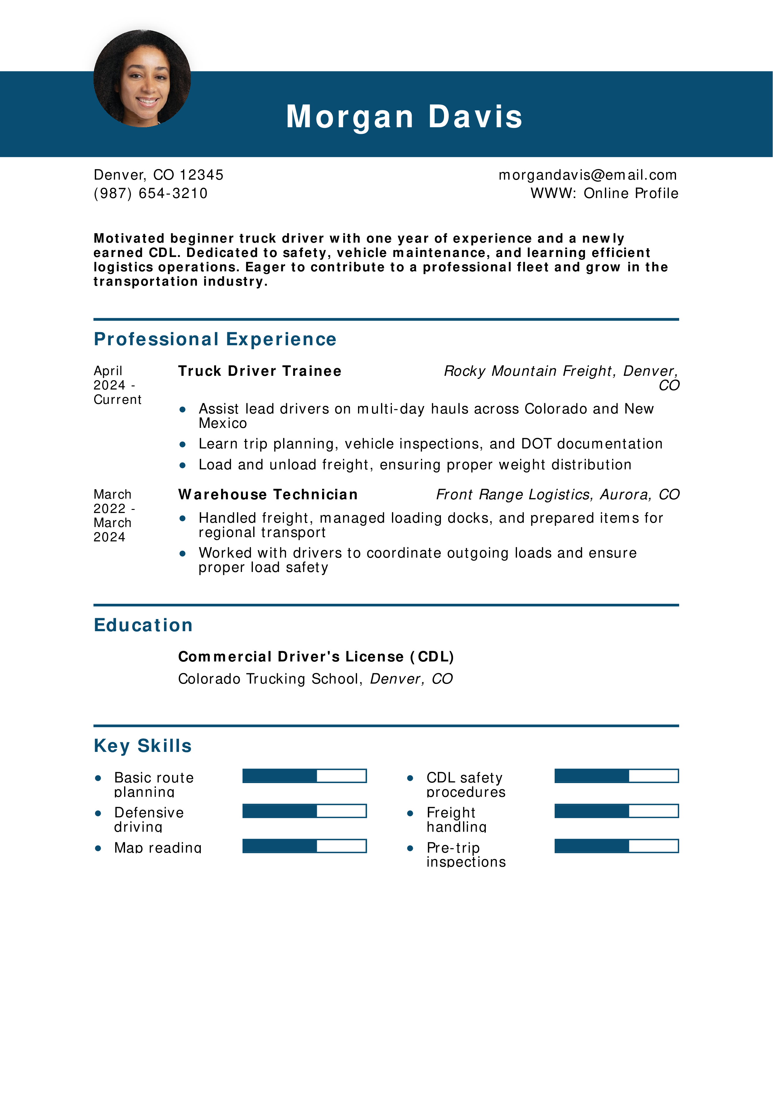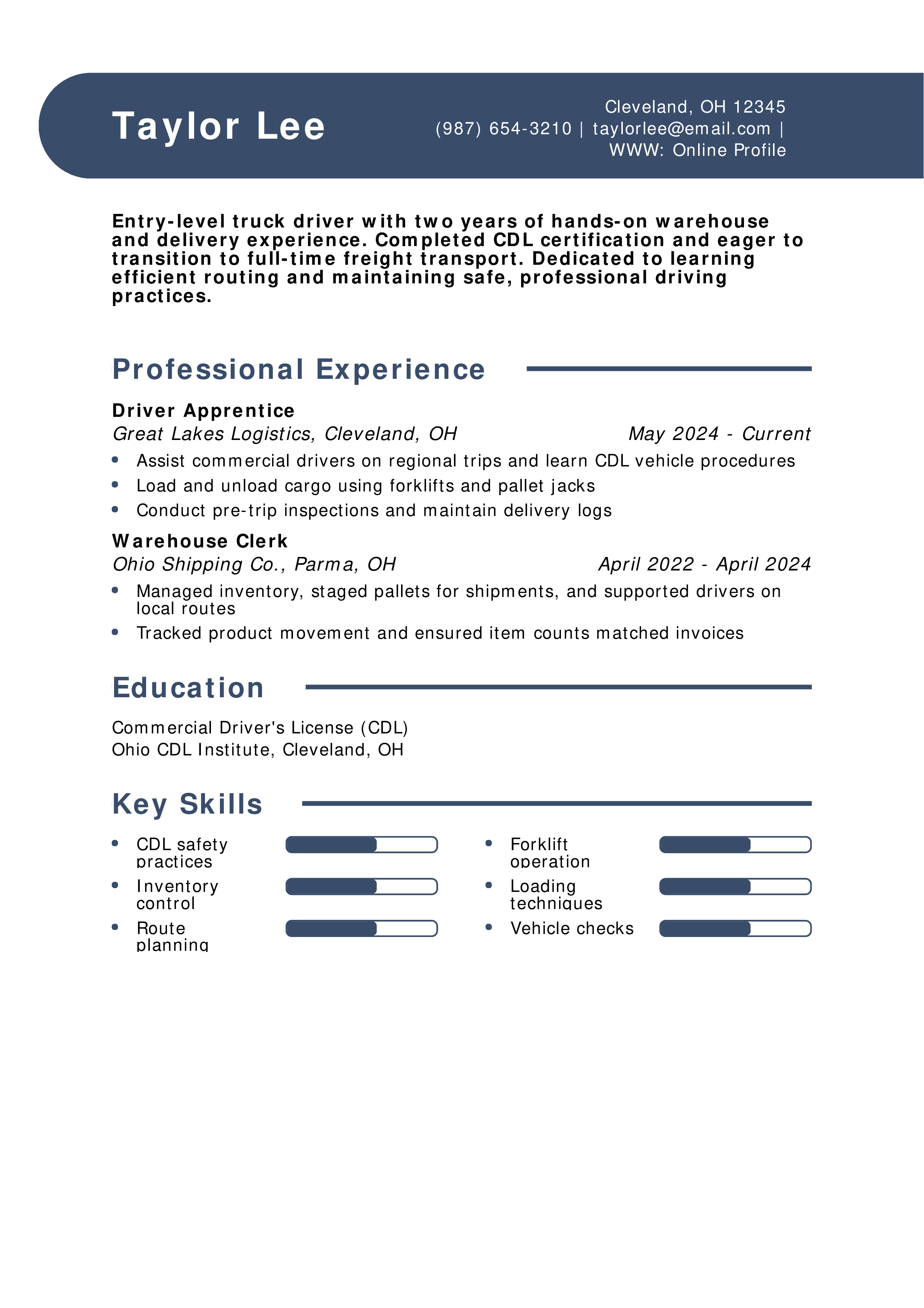 This resume shows potential by combining warehouse and driver apprentice roles. It builds a foundation while pointing toward a commercial driver career. For more resume ideas geared toward new job seekers, visit this guide on resume examples for teens and entry-level applicants.