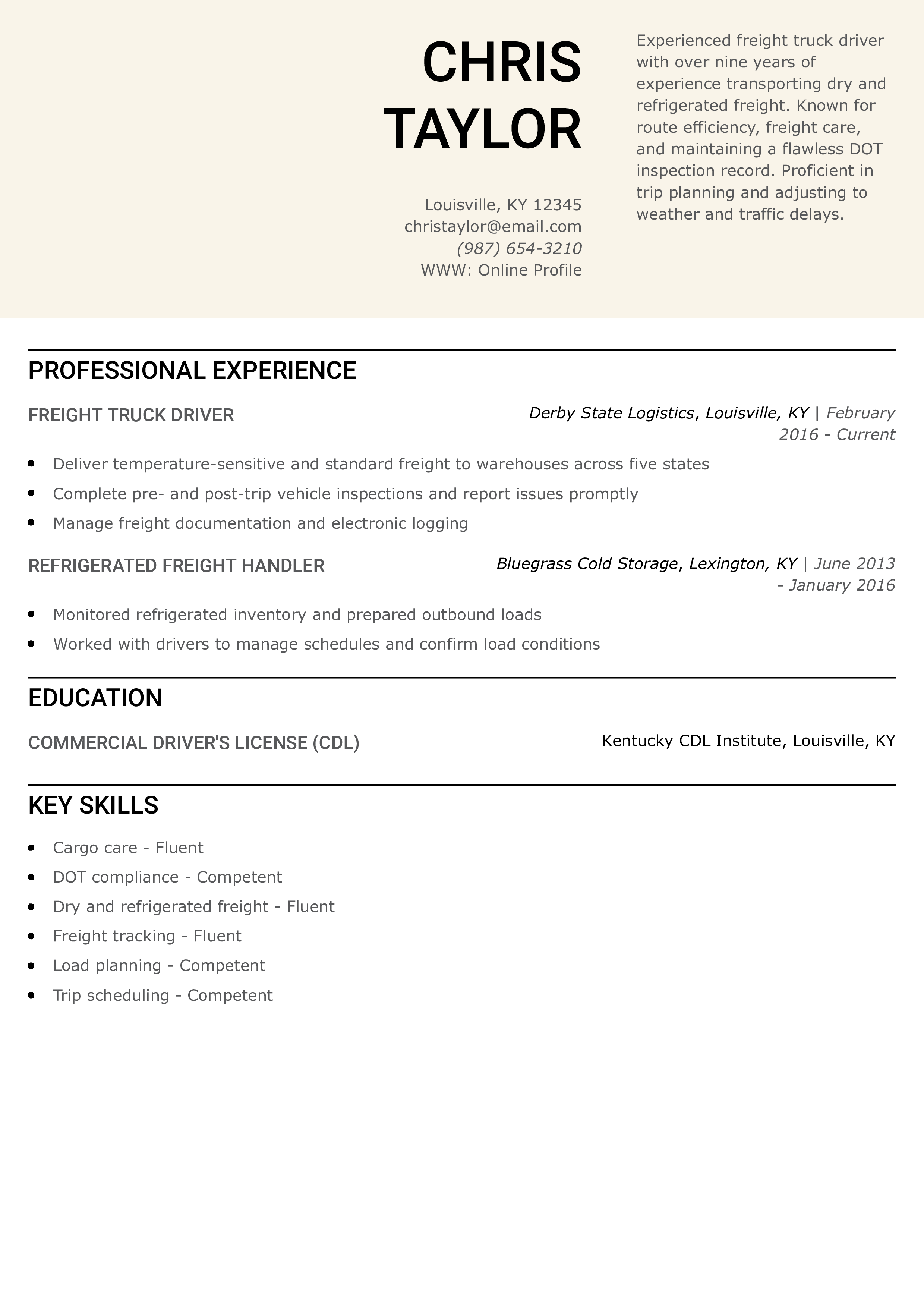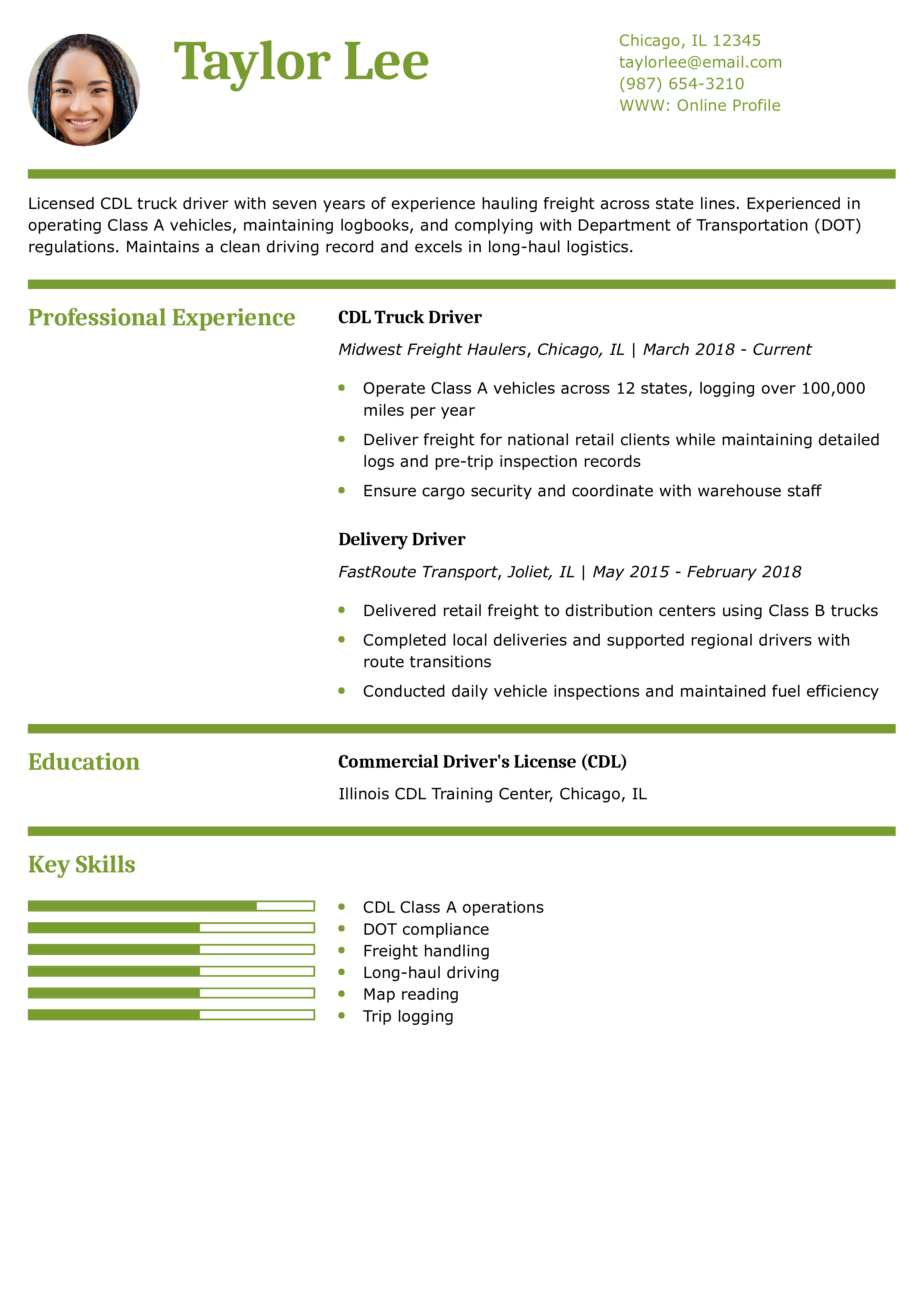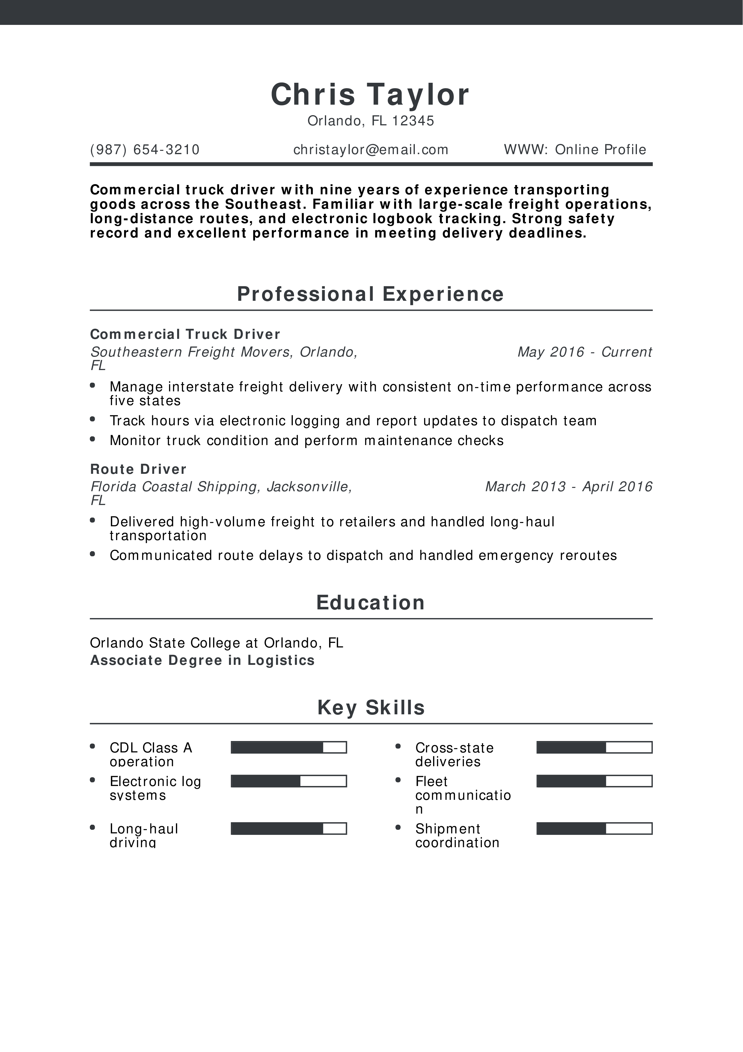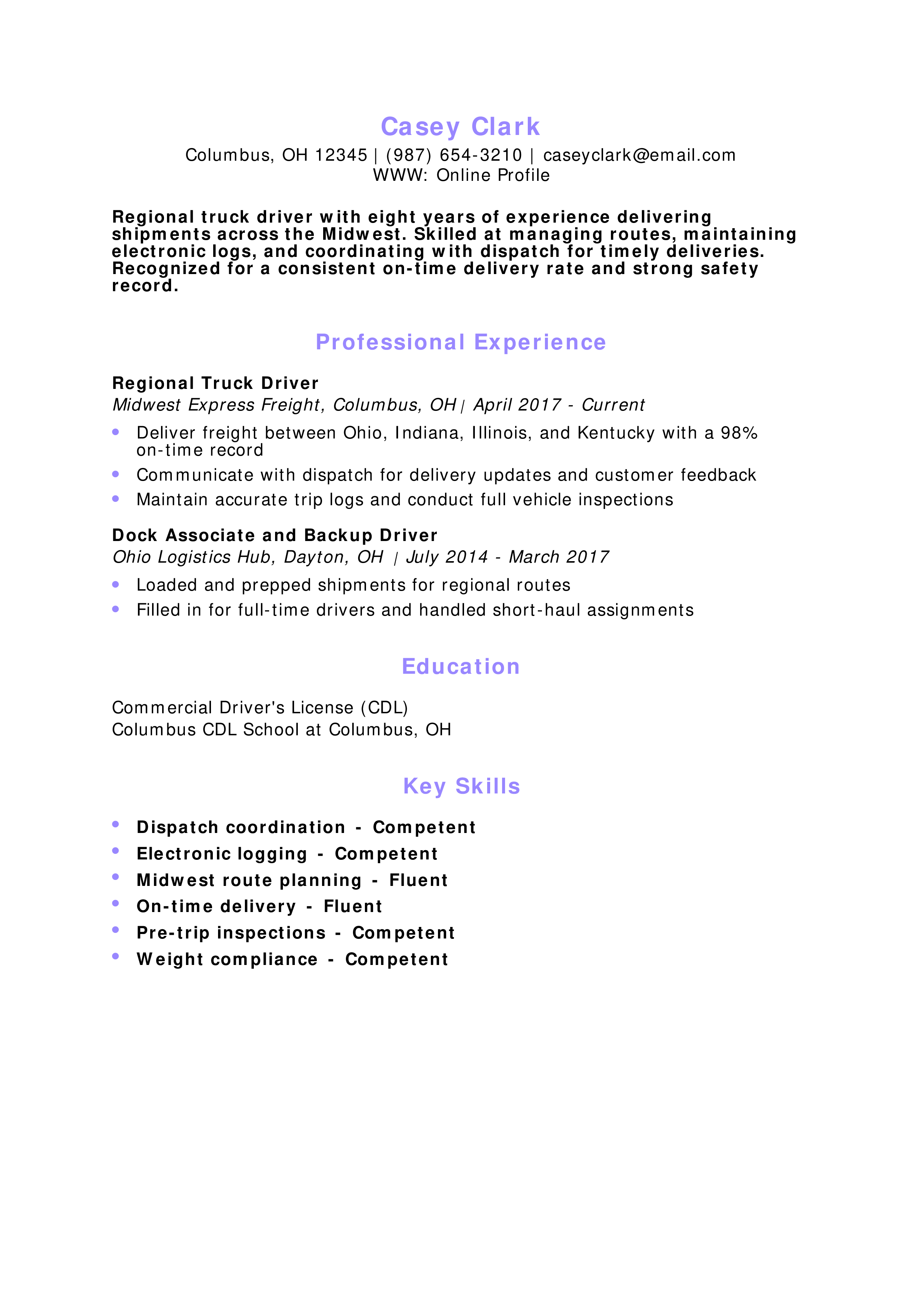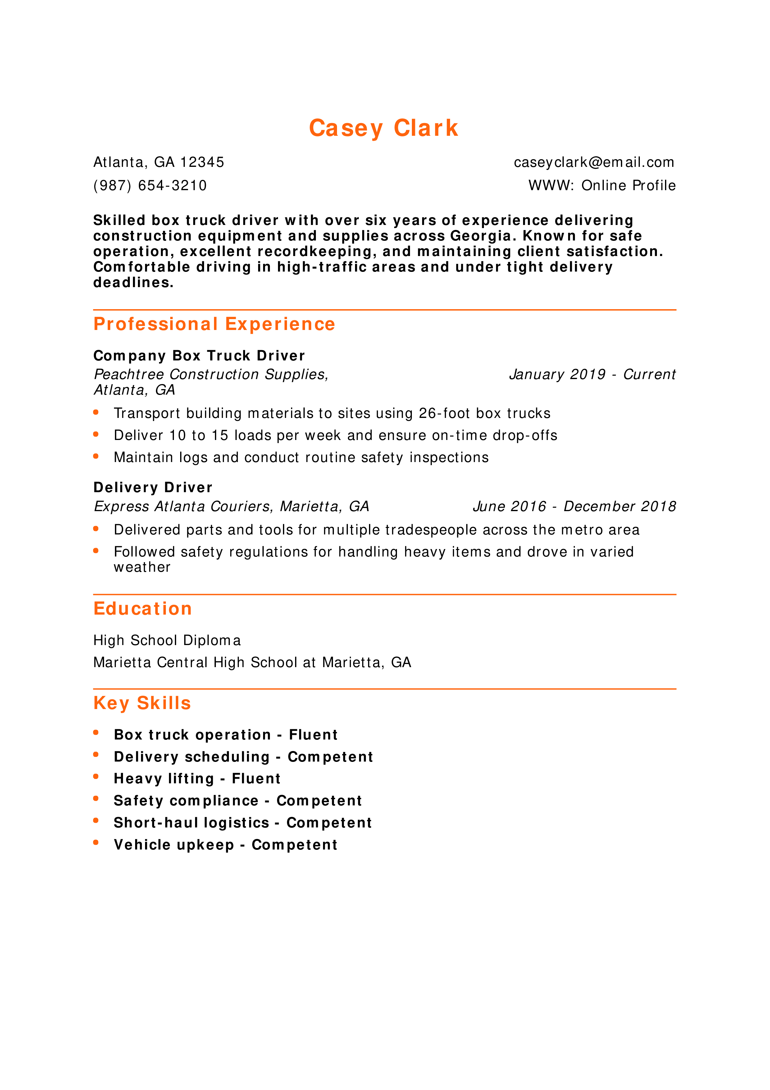 Be concise and specific. For example, instead of saying you know how to support efficient delivery processes, say you implemented loading procedures that reduced each day’s work by an hour on average. If you don’t have much driving experience, draw on what you learned in CDL training or the results you achieved in other positions that demonstrate skills that translate to driving.