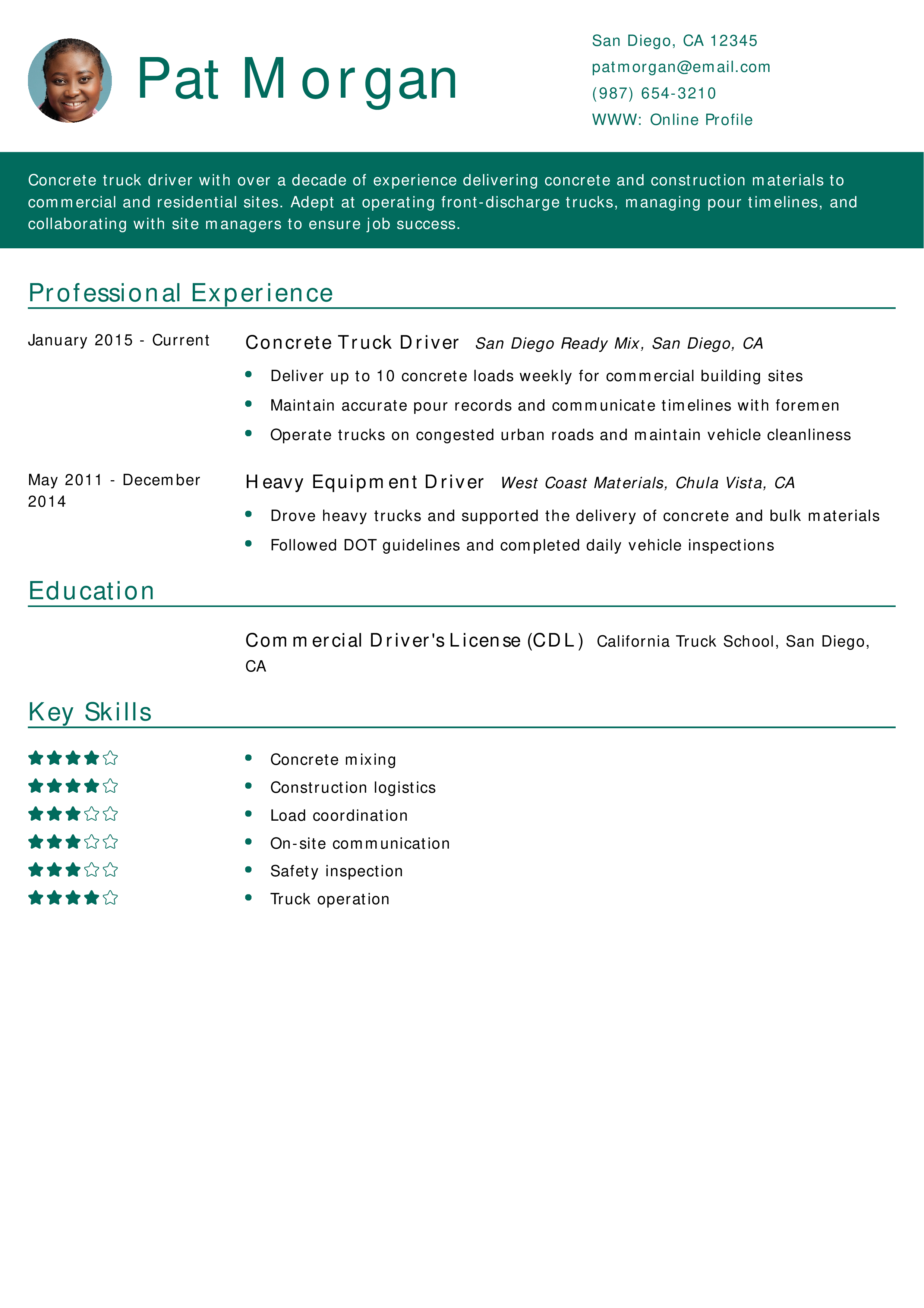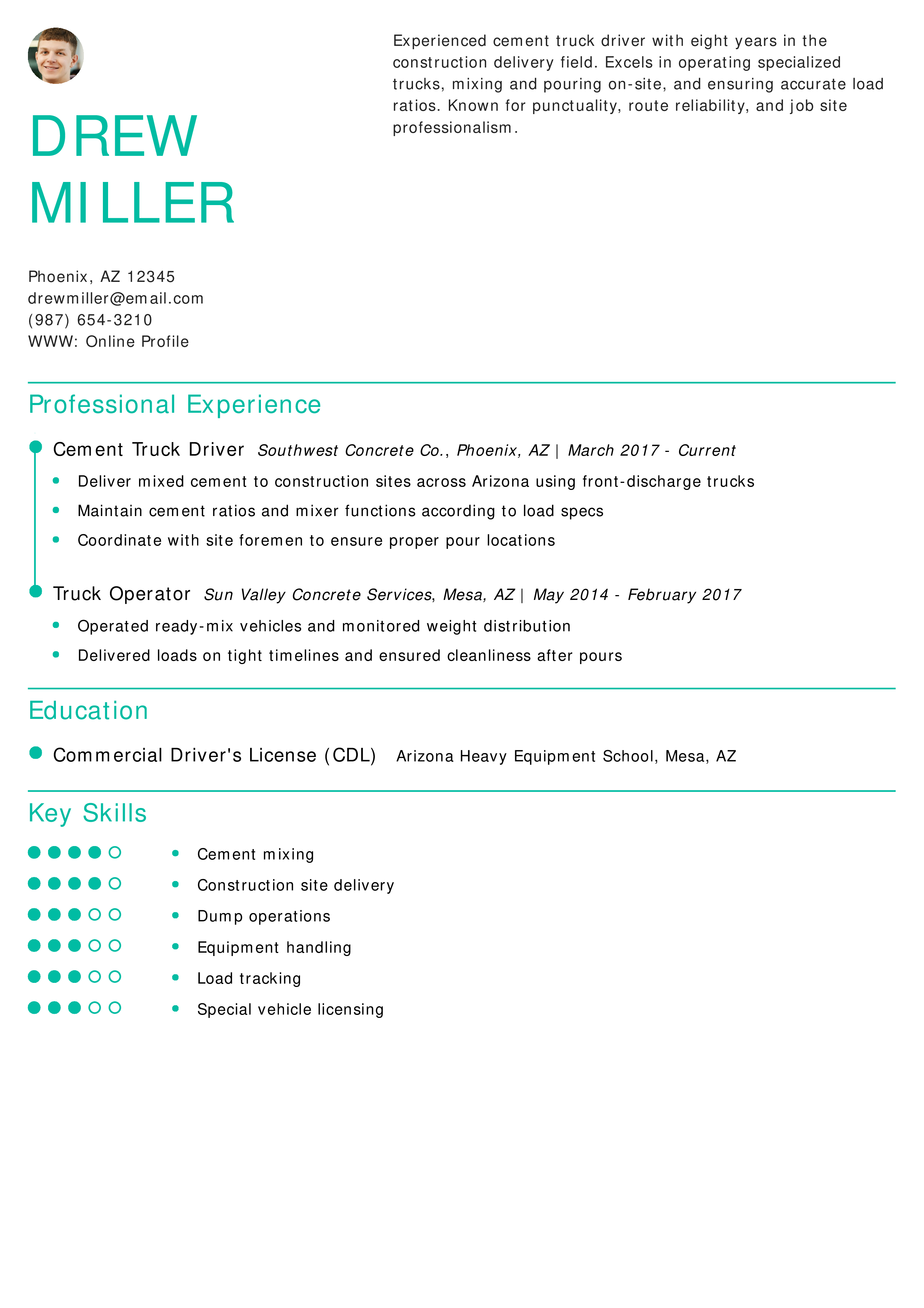 This resume demonstrates niche expertise in cement delivery — a highly specialized skill in demand. Highlighting site coordination and truck operation is essential. For more help highlighting credentials, check out how to list certifications on a resume.