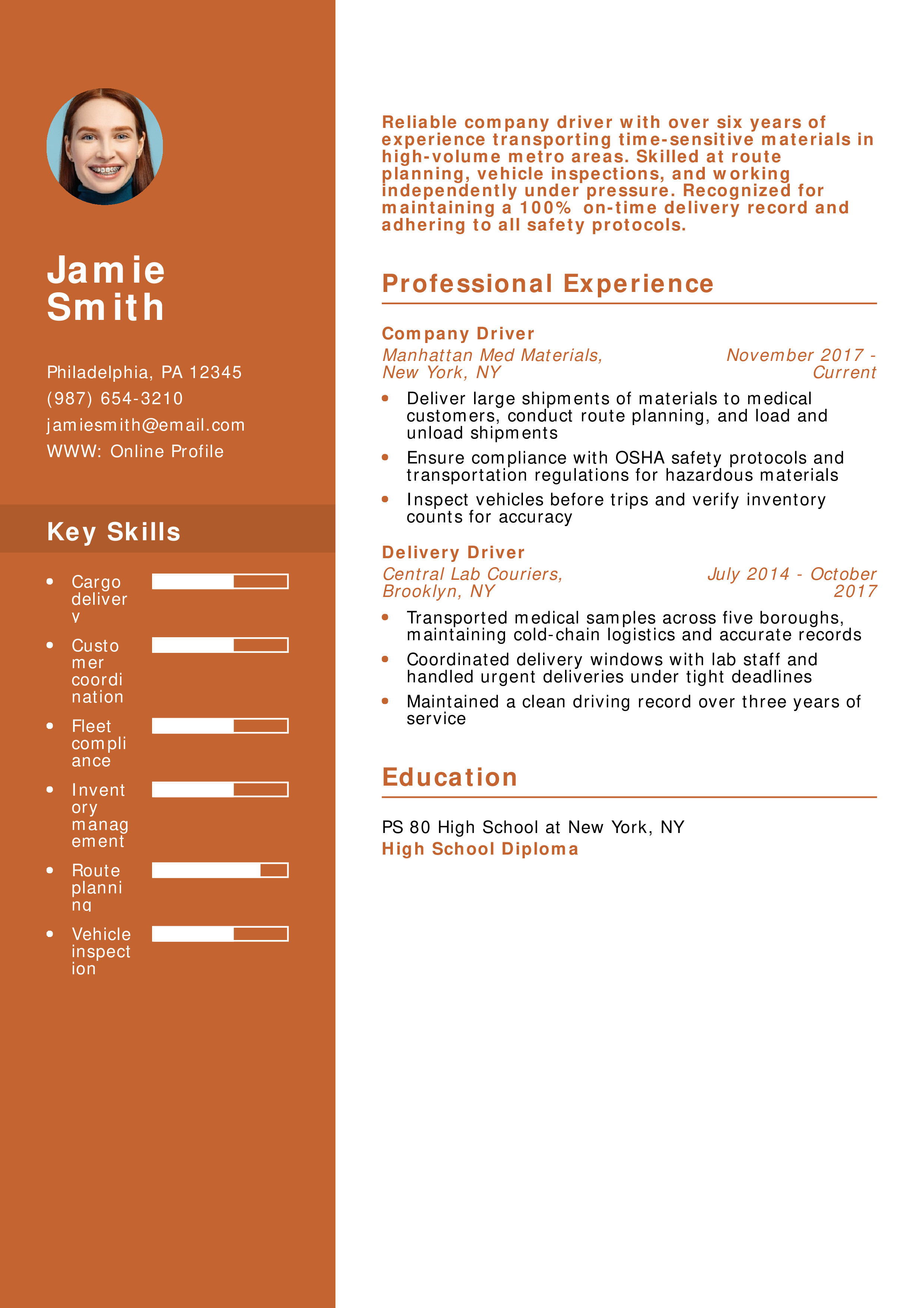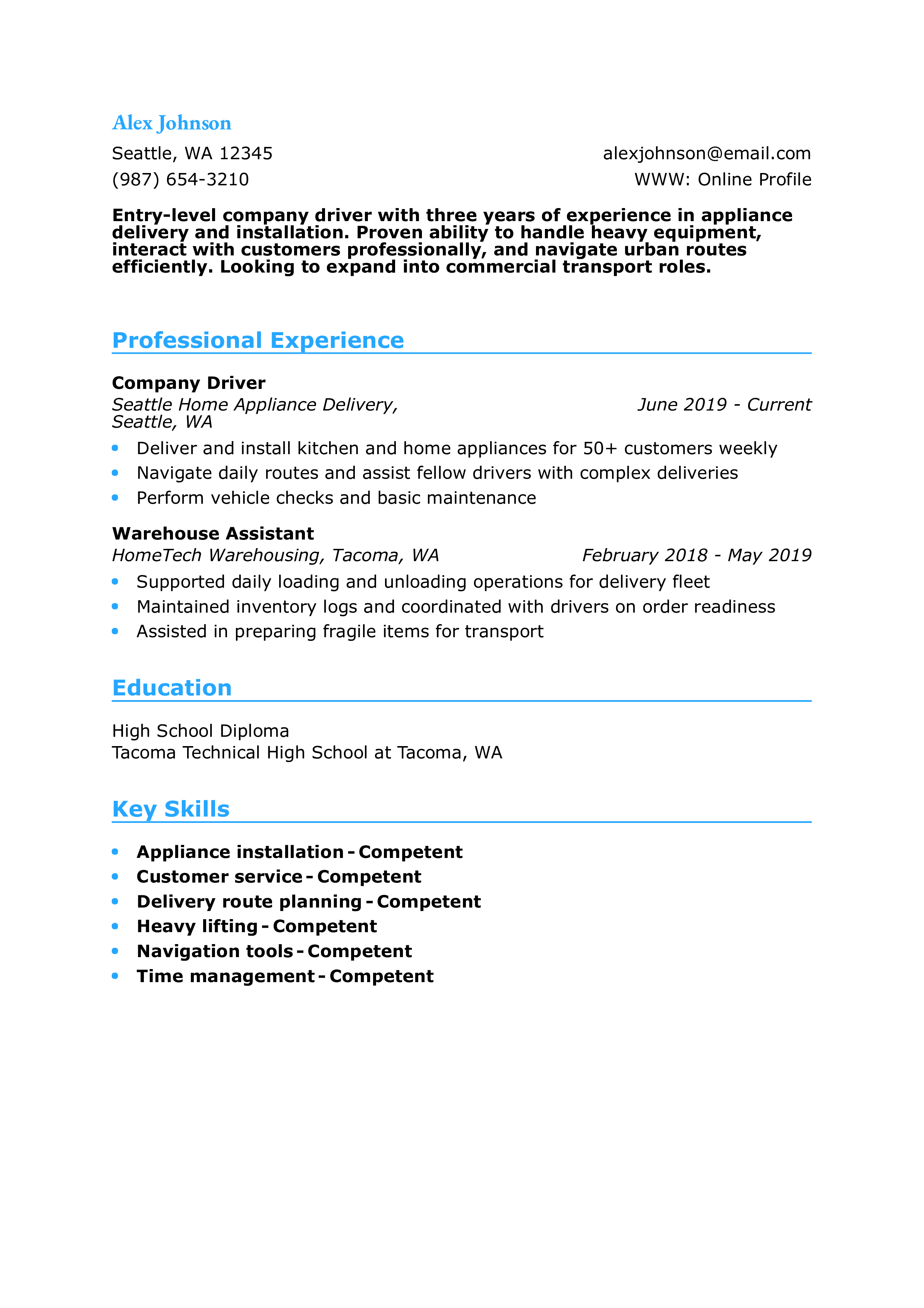 A company driver with three years of professional experience specializing in product delivery, truck driving, passenger transportation, and traffic laws. A strong history of interfacing with customers and team members to coordinate product deliveries.