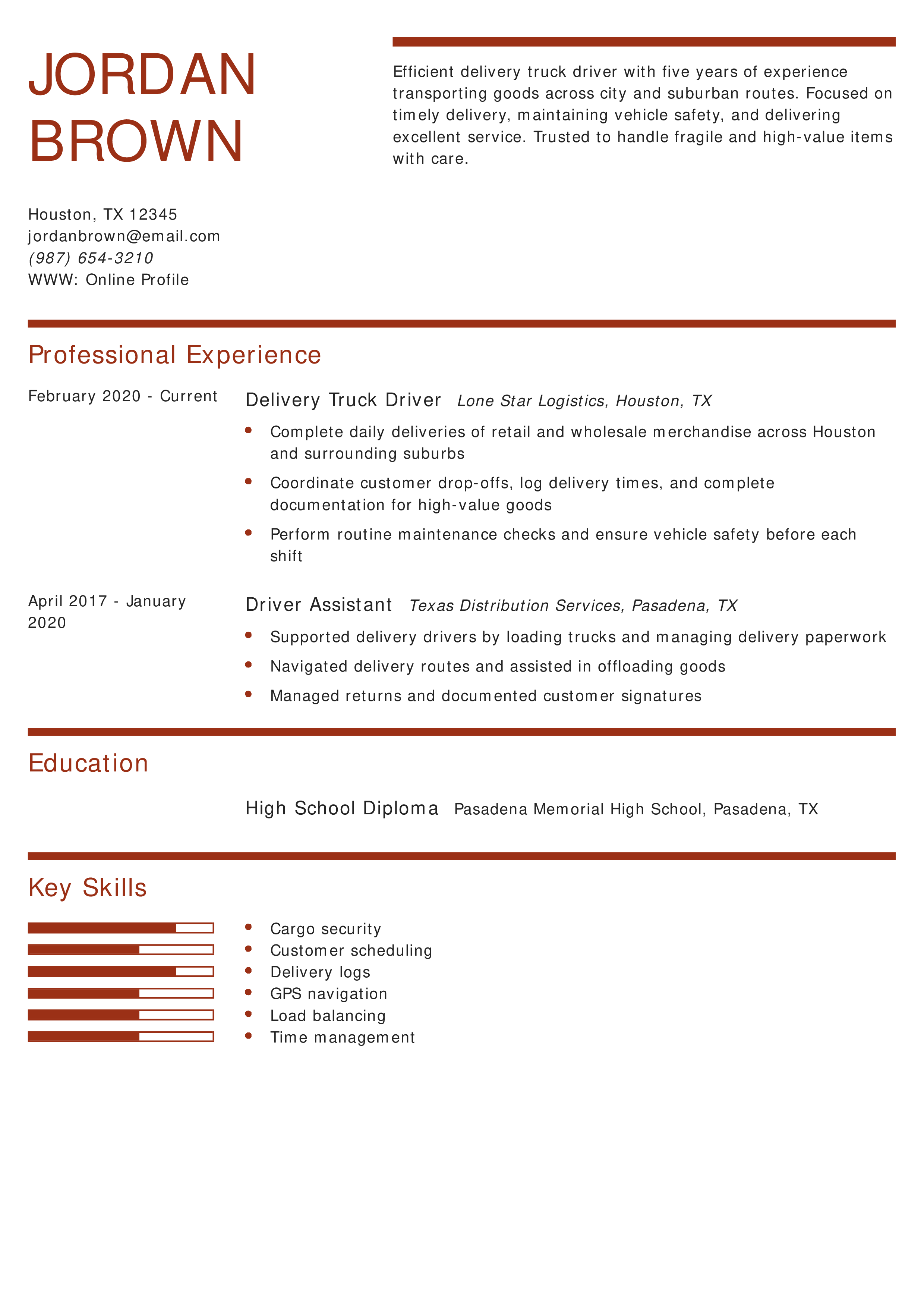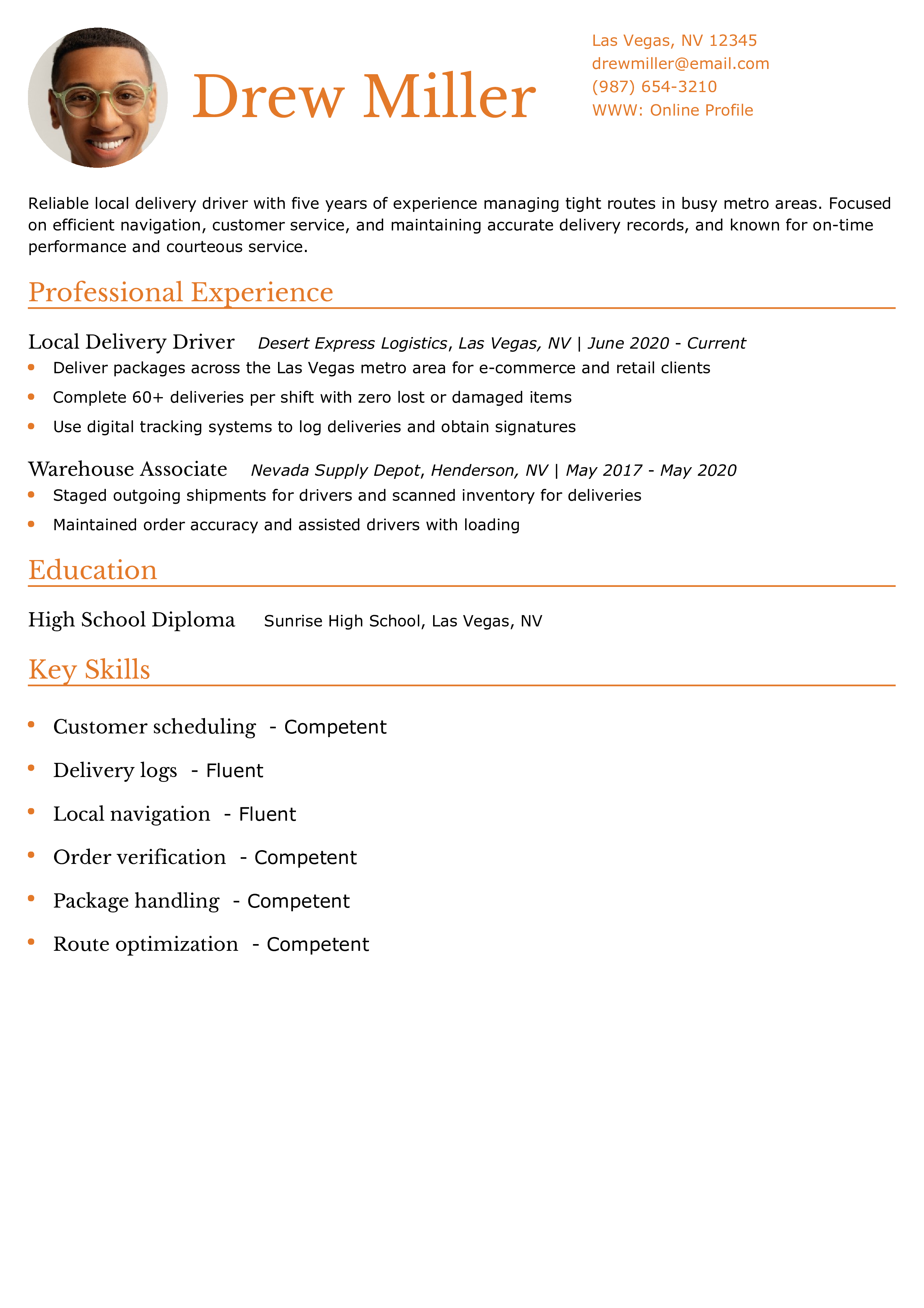 This resume shows consistency and route mastery. It reflects reliability, speed, and accuracy — key for urban delivery jobs. If you're applying for local delivery roles, check out this resource on resume skills to find other relevant skill examples.