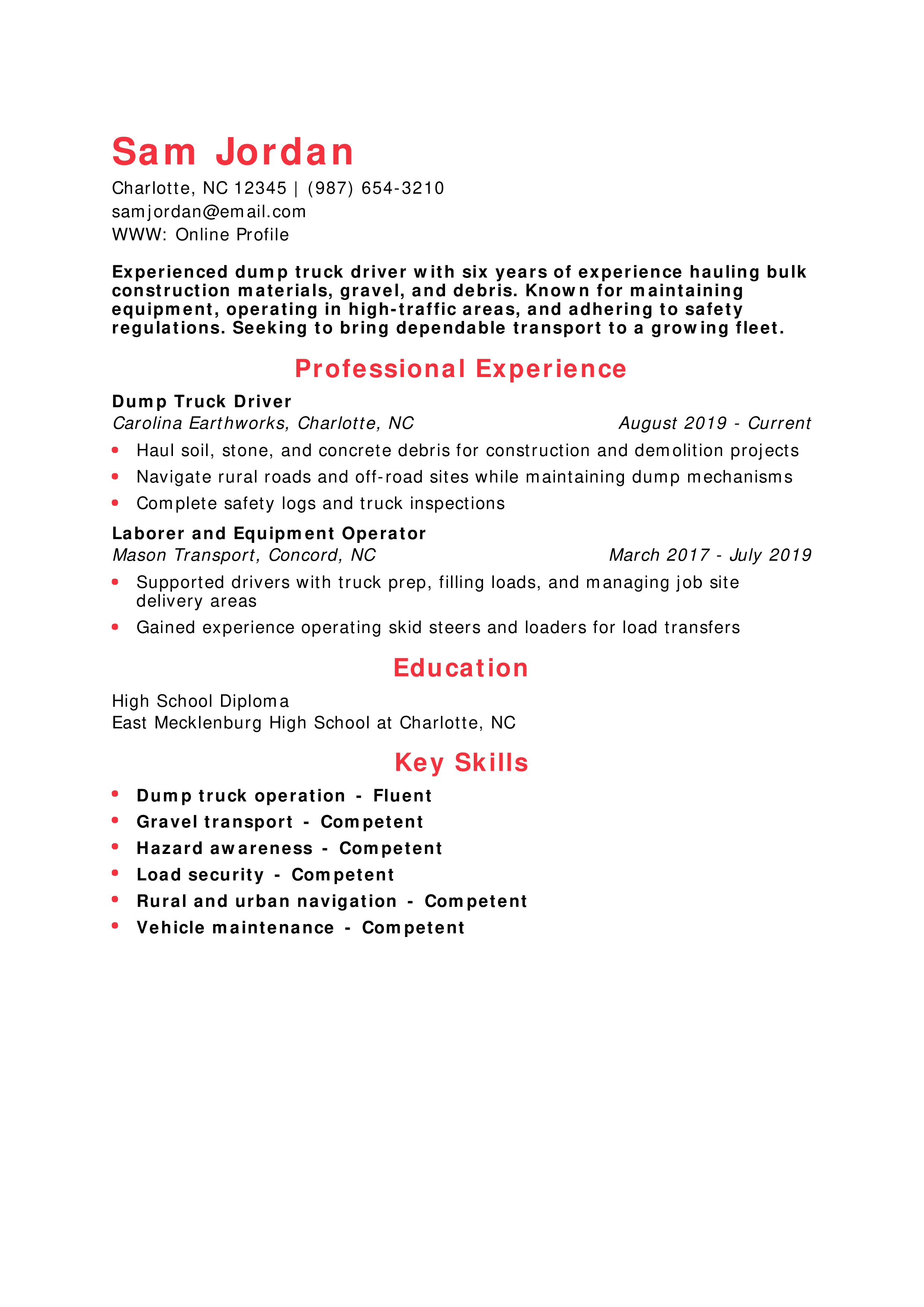 This resume combines equipment knowledge with strong safety habits, key in dump truck operations. The detailed duties match the specific role and responsibilities. Want to improve your layout? This guide on best fonts for resumes can make your resume easier to read.