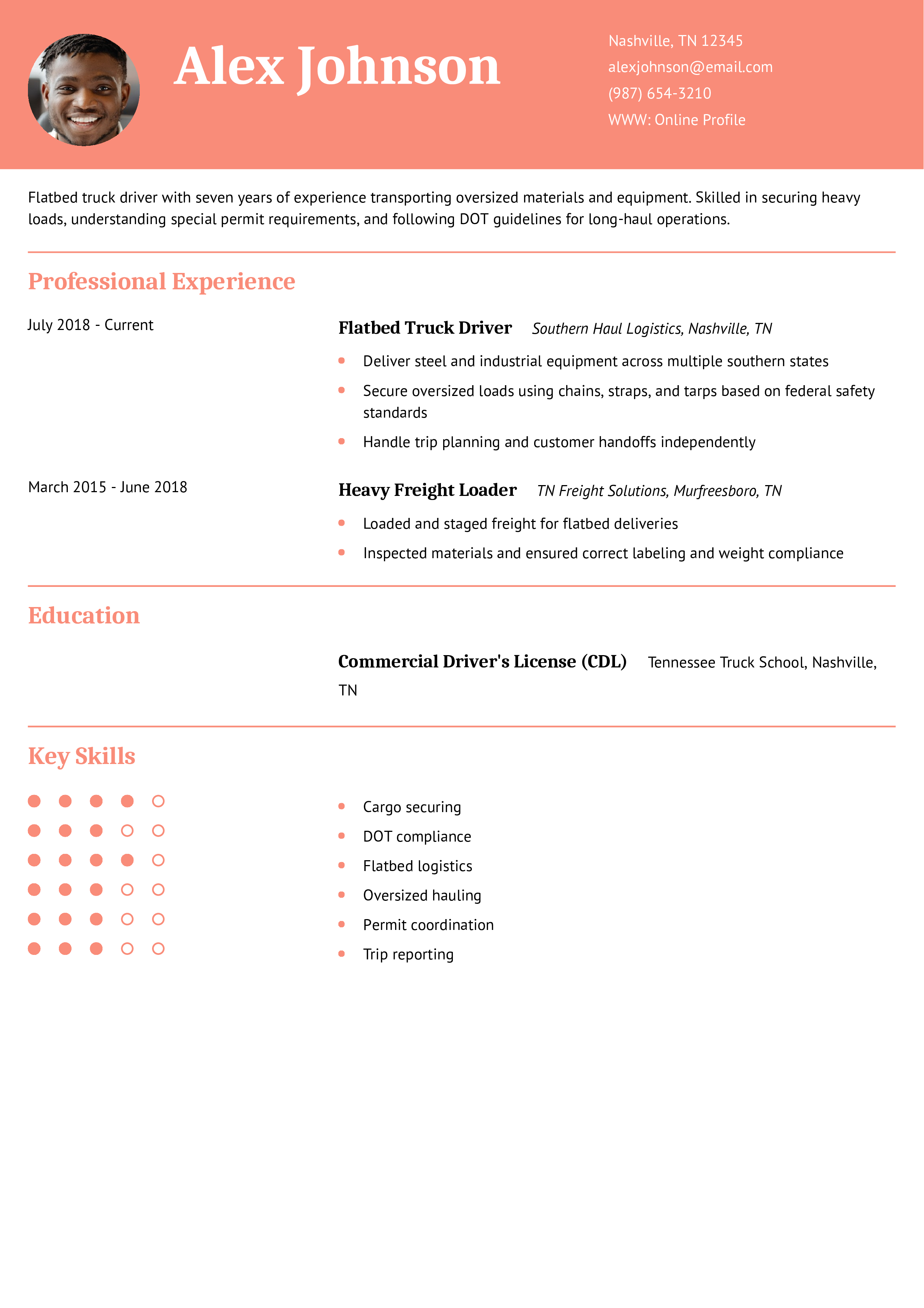 This resume focuses on flatbed experience and safety practices, which are both key for this type of role. Employers need to know you're familiar with permits and securement. Not sure where to start? Check out resume skills to help shape your list.