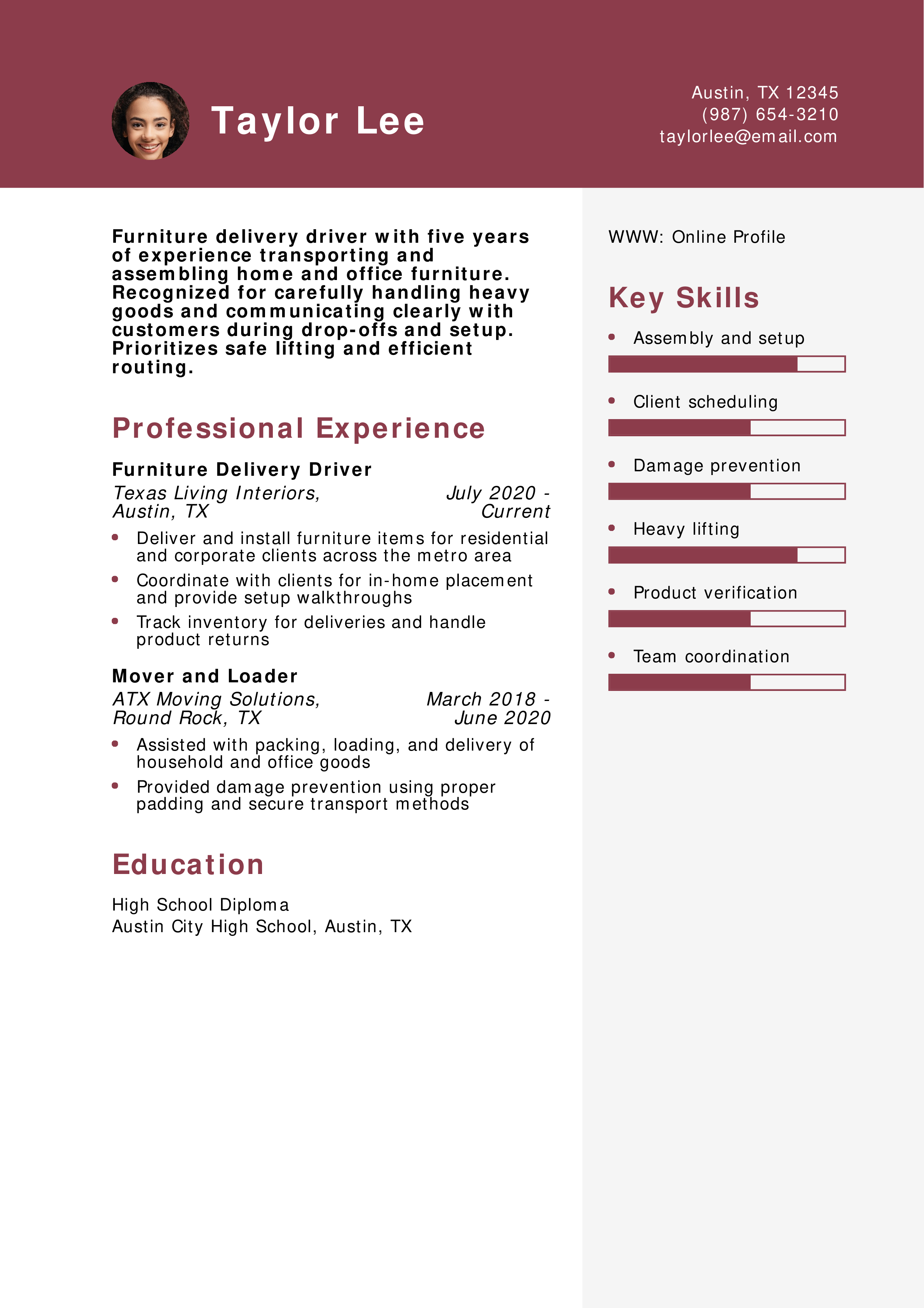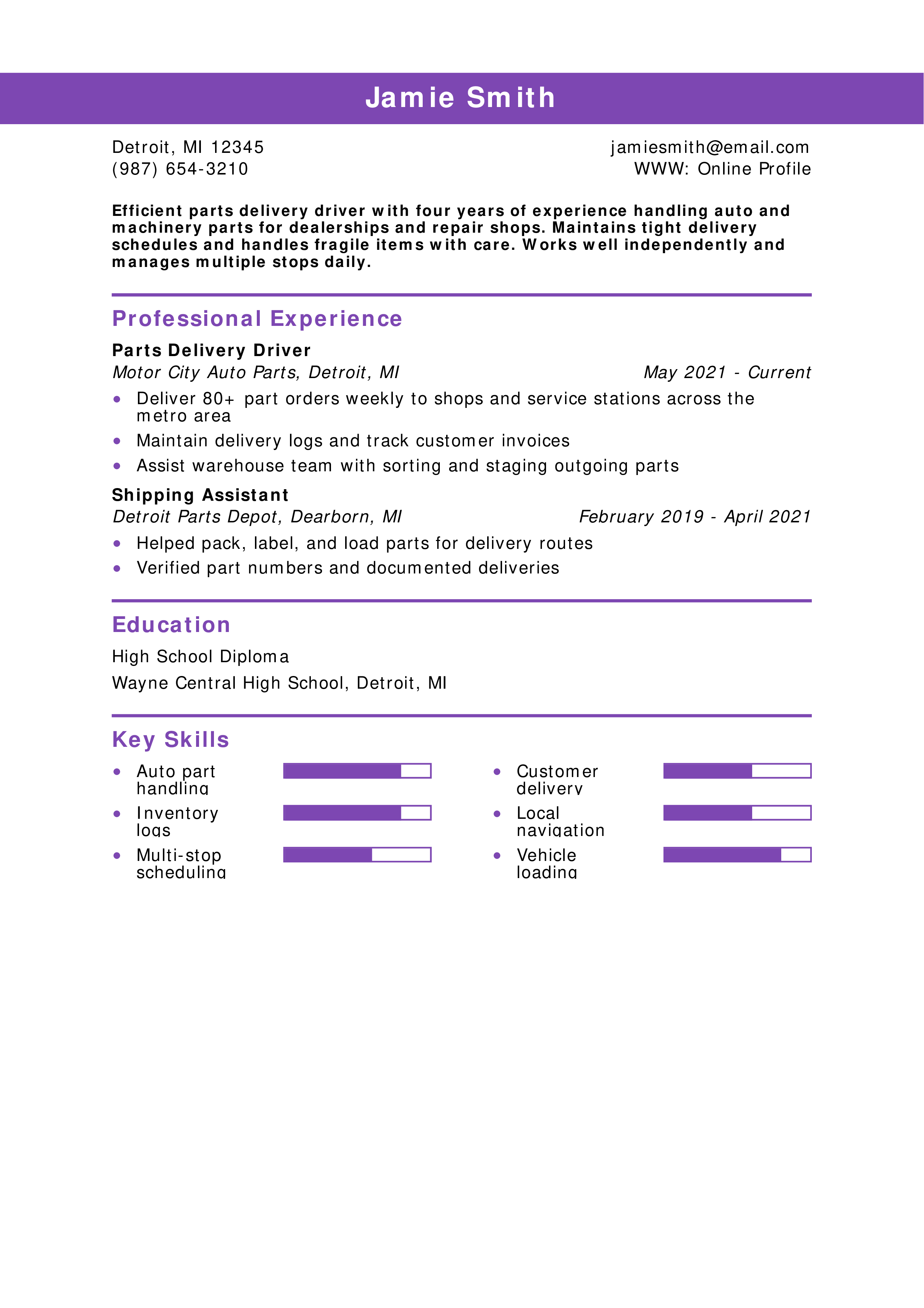 This resume is organized and reflects the fast pace and accuracy needed in auto part delivery. For help selecting skills to match the job, use this resume skills guide to align your experience with the job posting.