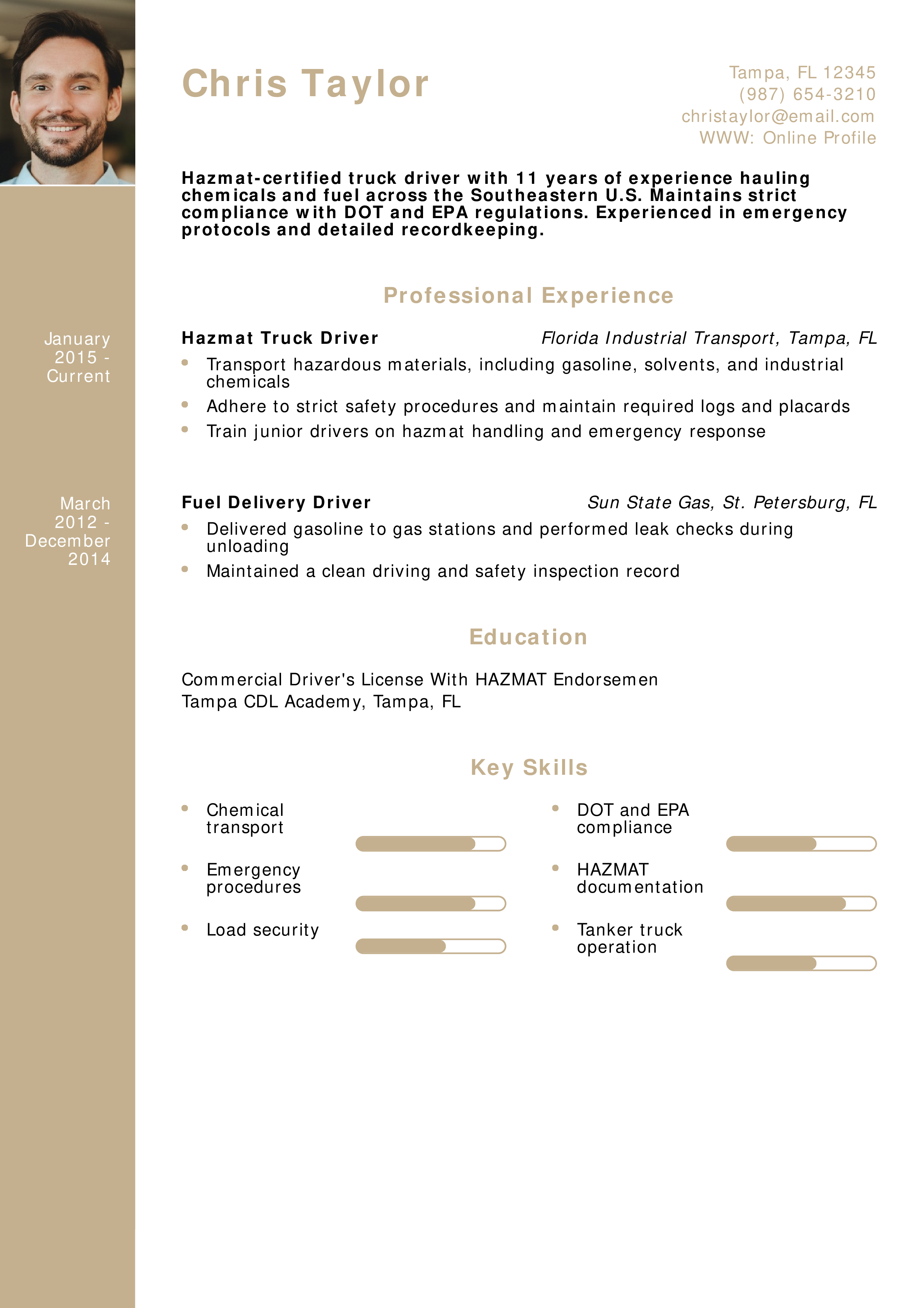 This resume stands out with safety-focused, certified experience. The endorsement shows specialization employers need. If you have specialized credentials, make sure they’re visible. For more formatting tips, visit how to list certifications on a resume.