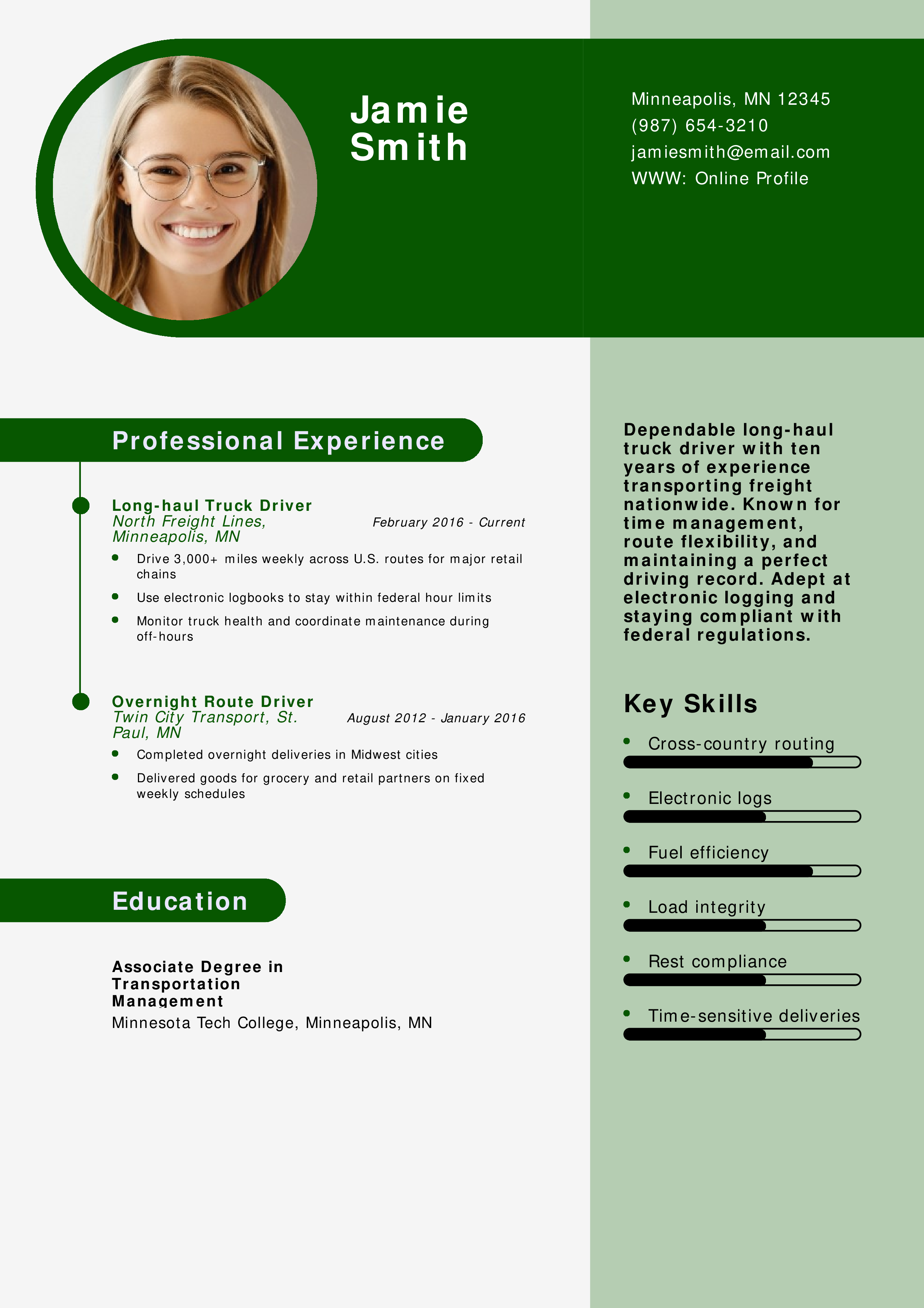 His resume is tailored for long-haul logistics and makes use of numbers and specifics to show impact. Including safety and legal compliance helps reassure employers. To learn how to refine your resume’s intro, read more on crafting strong resume objective examples.