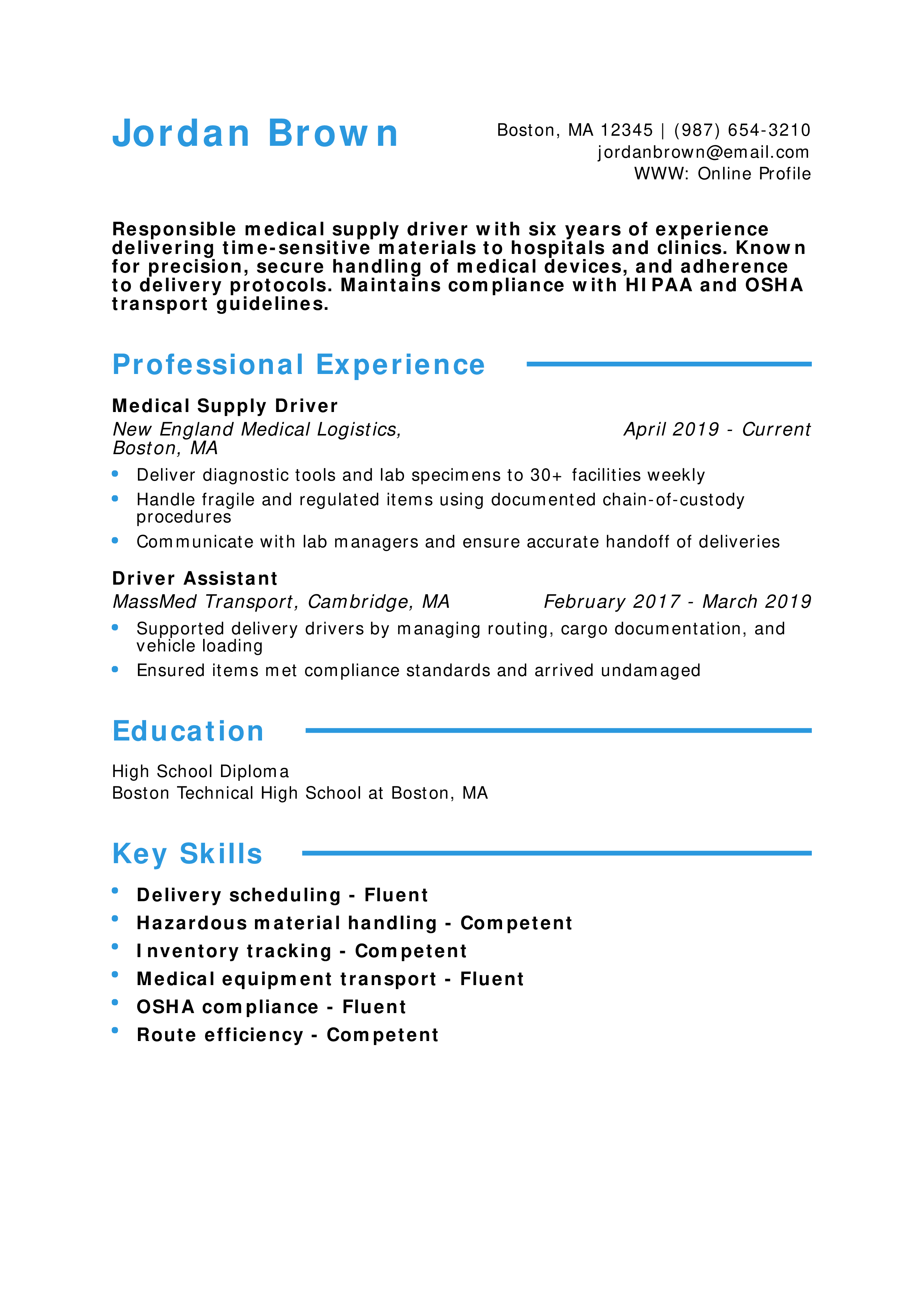 This resume is ideal for health-related delivery roles. It clearly shows a understanding of regulations and trust-sensitive materials. To learn how to highlight regulatory knowledge and specialized handling, check out how to list certifications on a resume.