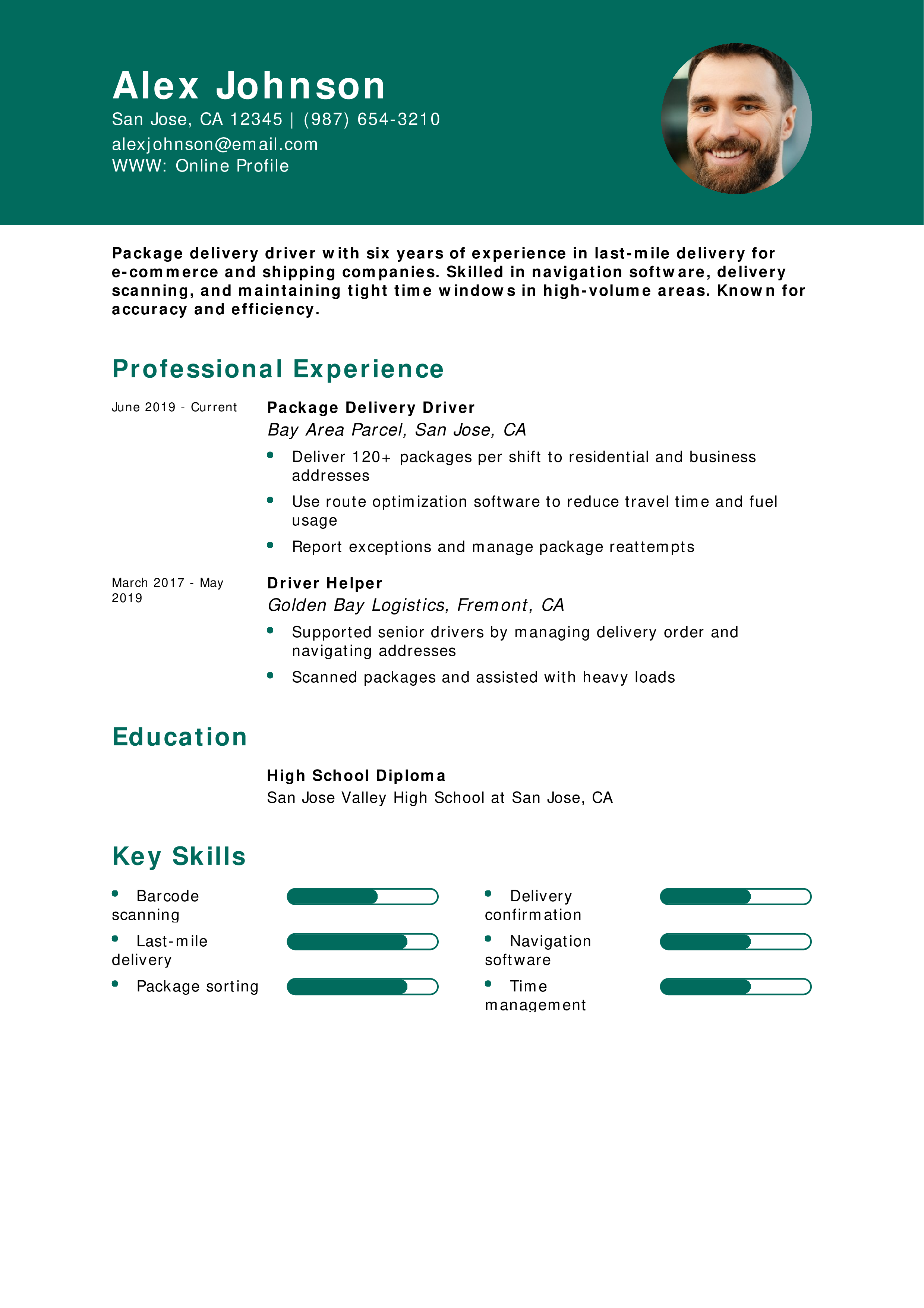 Her resume highlights speed and accuracy, key in package delivery jobs. It also reflects adaptability and use of modern tools. Want to make your resume easier to read? Learn more about selecting the best font for resumes.