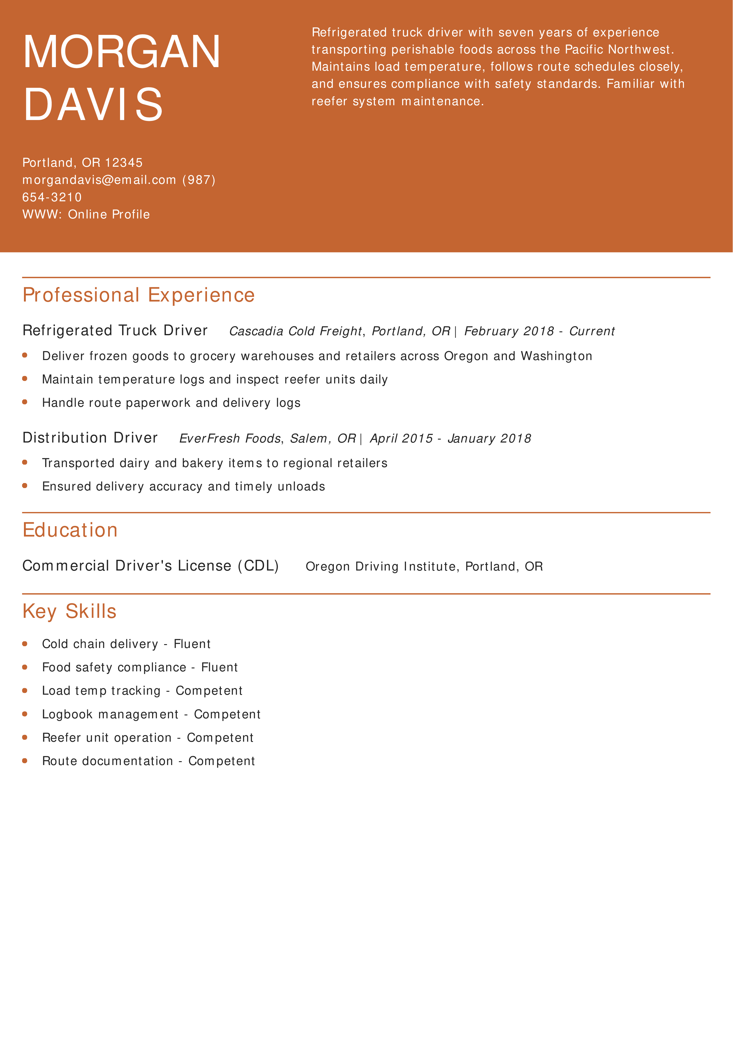 His resume focuses on refrigerated delivery and compliance with food handling regulations. It clearly communicates technical skills in reefer operation. Want to include specialized equipment in your resume? Check out technical skills for resumes.