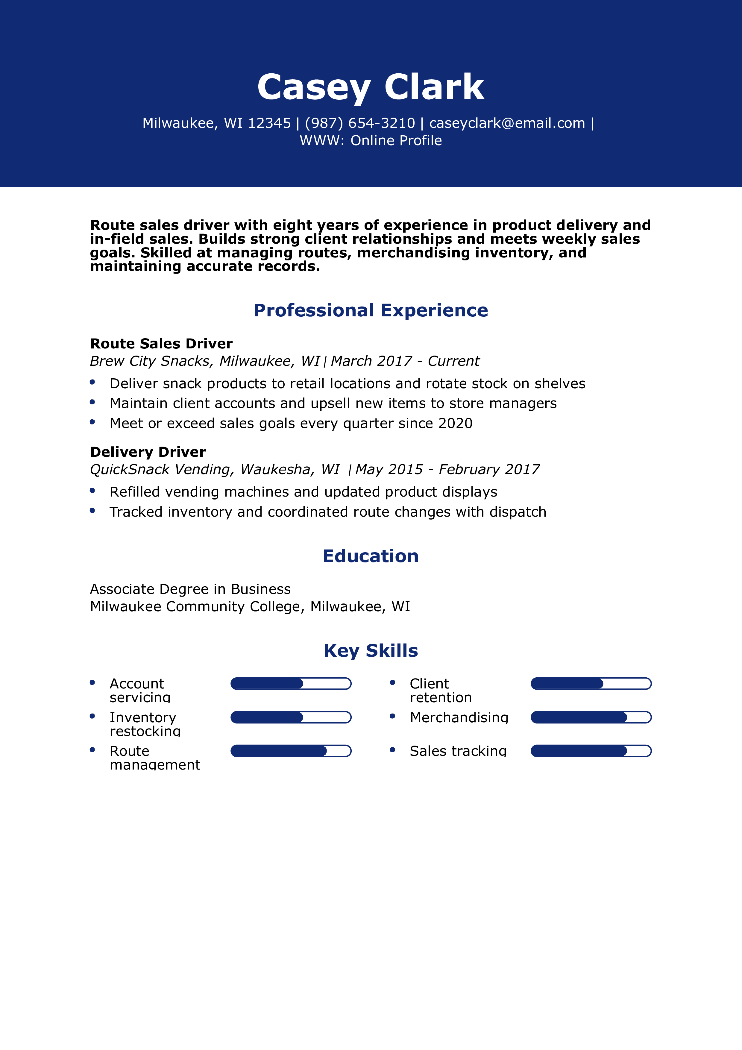 This resume combines driving and sales responsibilities — ideal for hybrid roles like route sales. The mention of sales goals shows performance. Learn more about how to include sales achievements in your resume with this article on how to list references on a resume.