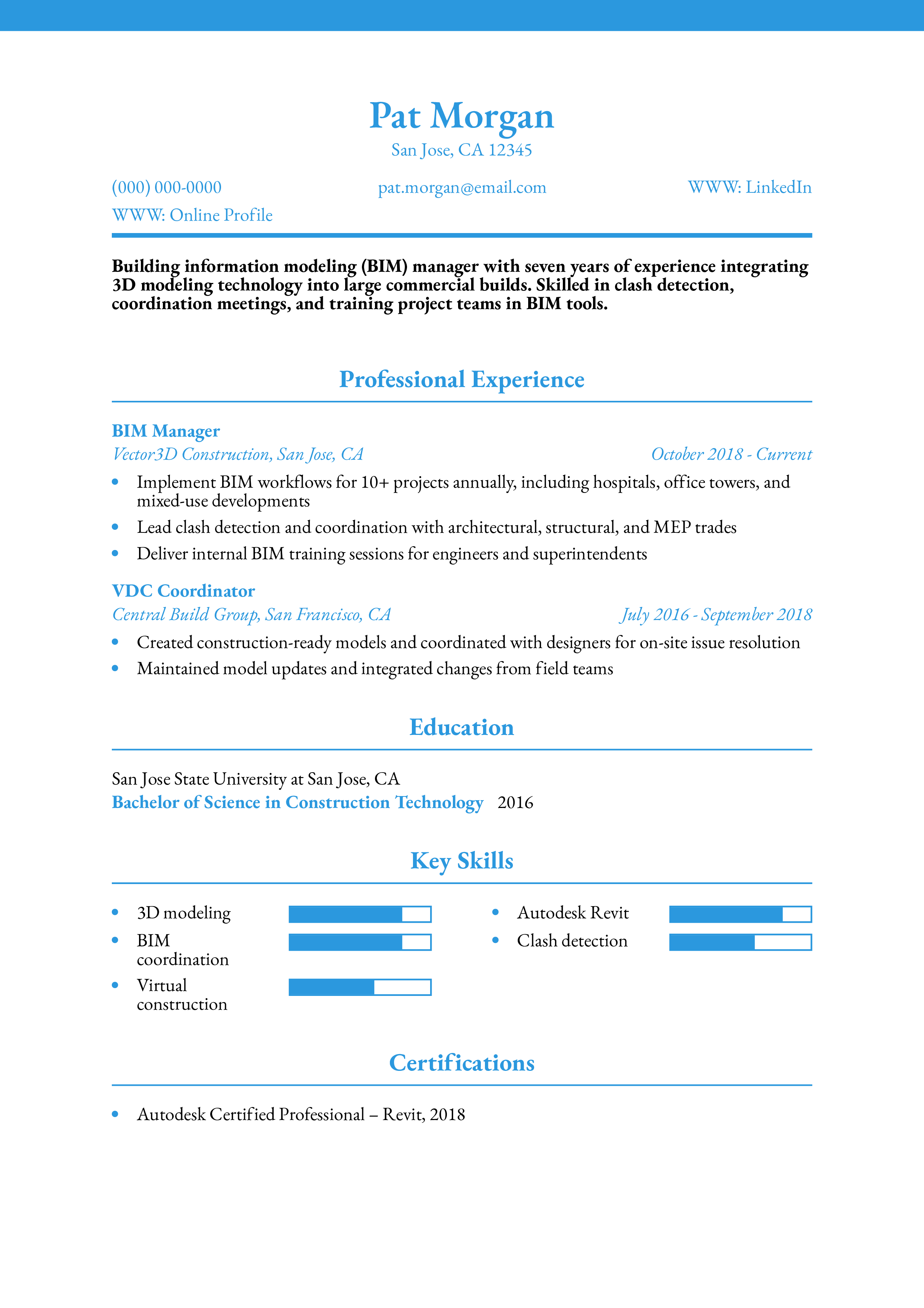 This resume demonstrates modern construction expertise and showcases technical leadership. BIM professionals are in high demand, and this candidate communicates their value clearly. Learn how to spotlight technical specialties with technical skills for a resume.