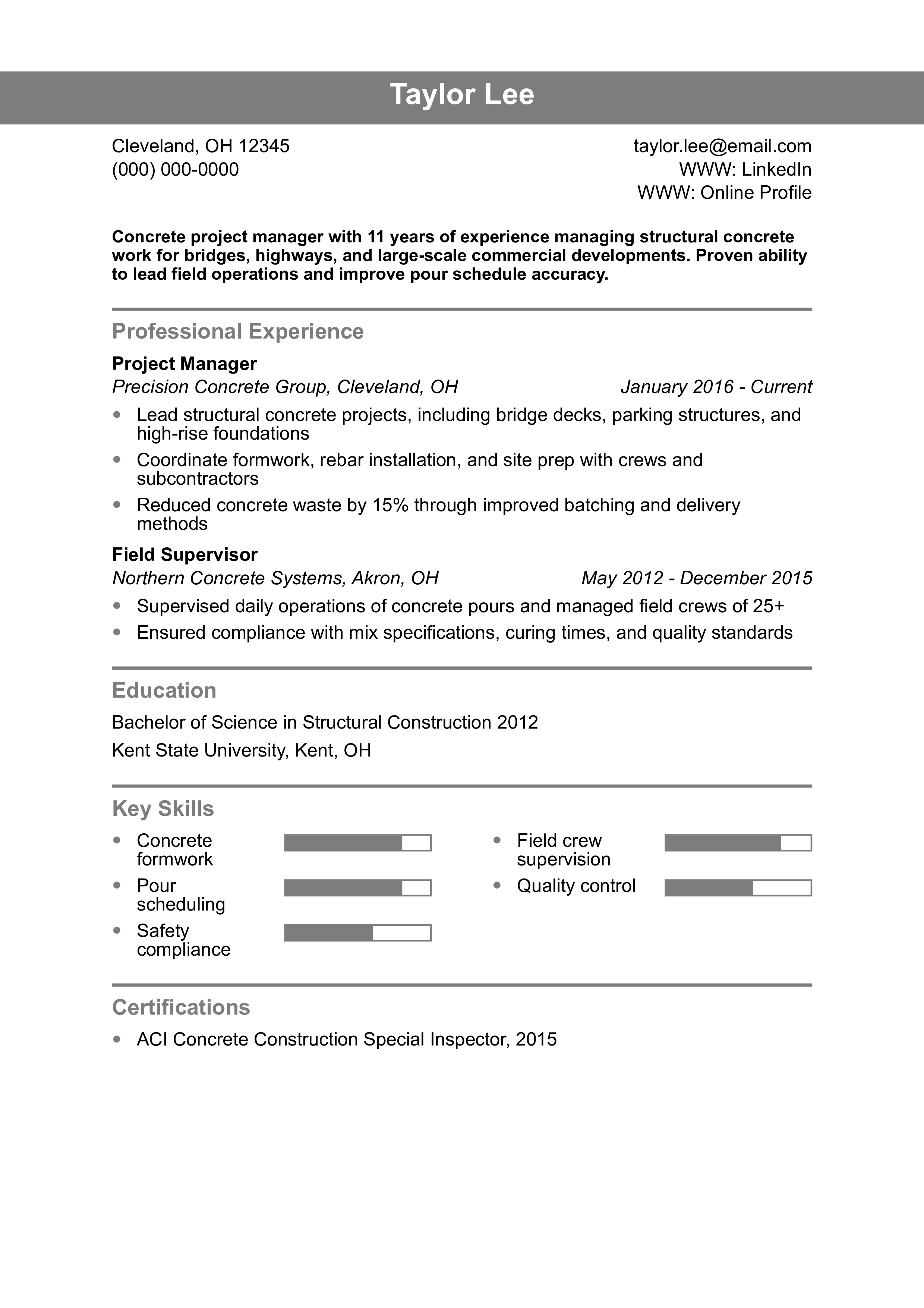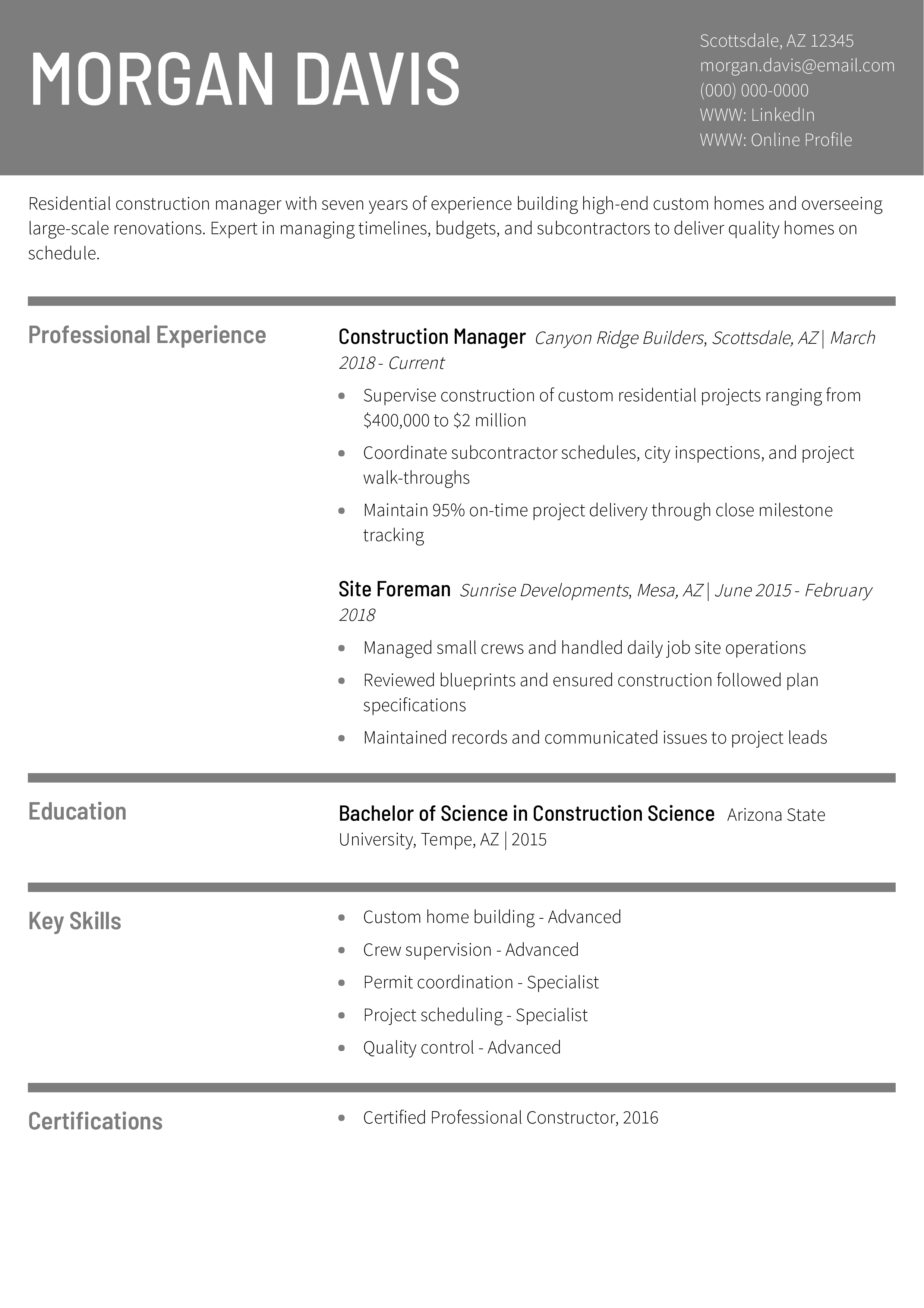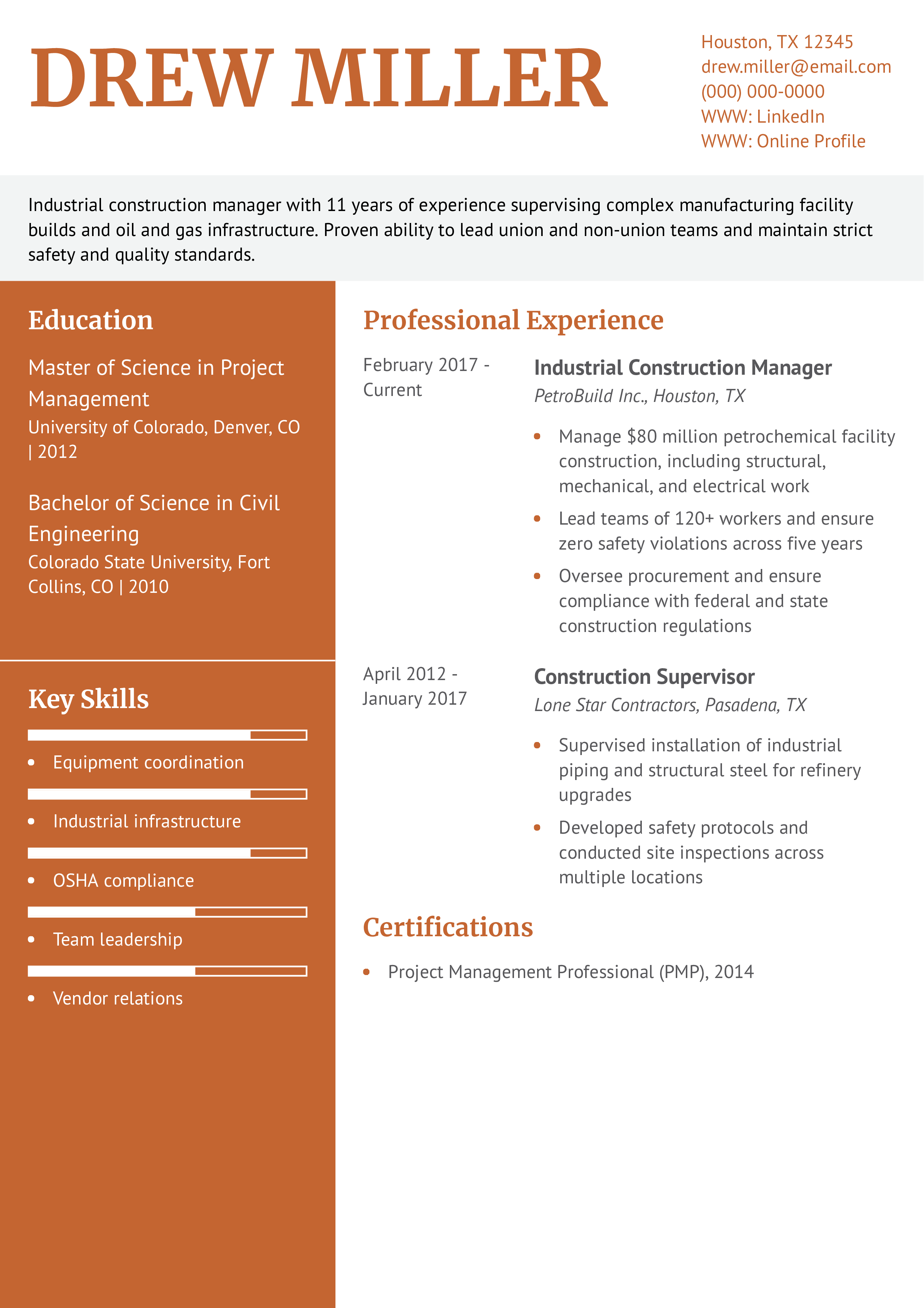 For example, if an organization strongly emphasizes its safety culture, you’d showcase accomplishments related to reducing safety incidents and providing OSHA training. If a company values cross-functional leadership, highlight your experience working with architects, clients, and third parties to execute construction projects. Always place relevant achievements and qualifications closer to the top of your document.