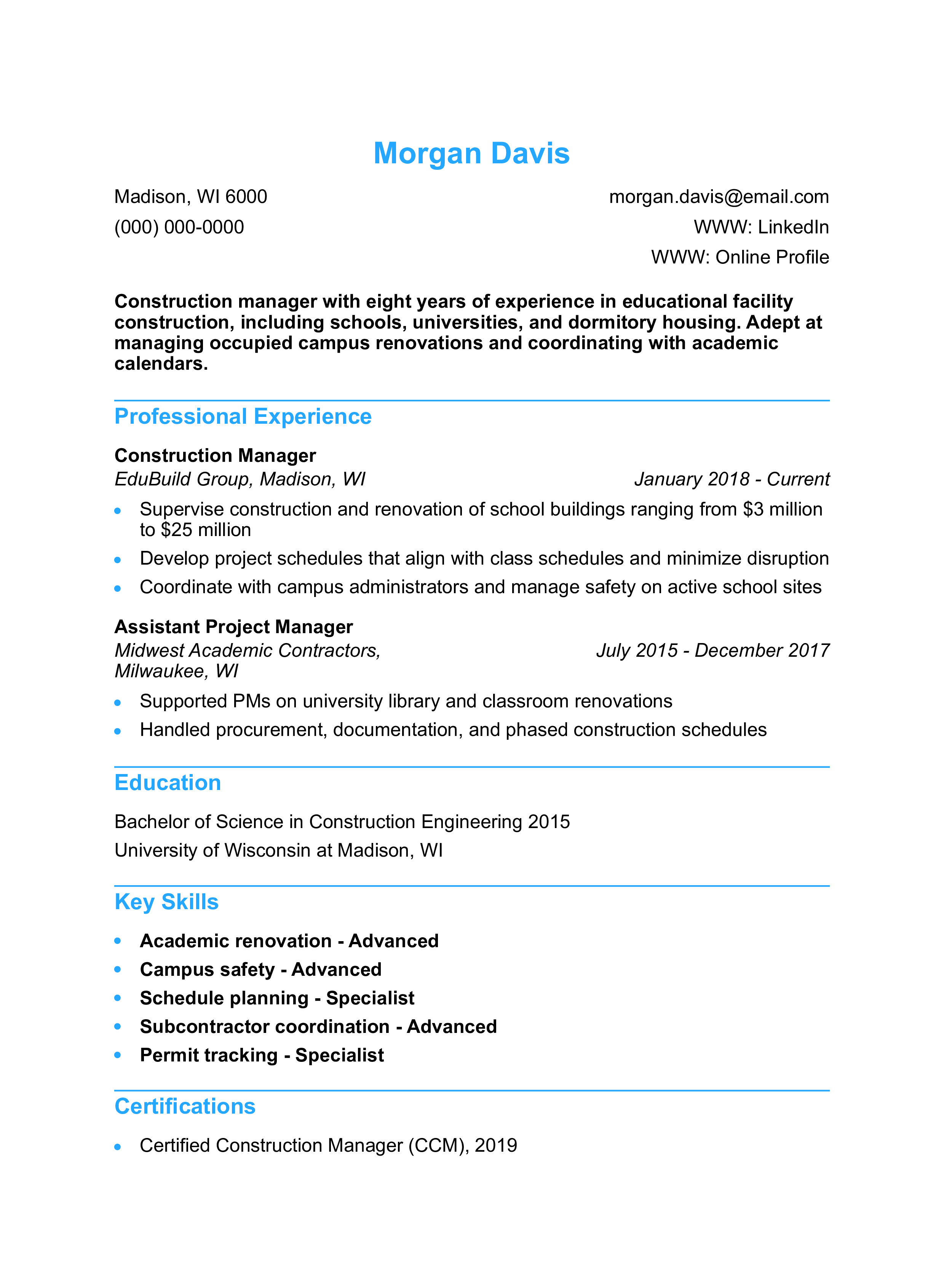Education Facility Construction Manager Resume