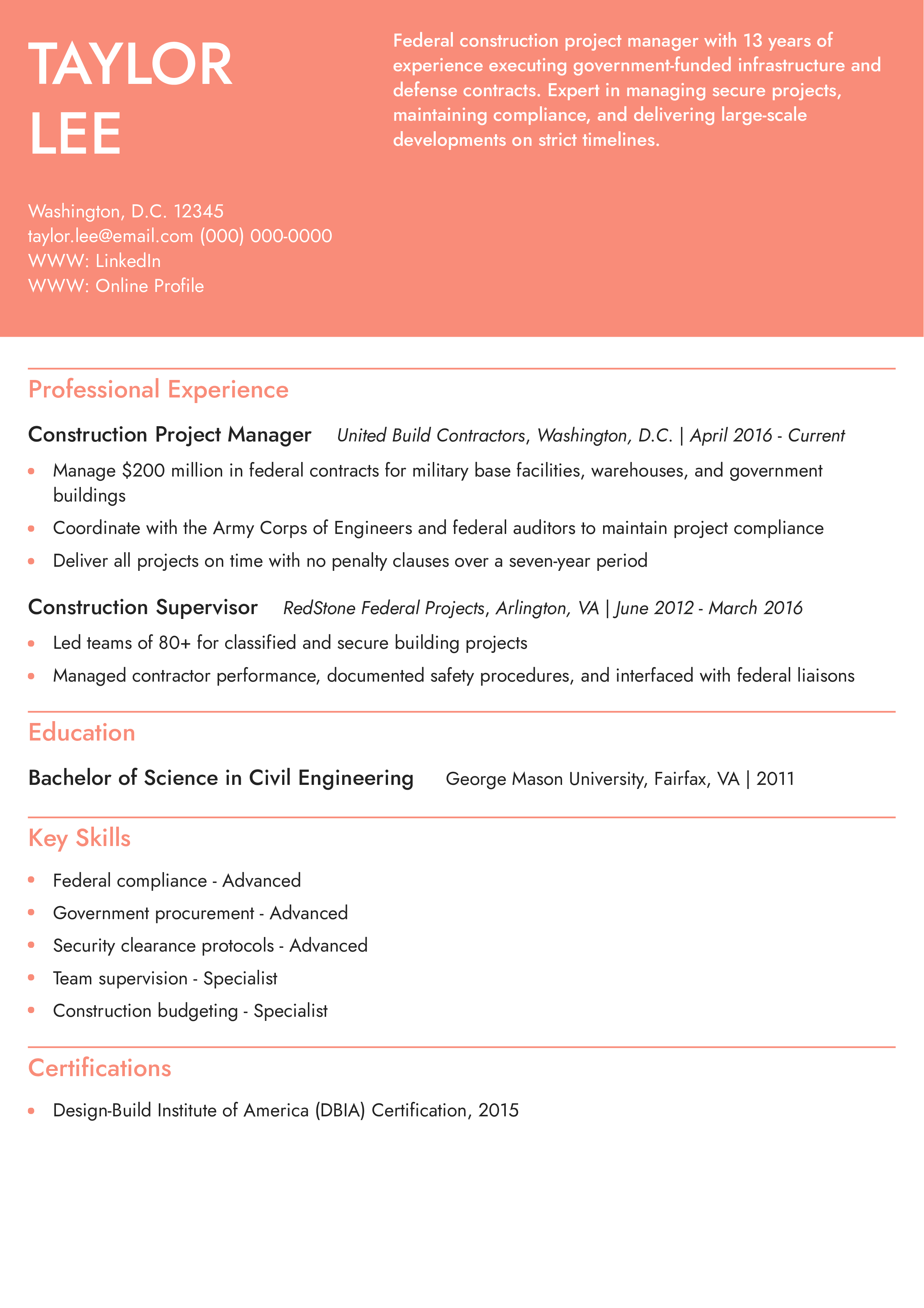 This resume presents a strong program-level perspective for construction, with a balance of strategy and execution. The focus on high-value projects and public sector experience strengthens its appeal. Read more about effective resume outline examples.