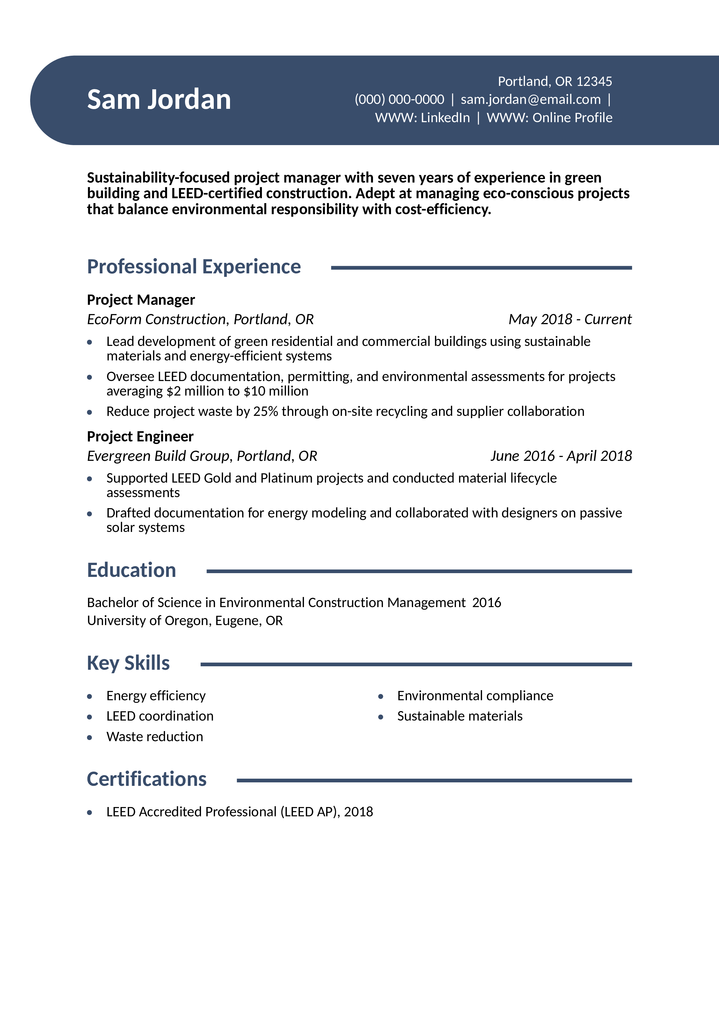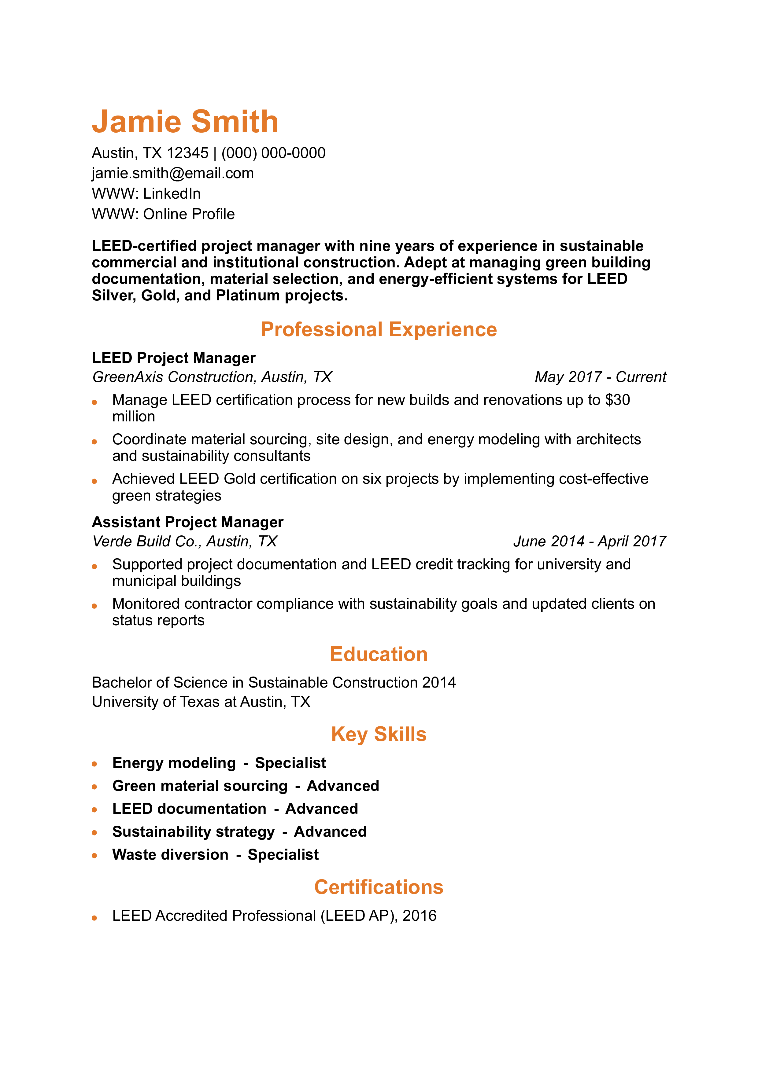 This resume effectively conveys a niche skill set in sustainable construction. It’s tailored toward green building projects and certifications. Learn more about highlighting specialty experience in CV vs. resume.