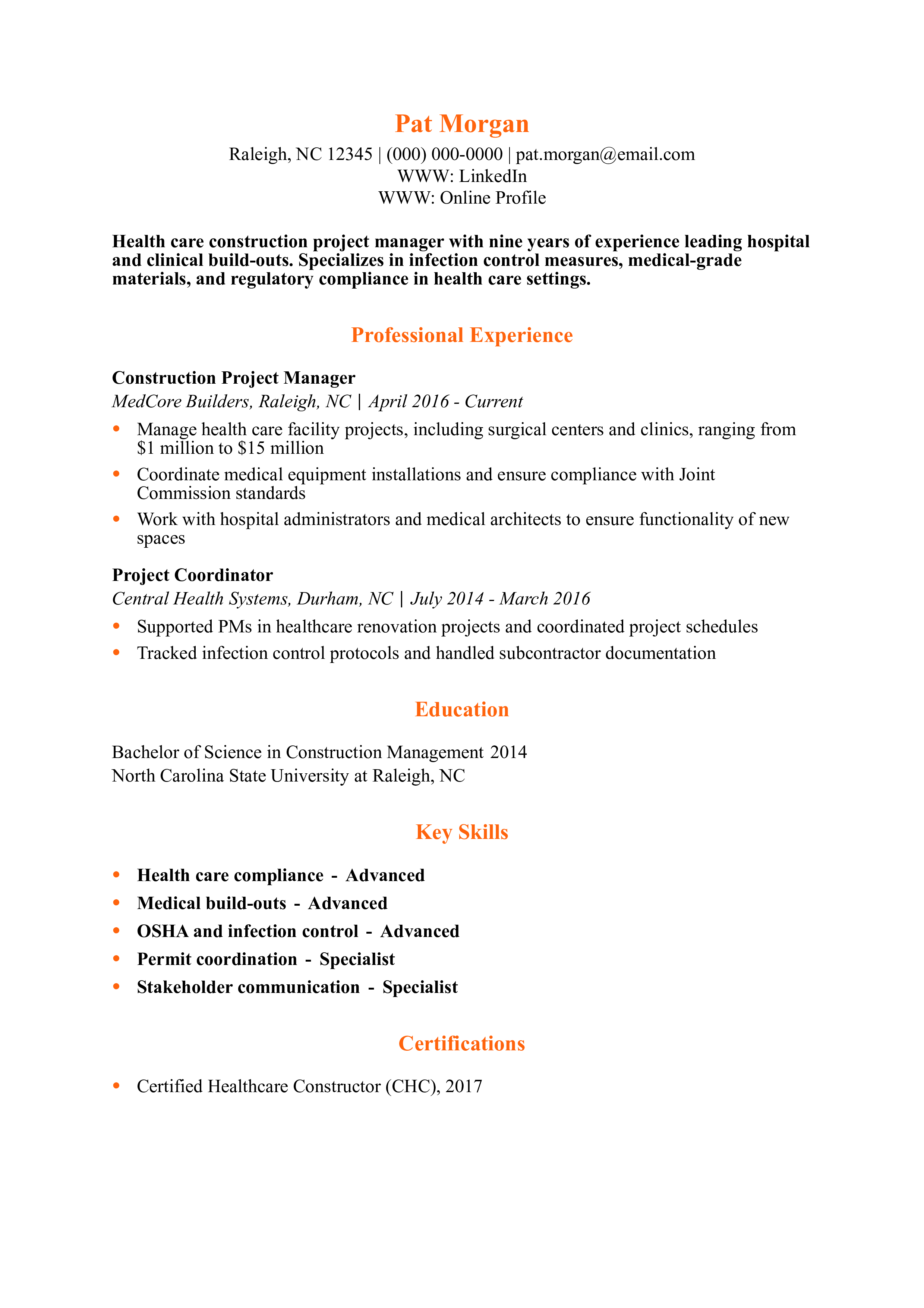 This resume shows deep industry-specific knowledge in health care construction, which requires attention to detail and specialized compliance. For more advice, visit how to list certifications on a resume.