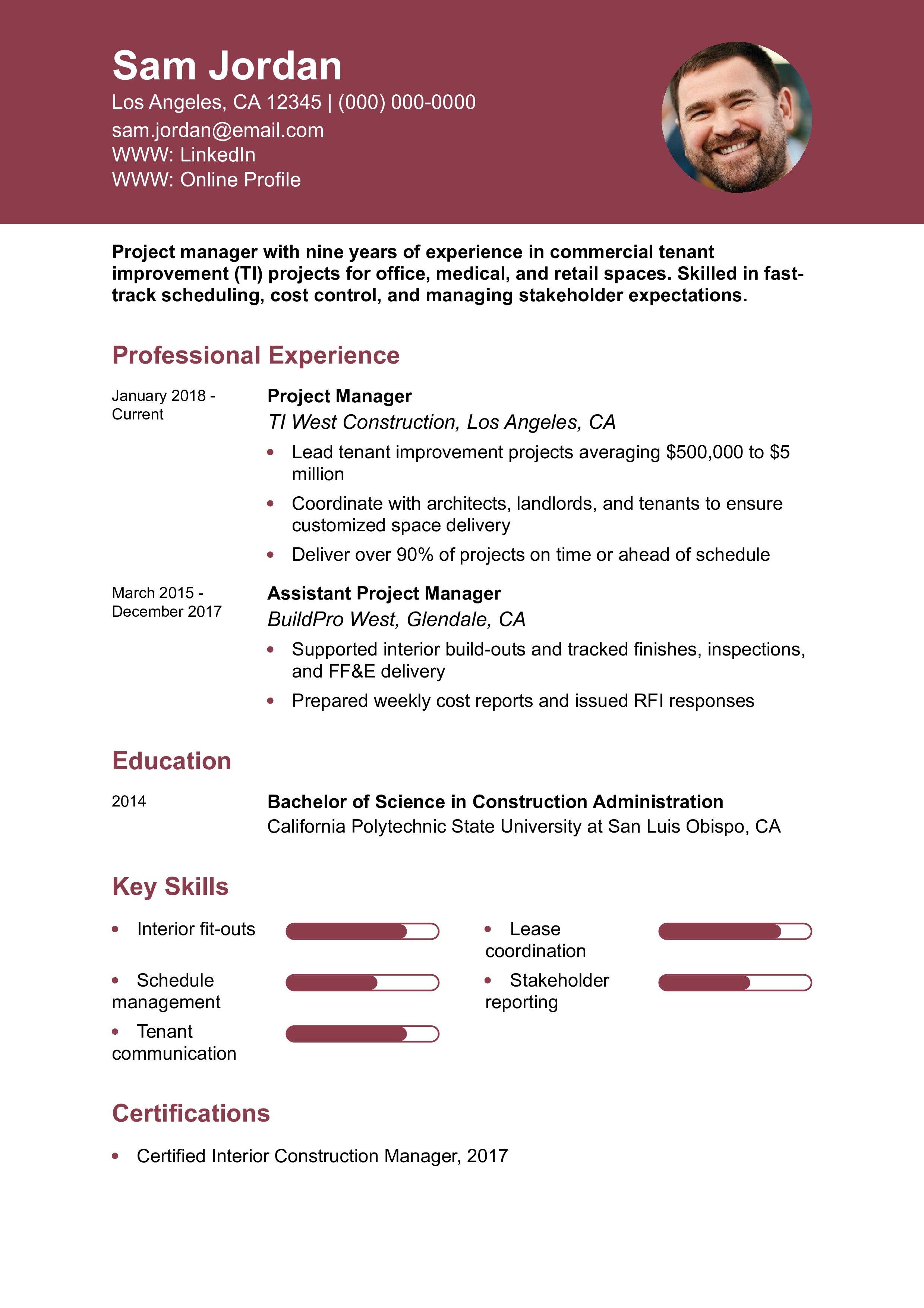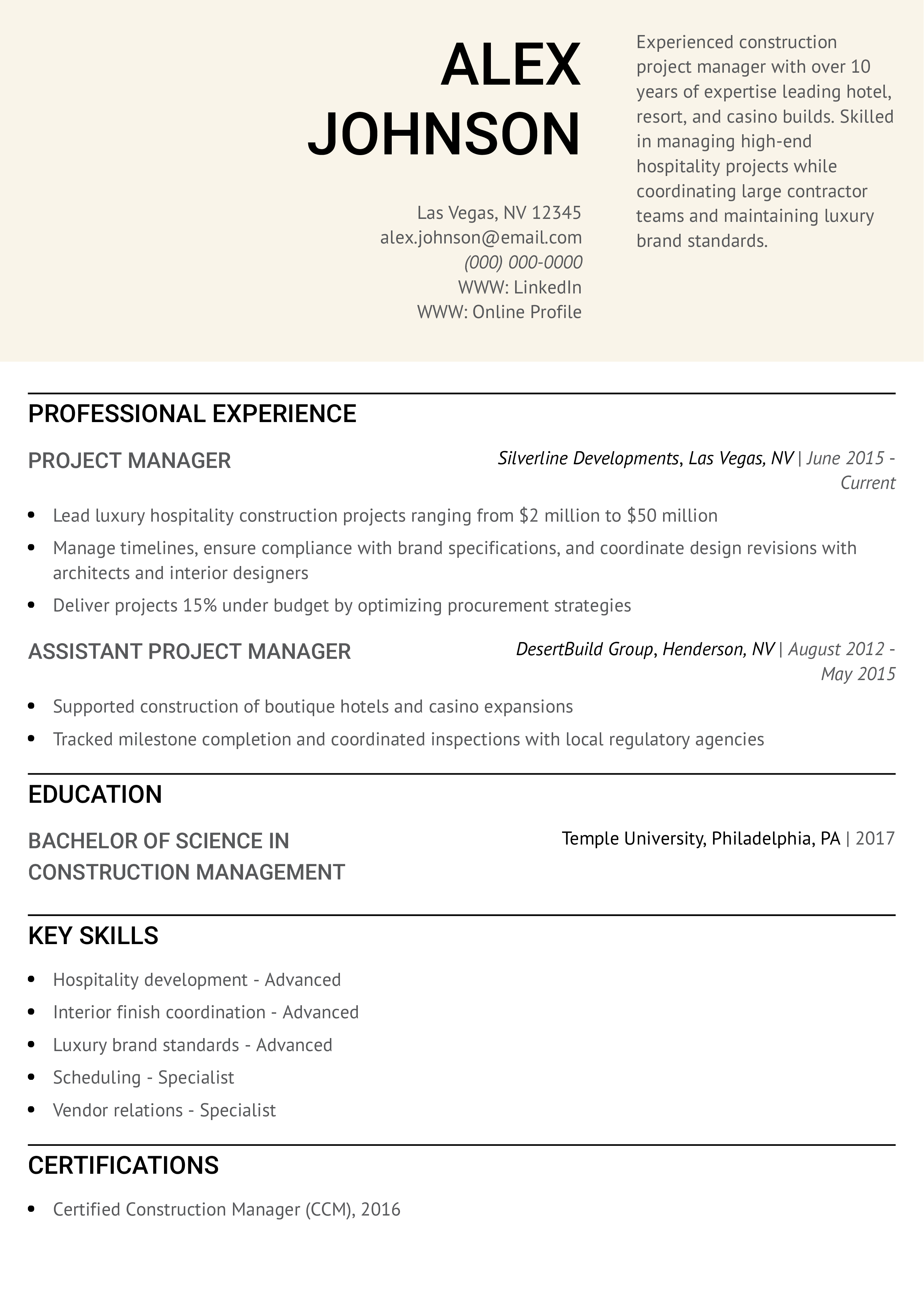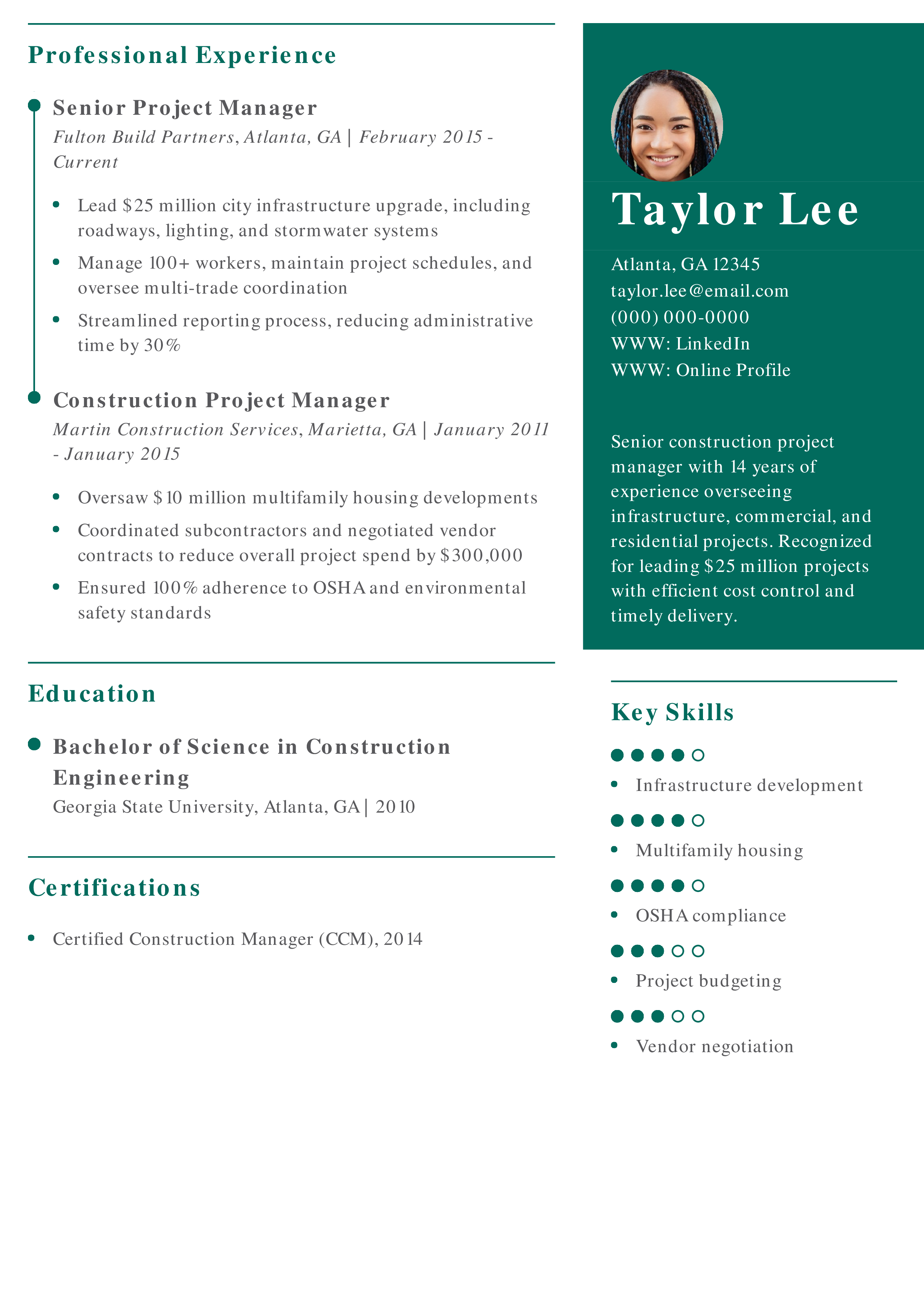 “Construction project managers must demonstrate control over timelines, budgets, and safety. Your resume should clearly show how you deliver results on complex, high-stakes builds.”