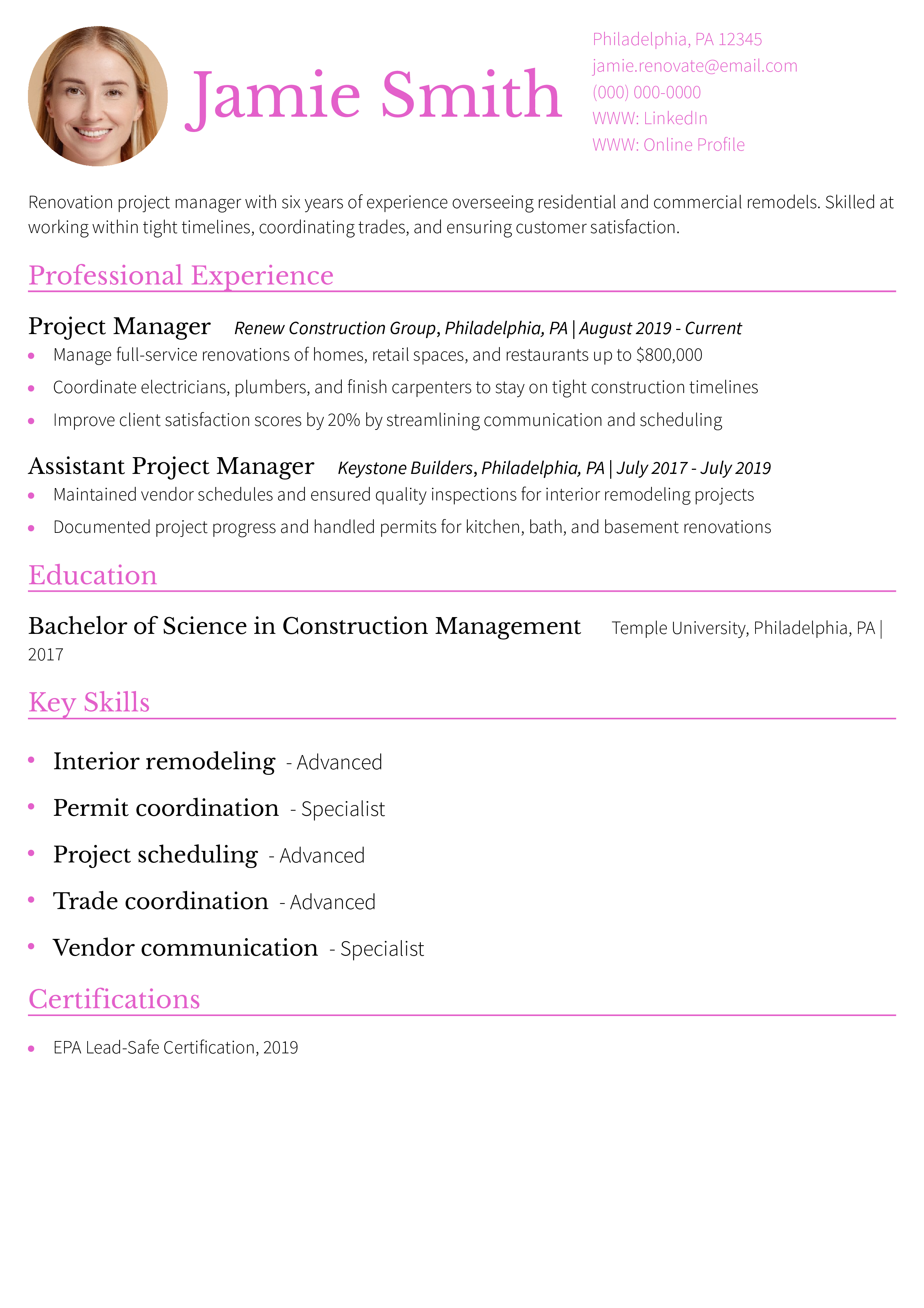 This resume is effective because it’s tailored to renovation work, which has different rhythms and client interactions than new builds. For more, read about how to write a strong resume objective.