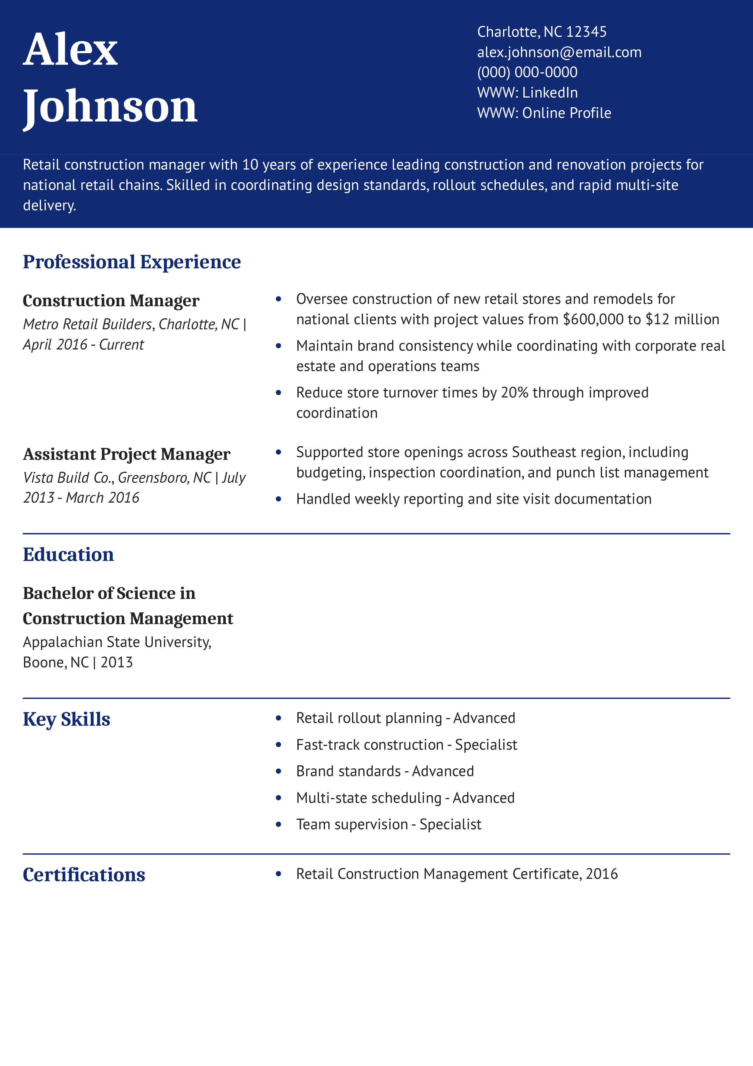 This resume effectively targets high-volume retail construction and emphasizes fast delivery and coordination. It reflects a strong understanding of corporate requirements. Learn how to adapt content for similar industries in what to put on a resume.