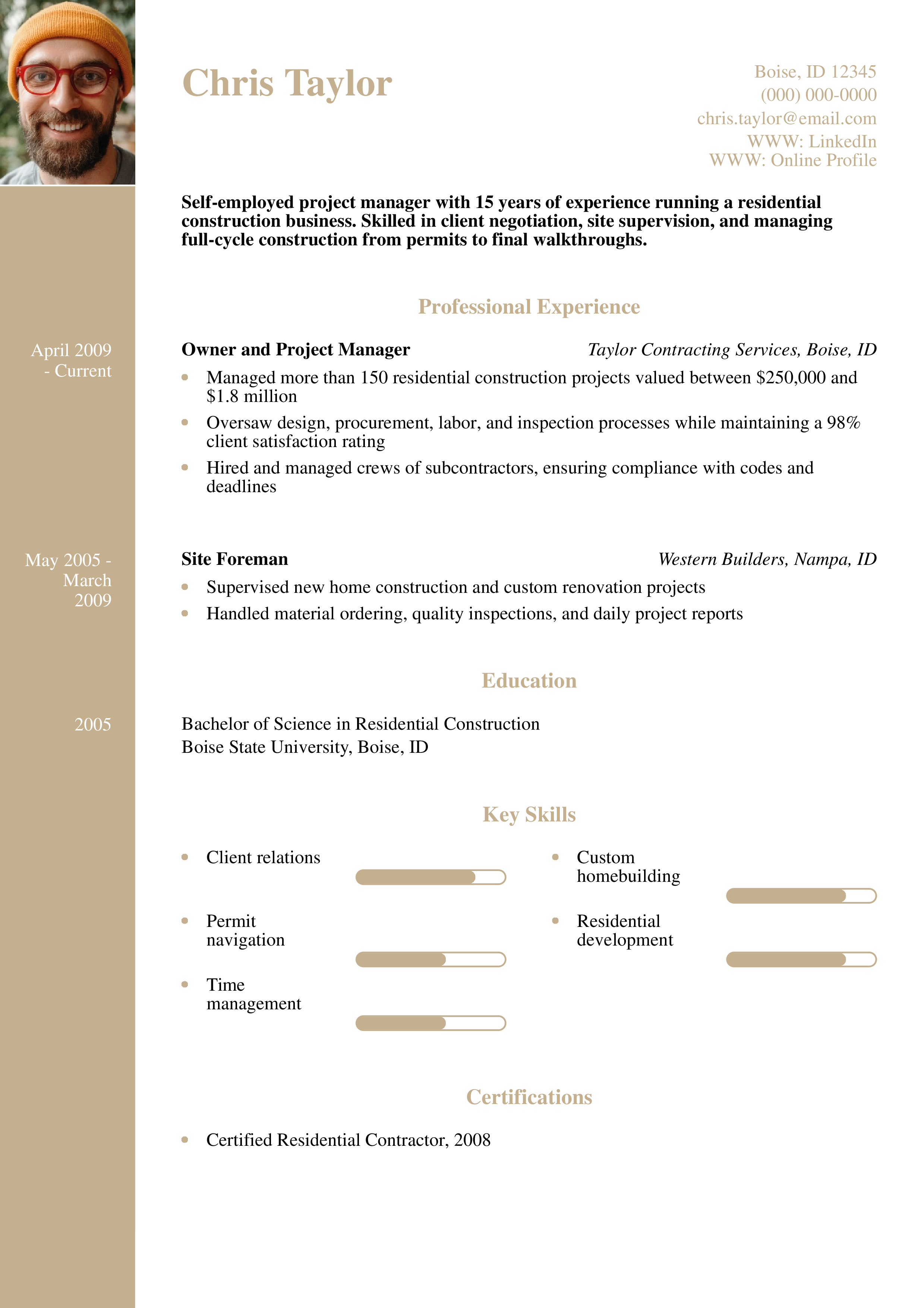 This resume illustrates a clear career progression and strong hands-on experience in residential construction. Using stats like 95% on-time delivery adds impact. Learn how to highlight relevant resume skills.