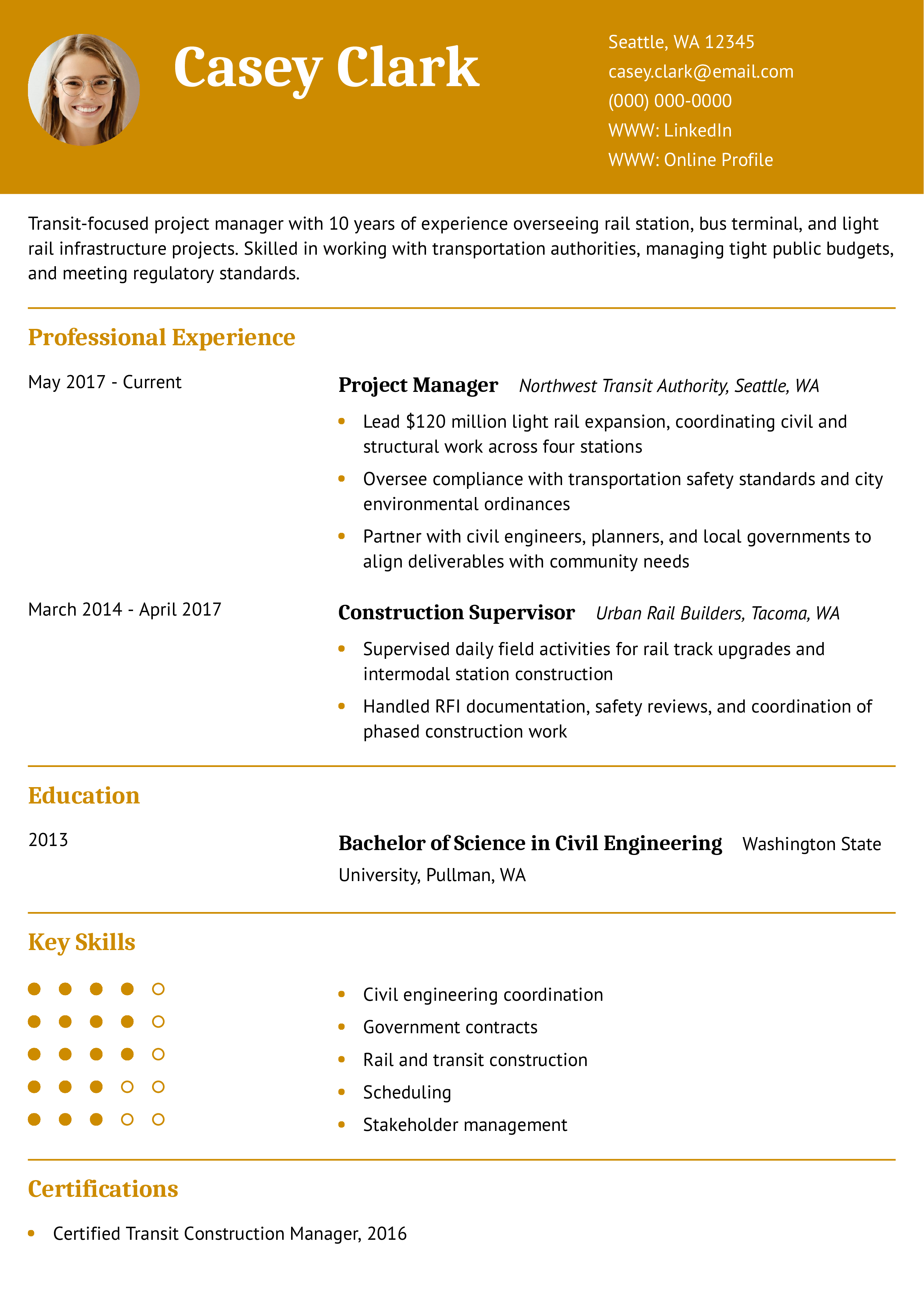 This resume highlights transit-specific expertise and showcases collaboration with public stakeholders. It clearly conveys the candidate’s experience with high-value infrastructure builds. For more, explore how to align experience with complex roles using resume outline examples.