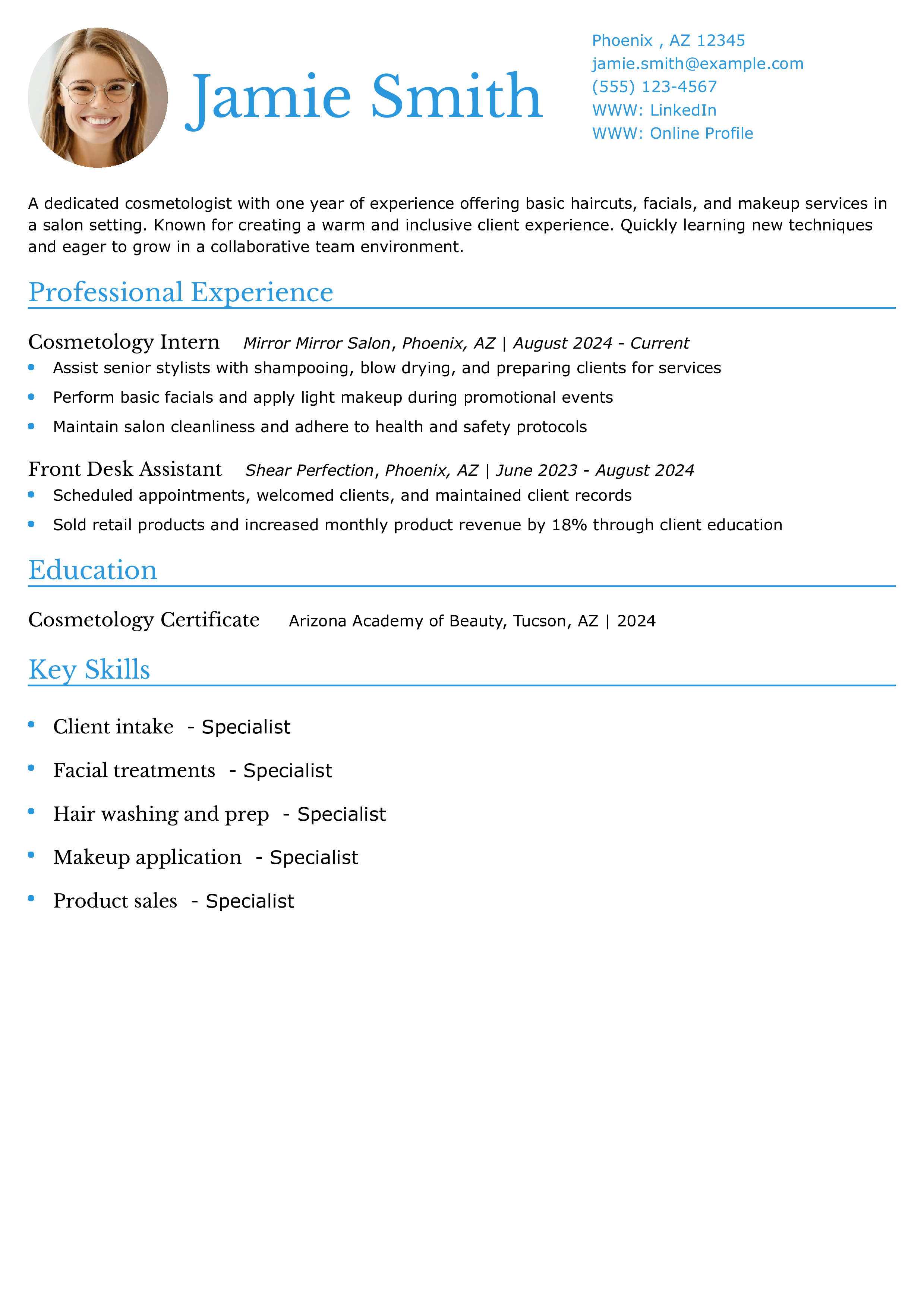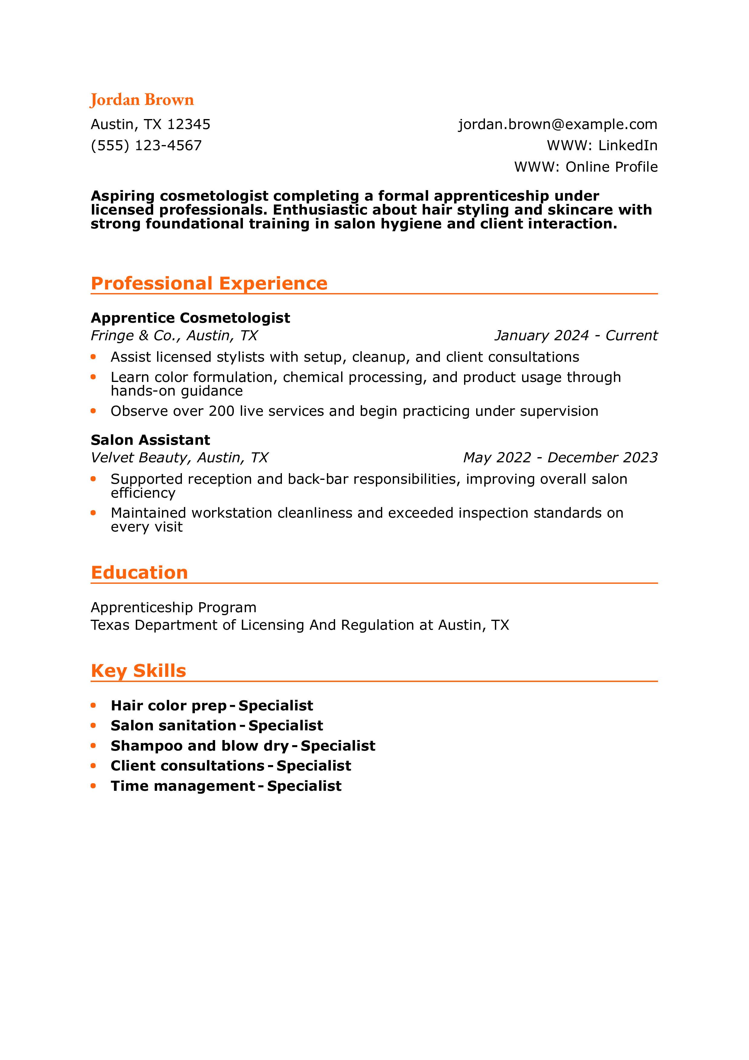 This resume shows a clear progression into the field, starting with front desk work and evolving into hands-on cosmetology. The candidate demonstrates initiative and an eagerness to learn — key traits for entry-level professionals. To make your resume more impactful, check out how to make a resume.