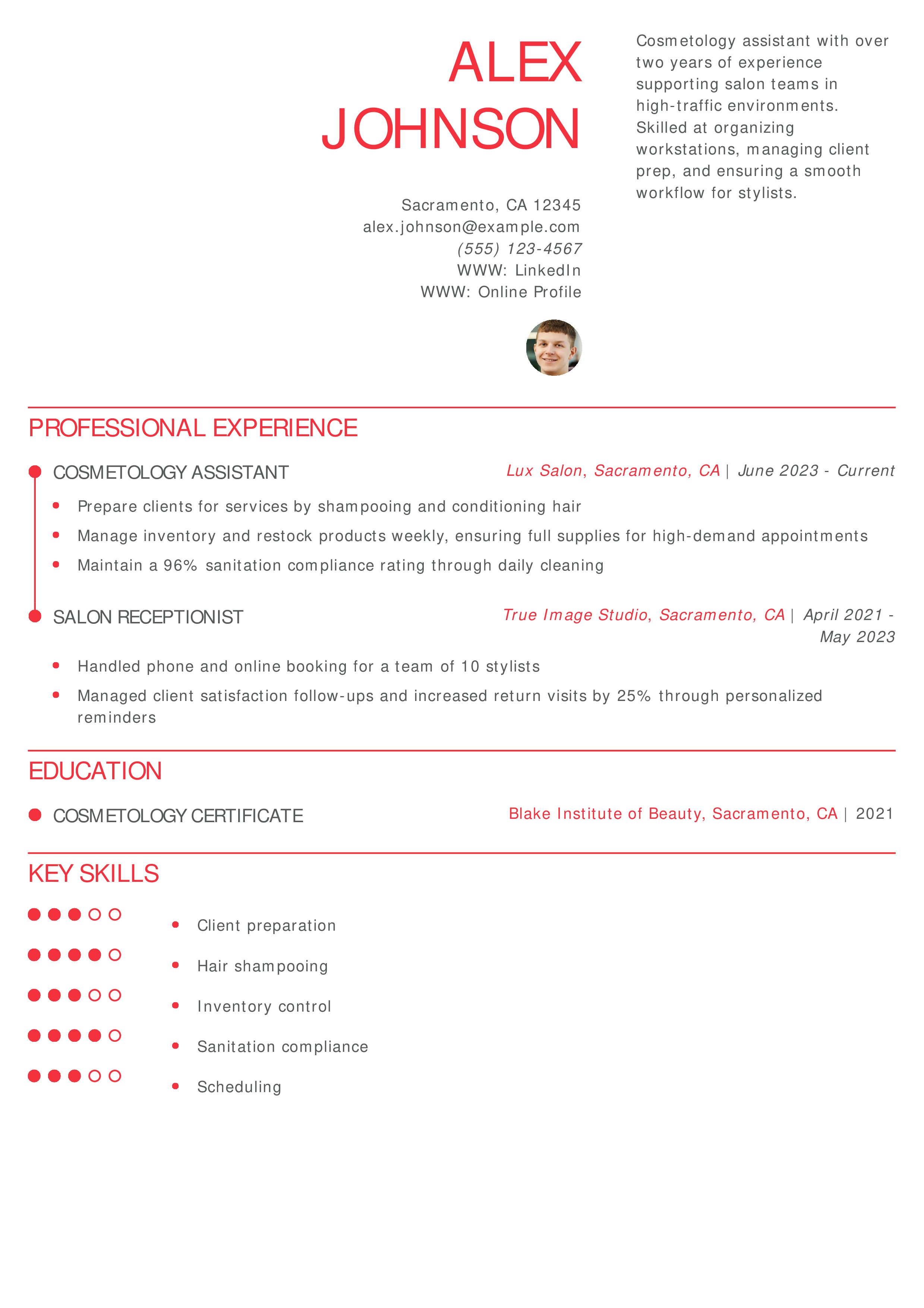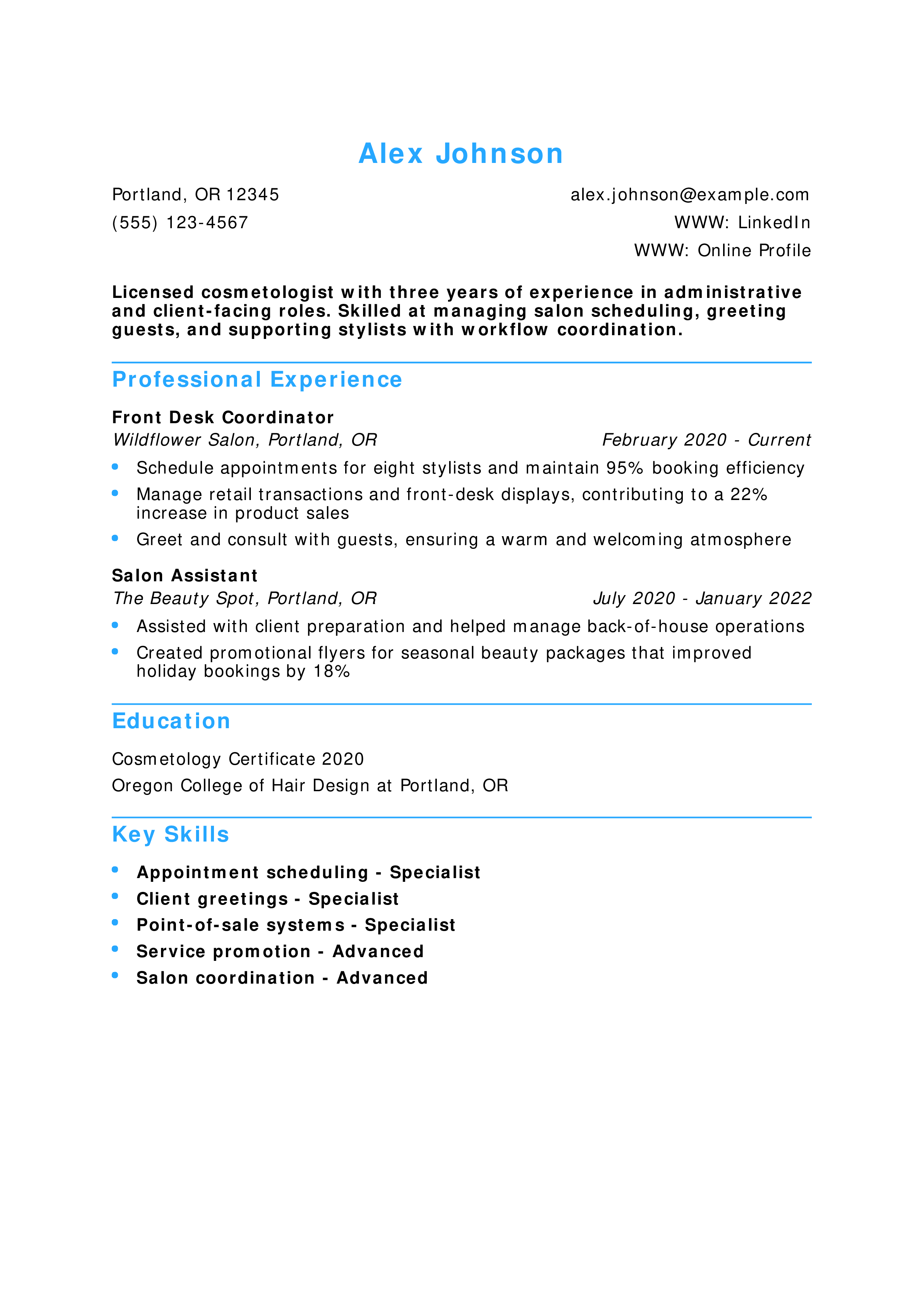 This resume highlights cosmetology training and front-desk skills, which are essential in many salons. It shows organizational talent with clear examples. For tips on balancing soft and technical skills, visit soft skills for a resume.