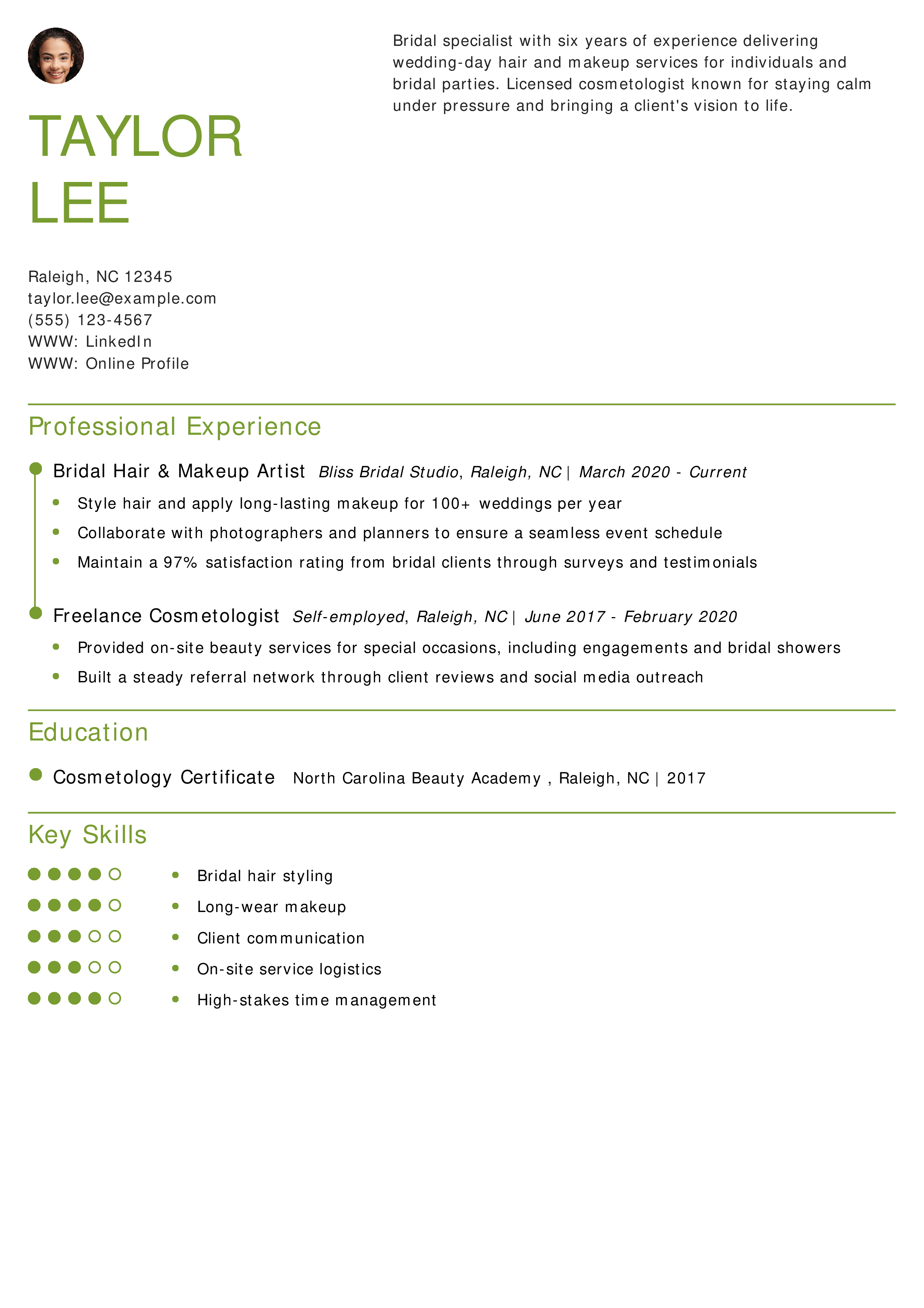 This resume focuses on bridal styling, a niche within cosmetology, and uses strong metrics to show client satisfaction and demand. For more advice on showcasing niche work, read how to list references on a resume.