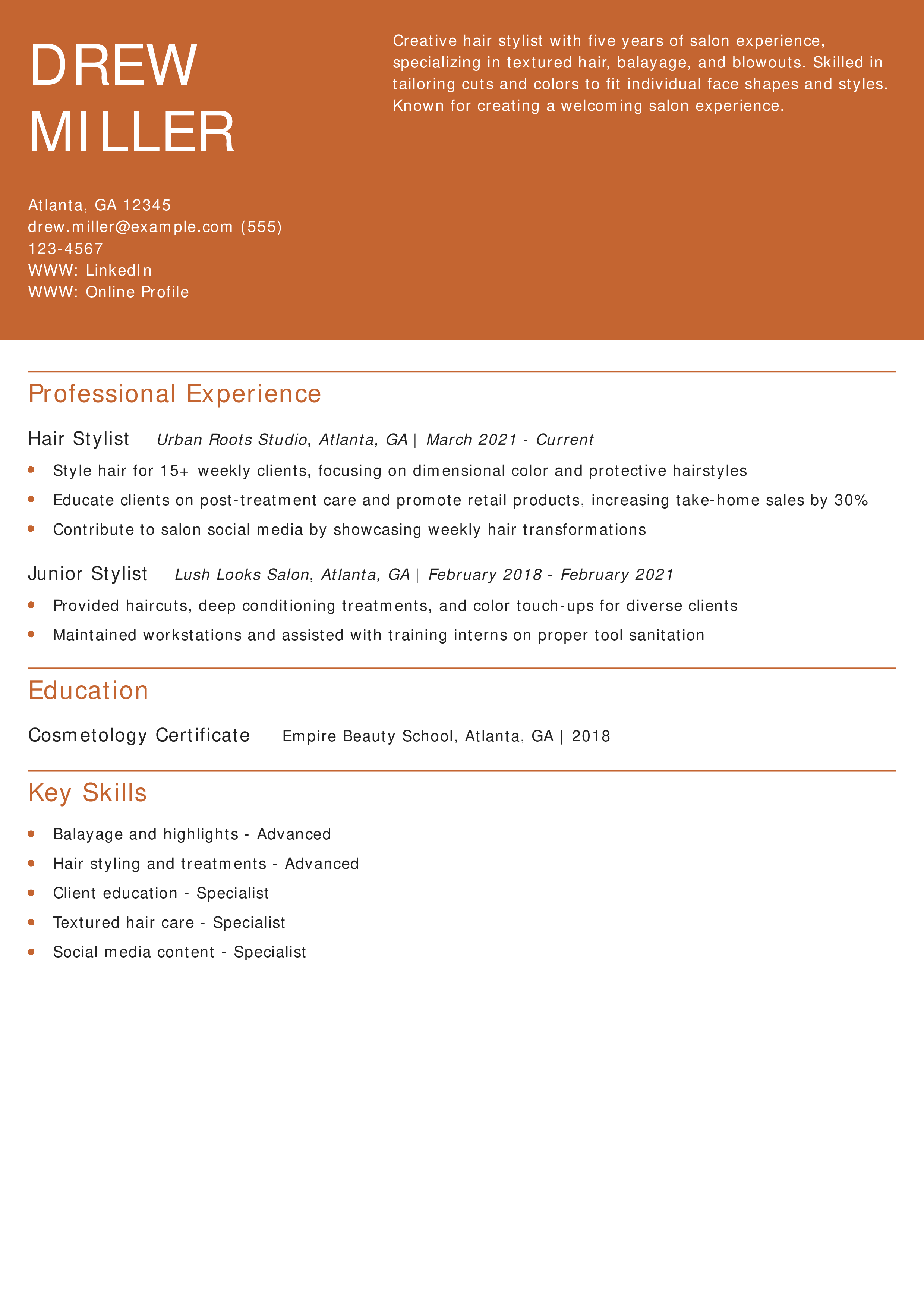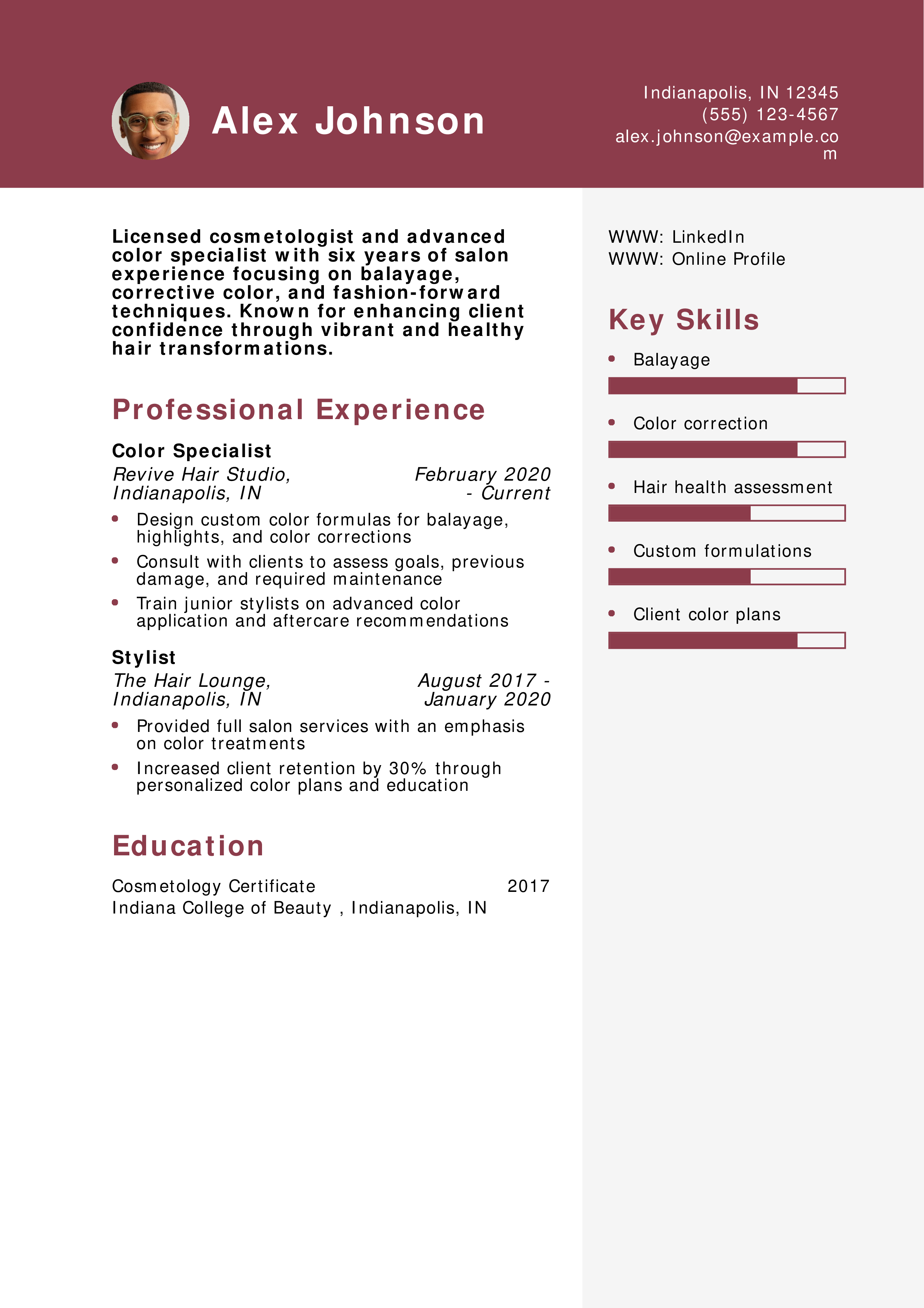 This resume is tailored for a stylist focused on hair color. The metrics and mentorship experience add depth and credibility. For more on highlighting a technical specialty, visit technical skills for a resume.