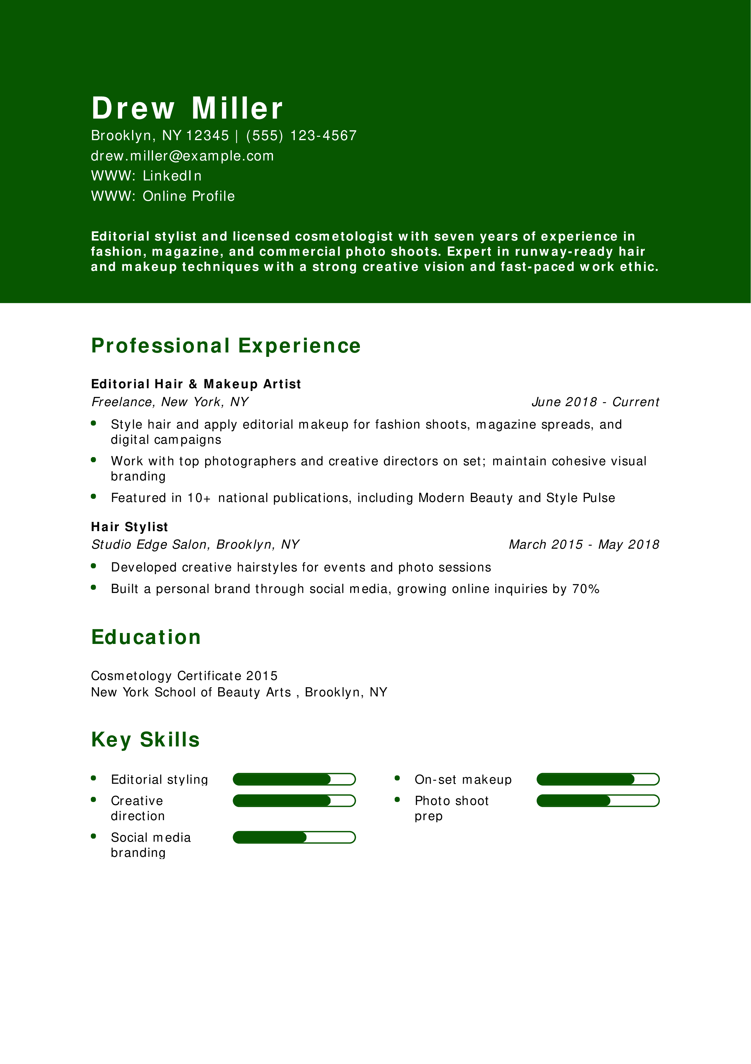 This resume blends technical skills with artistic creativity, perfect for stylists pursuing fashion or media work. It highlights published experience and branding efforts. Learn how to list creative projects at how to list publications on a resume or CV.