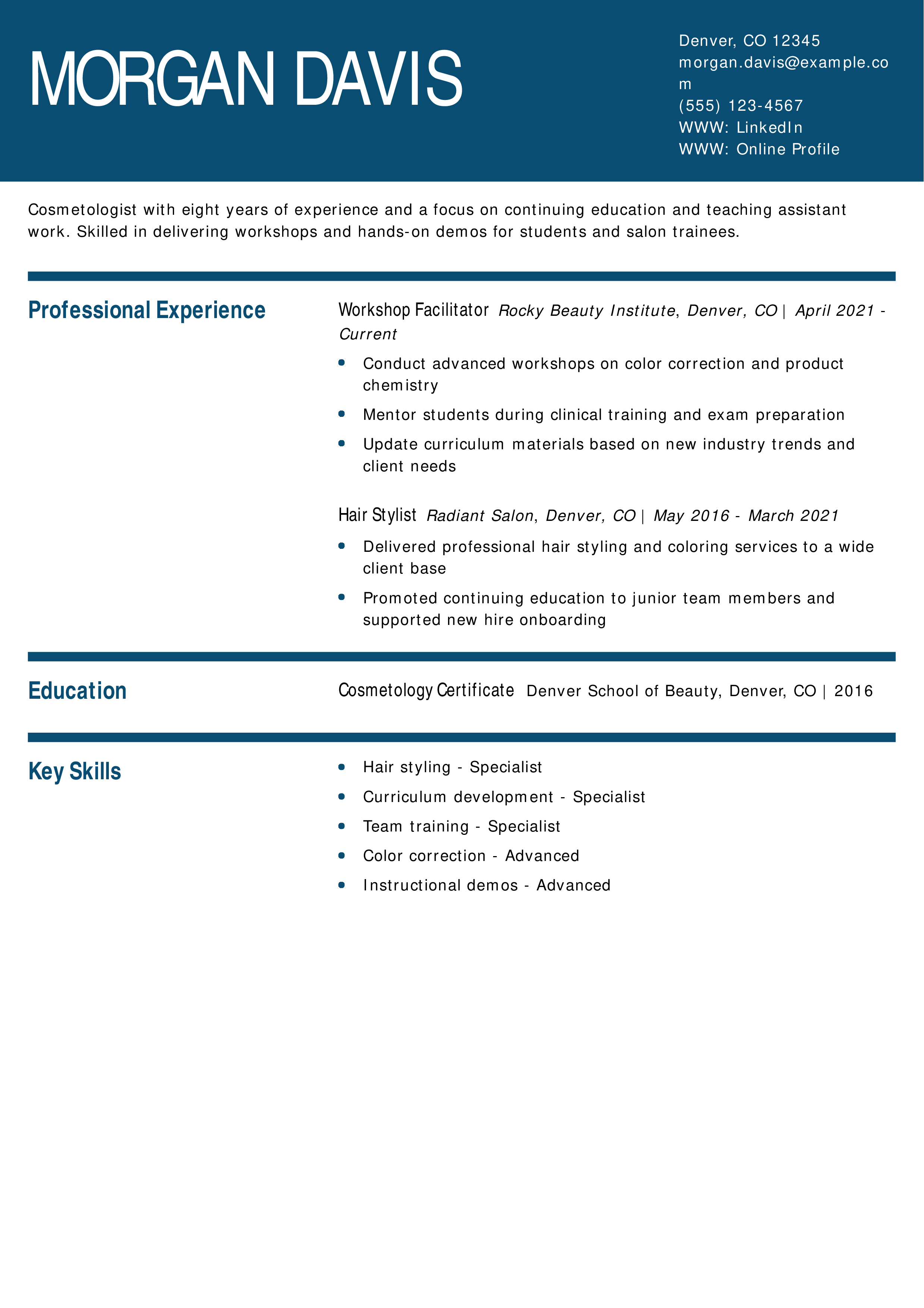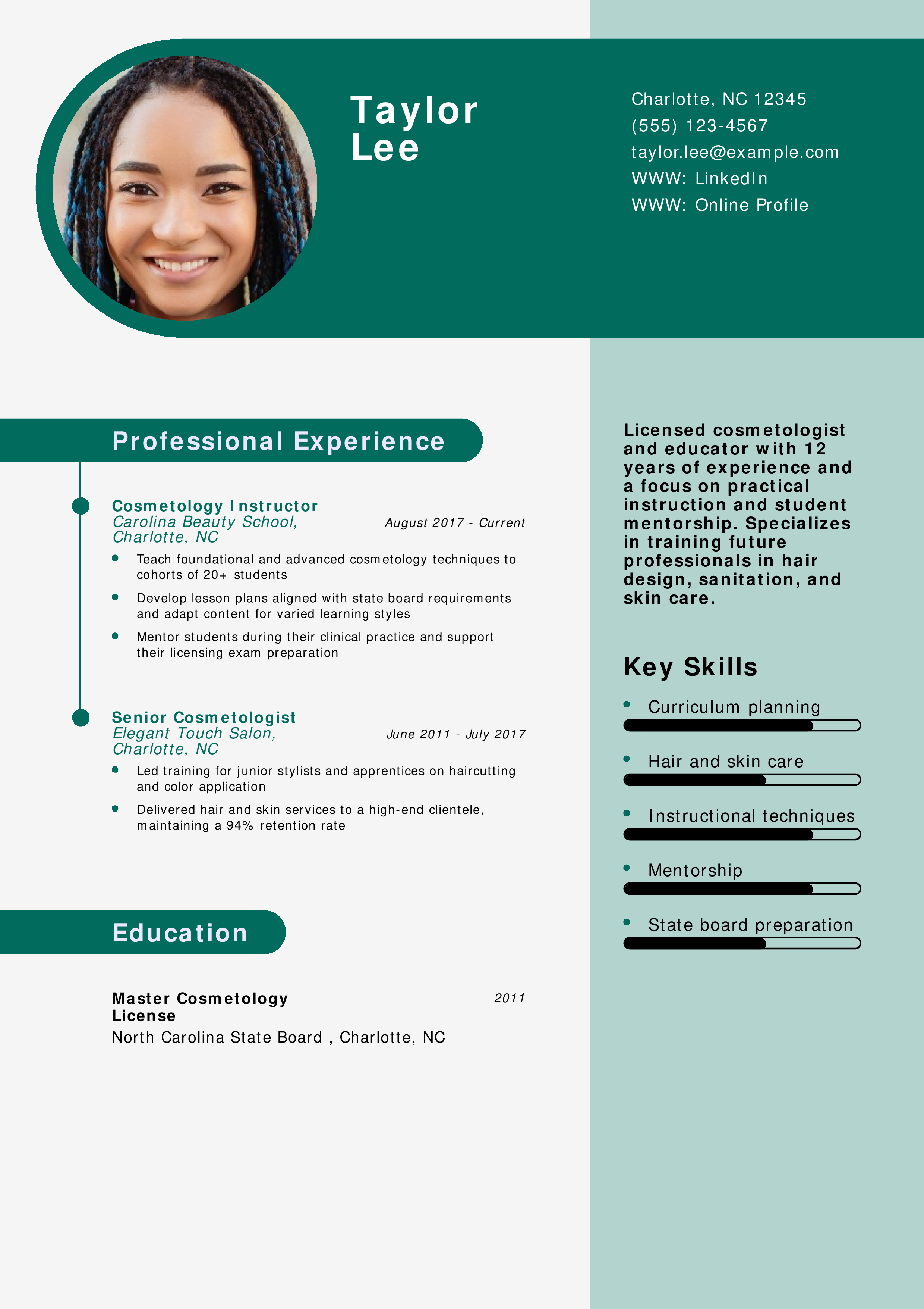 This resume blends experience in both hands-on cosmetology and teaching, showing a dedication to professional growth and education. For more ways to highlight your skills, see resume skills.