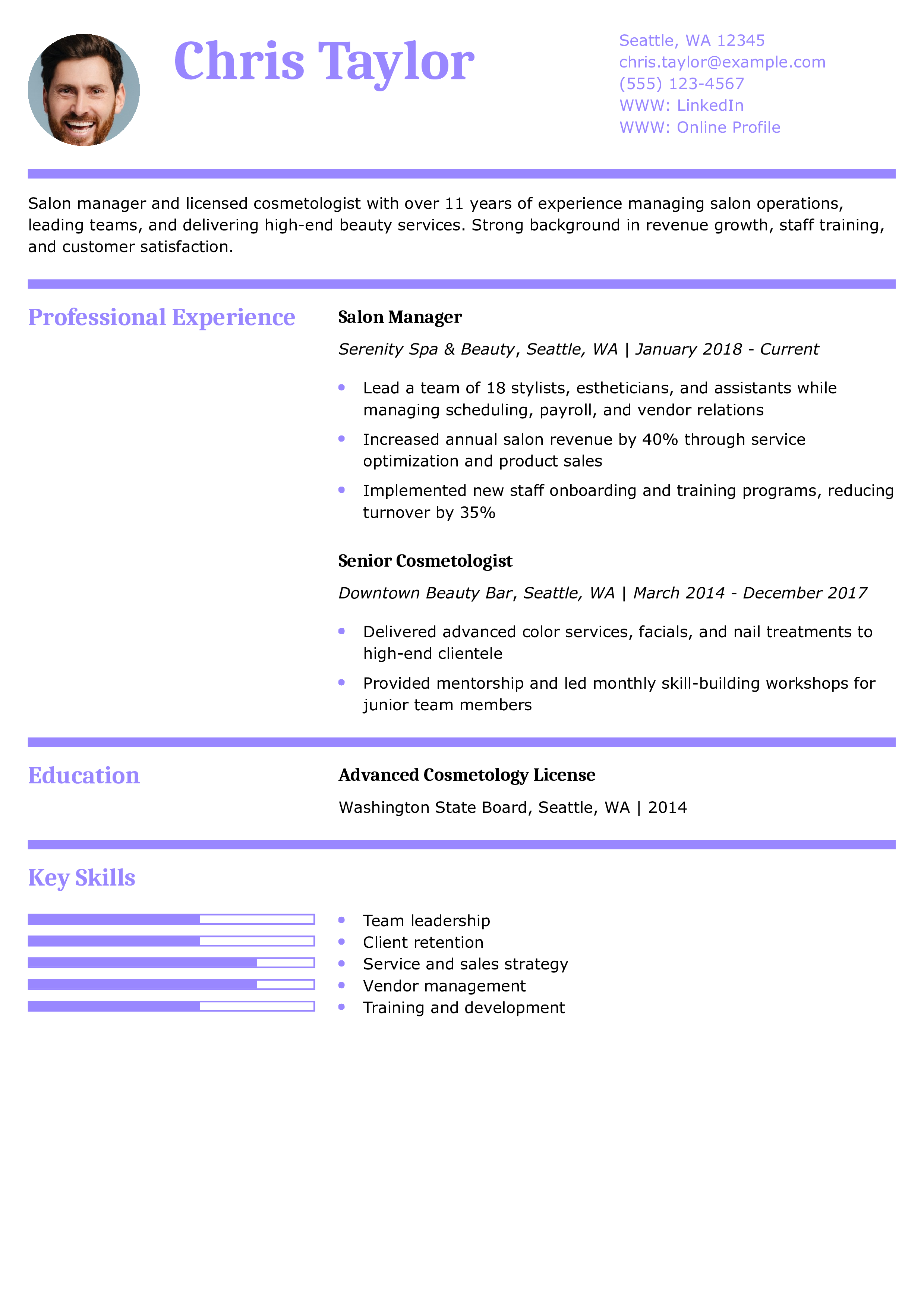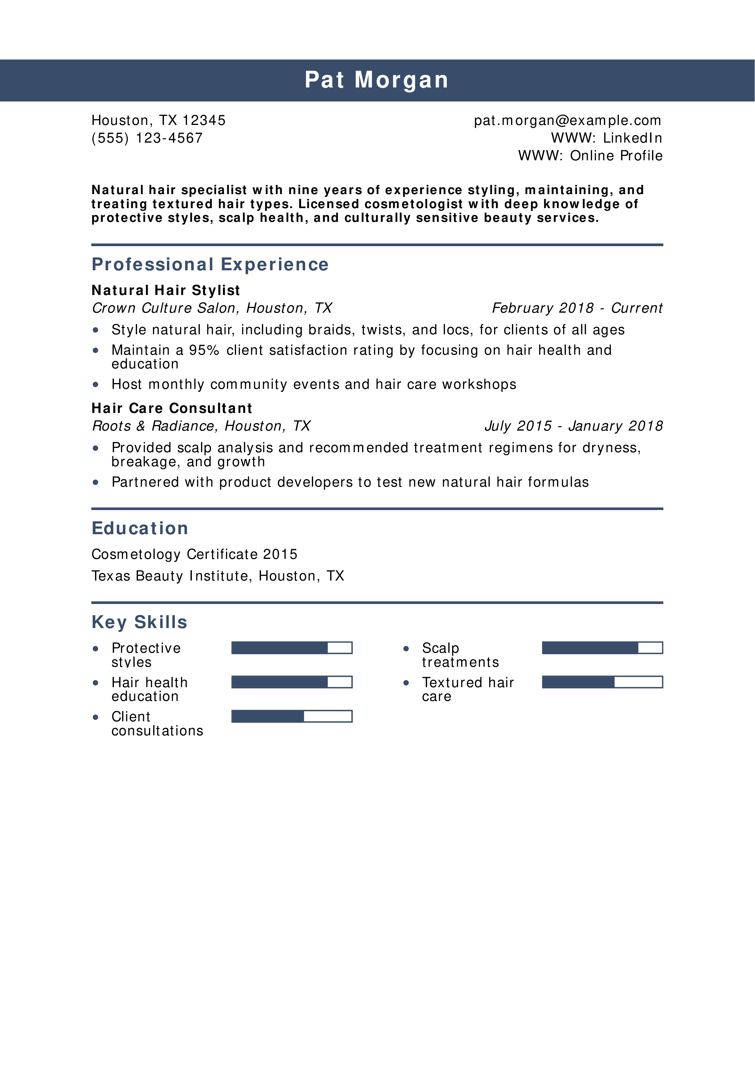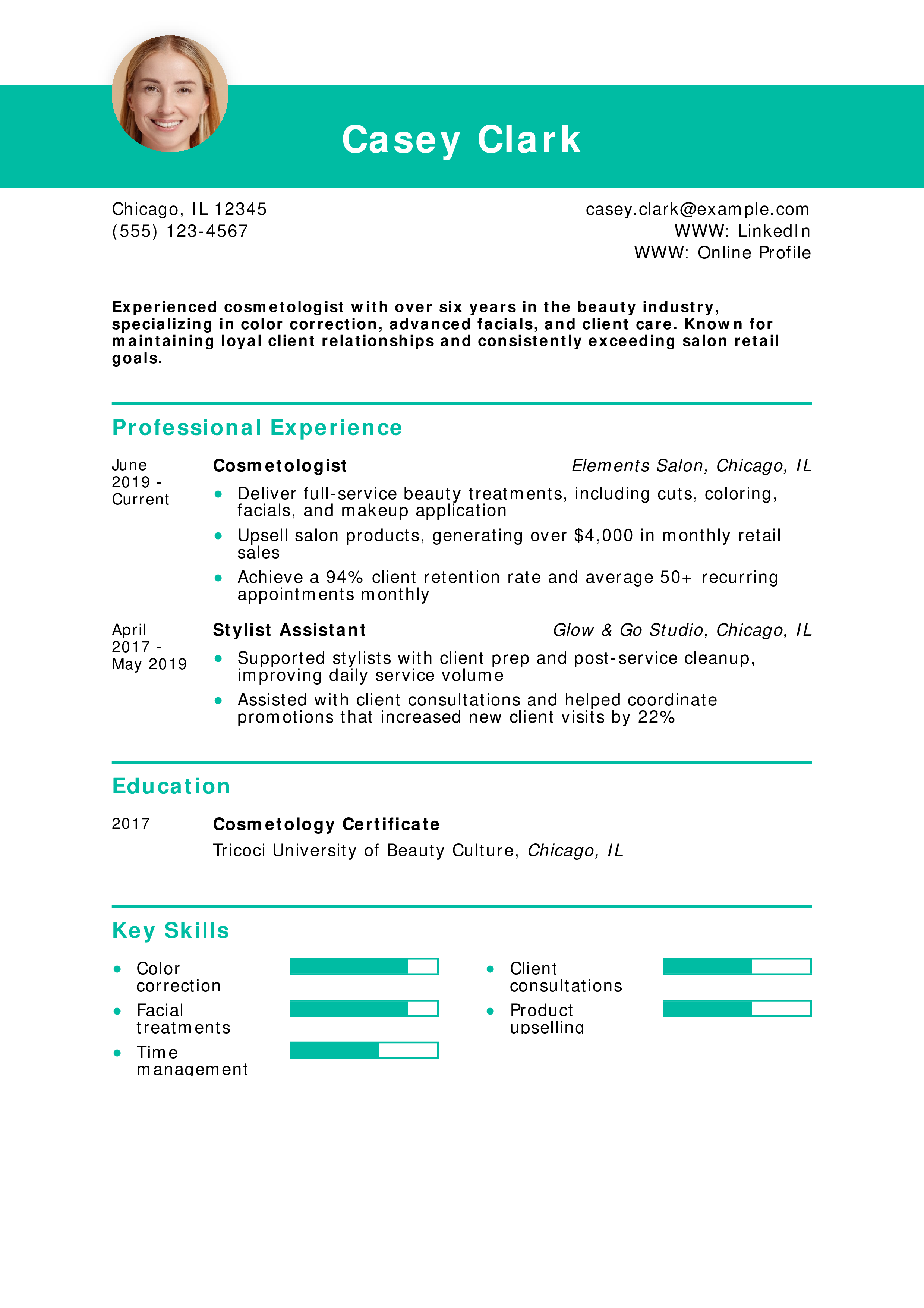 Reverse chronological is the ideal resume format for cosmetologists. This ensures your most recent and relevant experience is featured at the top of your document. It’s generally best to avoid functional resume formats, as skill-based resumes are considered outdated by most recruiters and hiring managers. If you’re at the entry level, flesh out the experience you’ve garnered in your program while pursuing your cosmetology license.