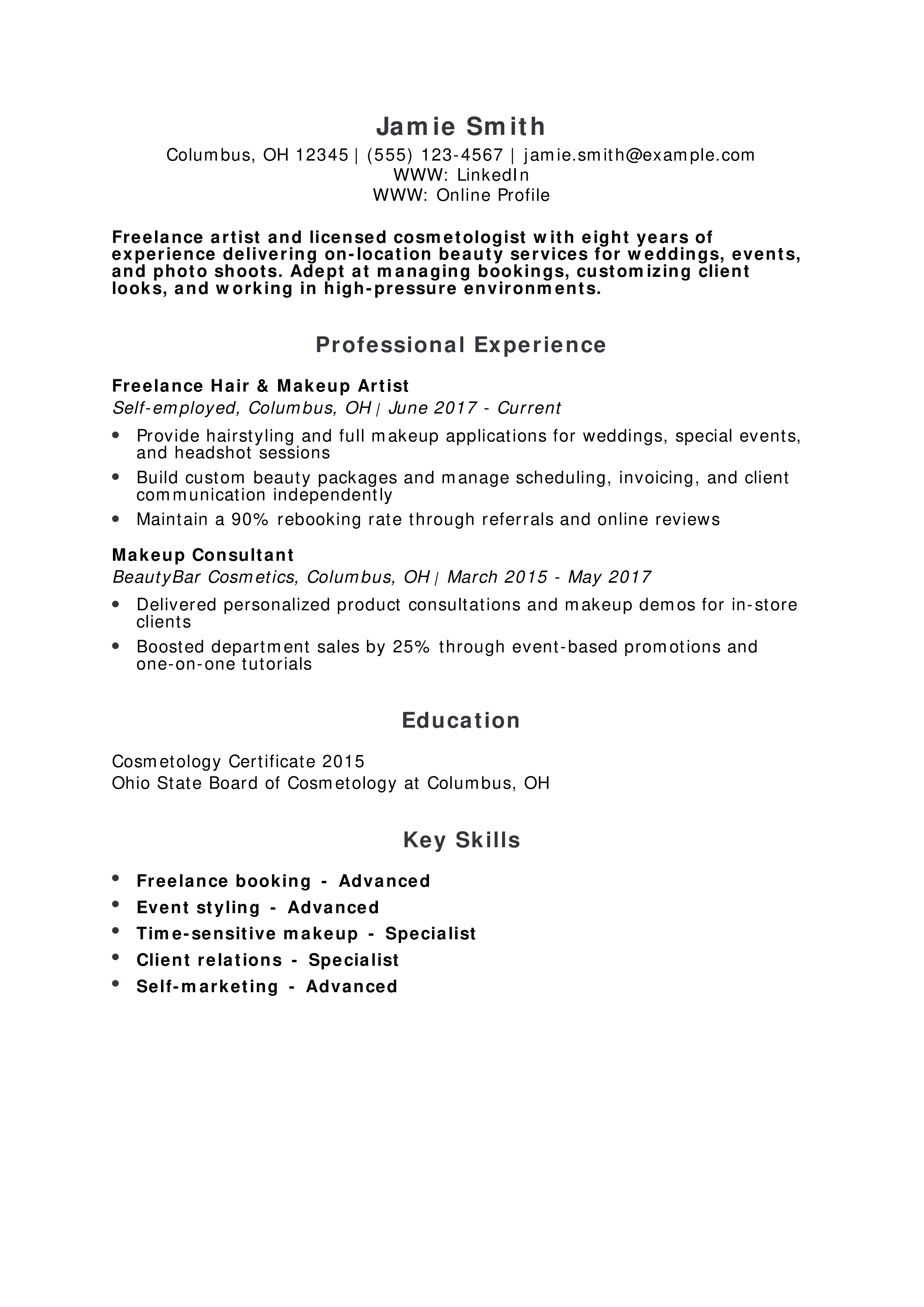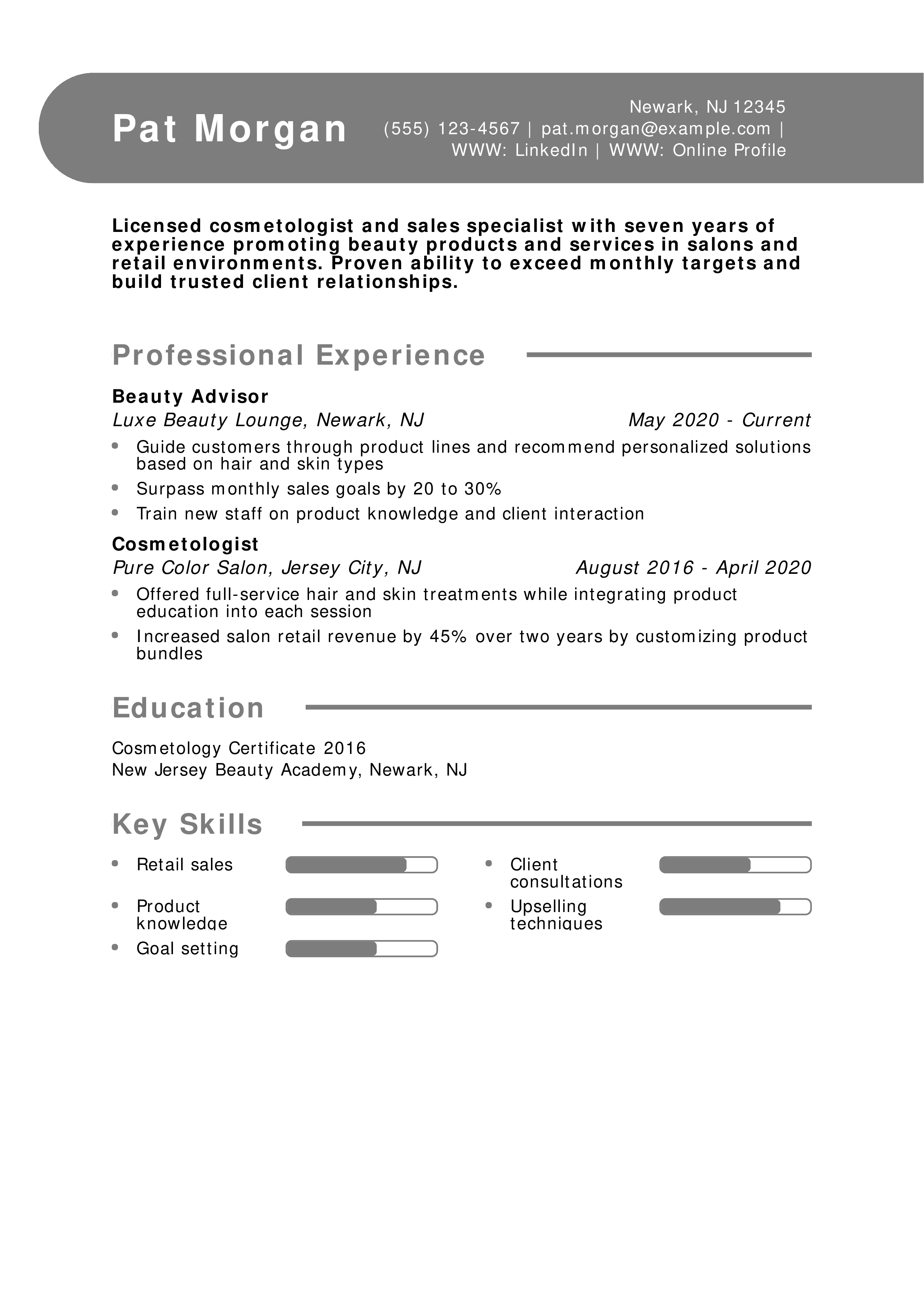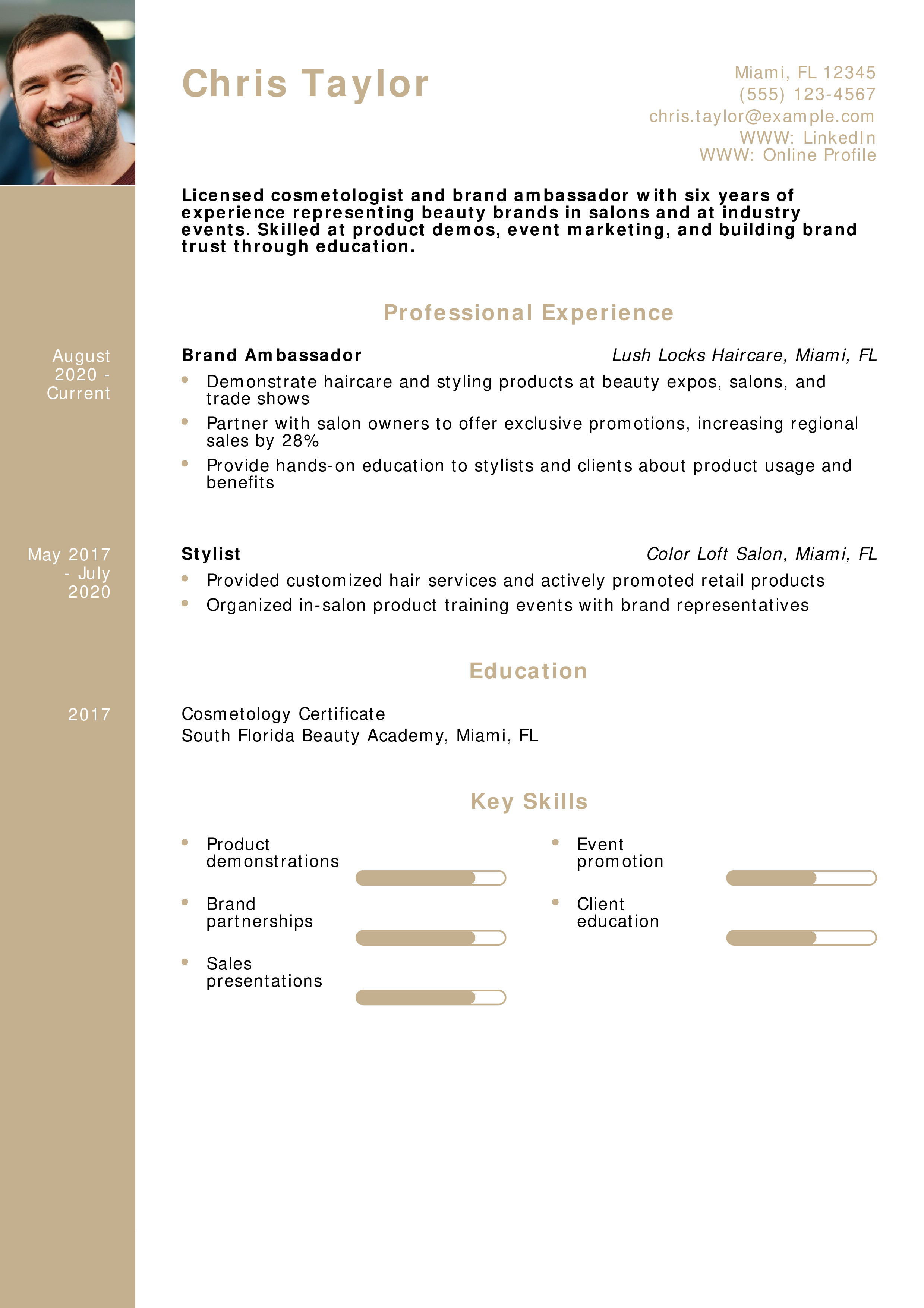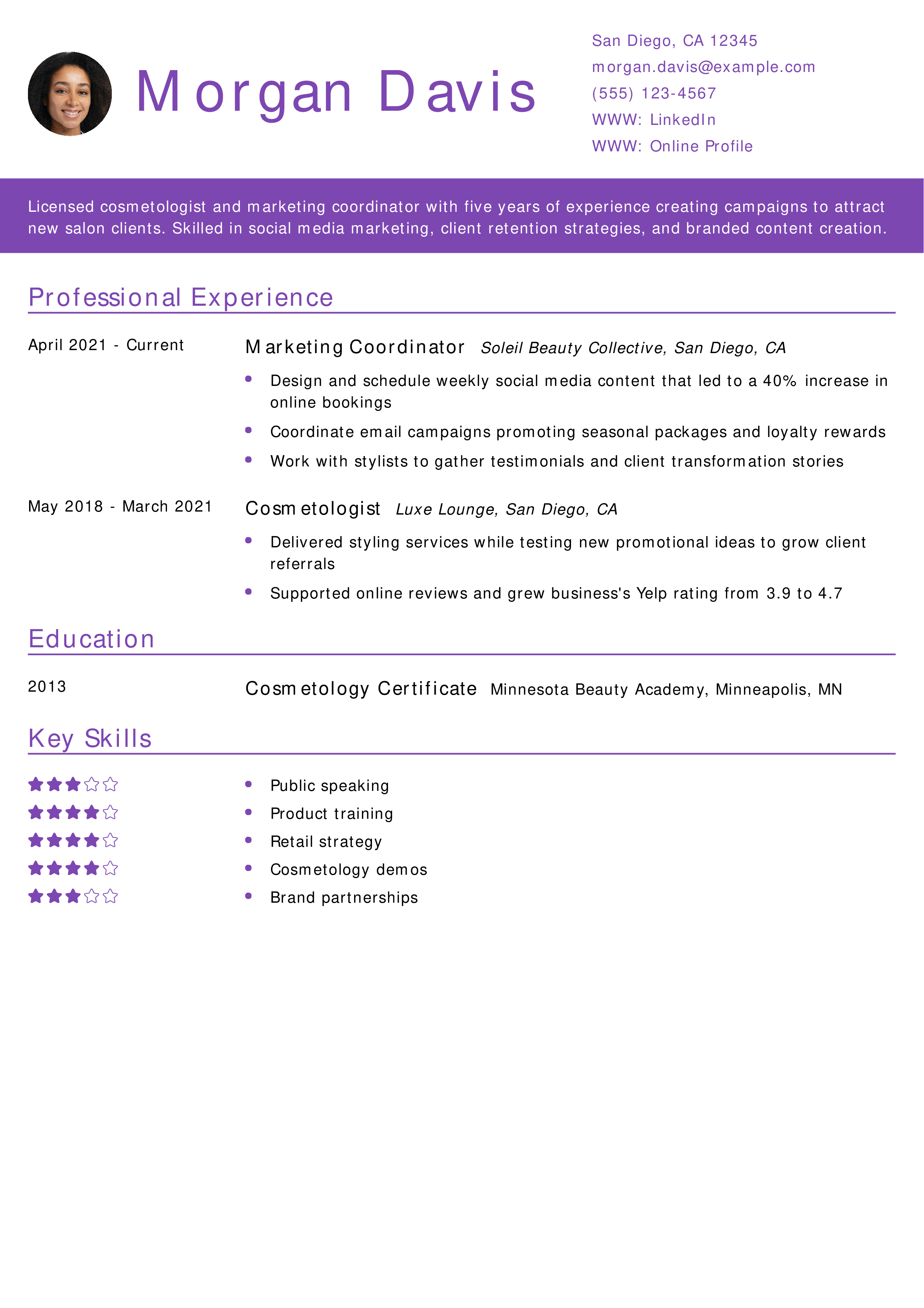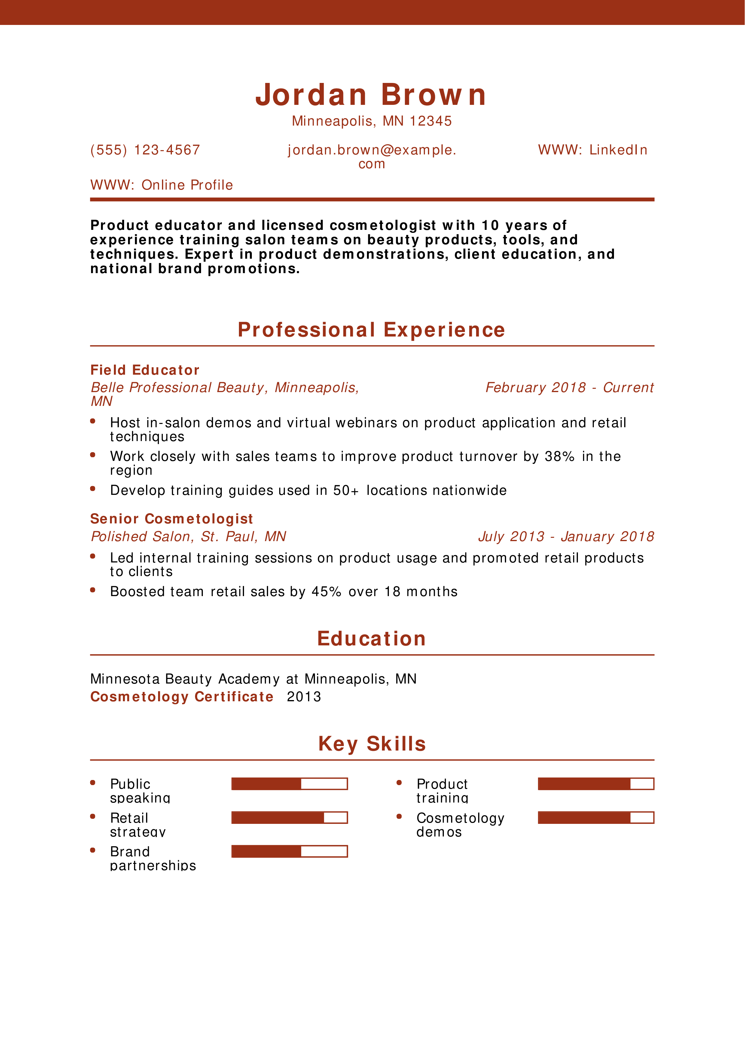 This resume shows how a cosmetologist can evolve into a brand representative role, connecting client service with product marketing. For help showcasing this crossover, visit what to put on a resume.