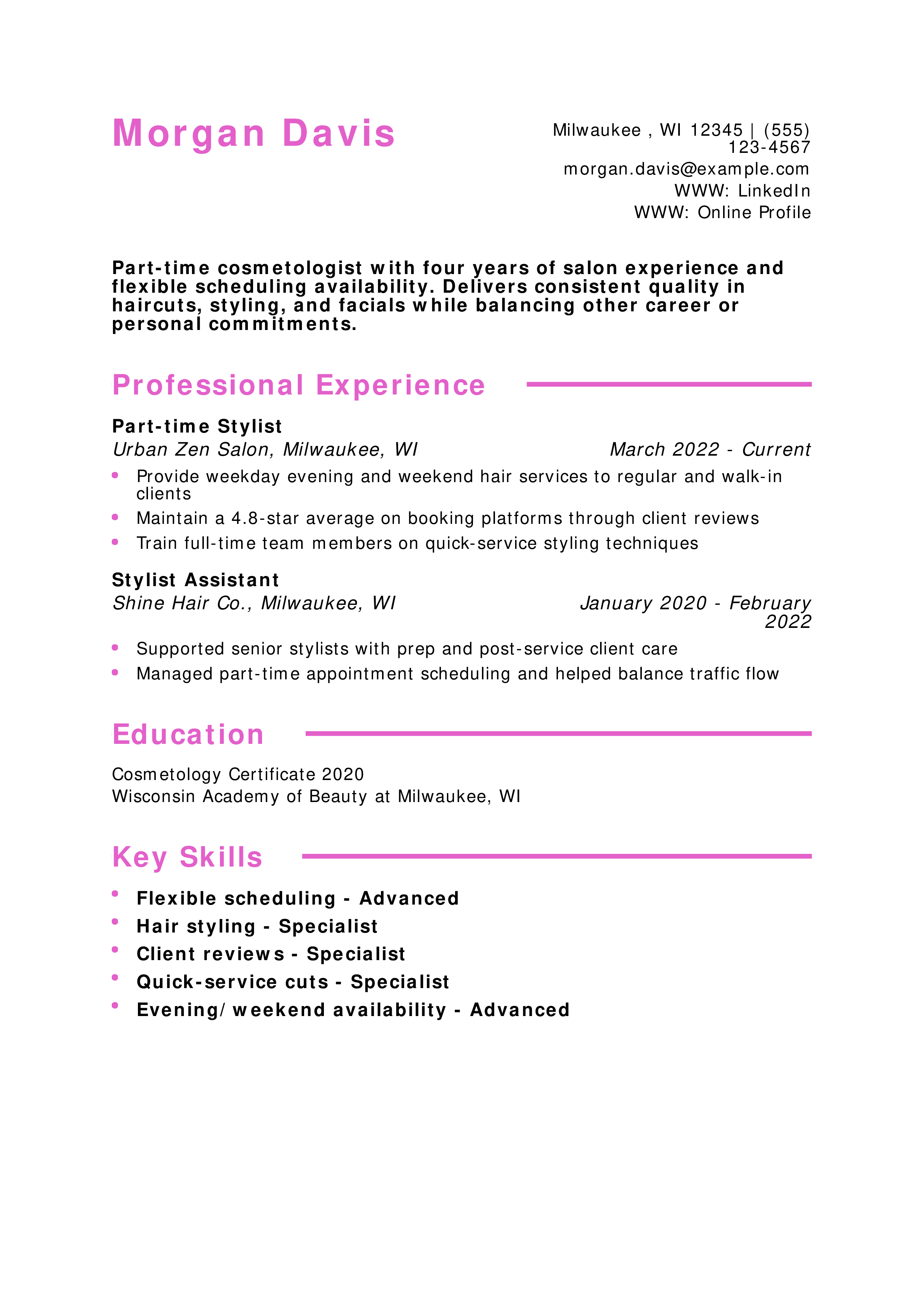 This resume is perfect for someone seeking or maintaining a flexible role. It demonstrates dependability, high service quality, and adaptability. Learn when and how to mention part-time roles in should a resume be one page.